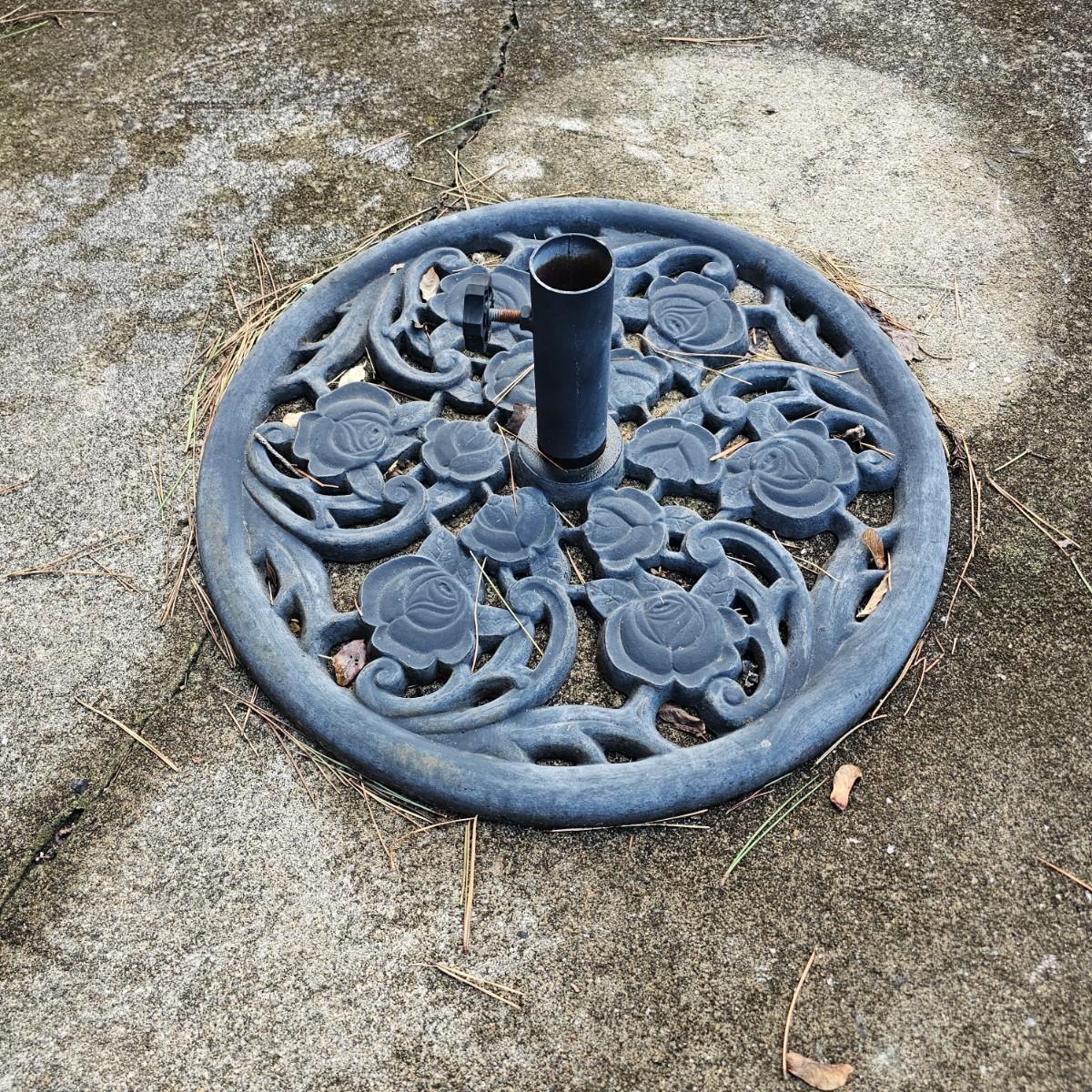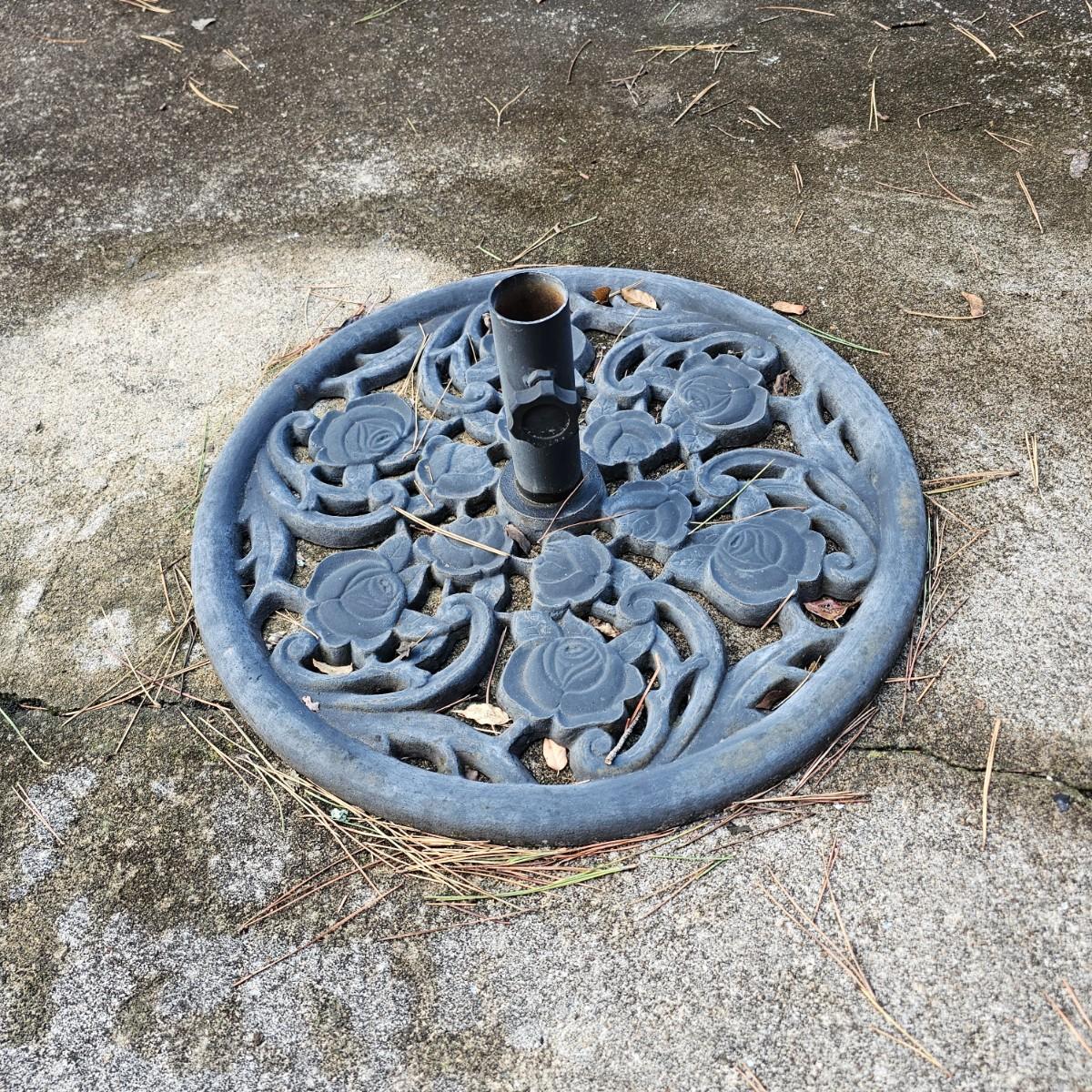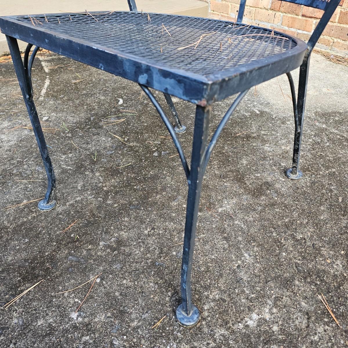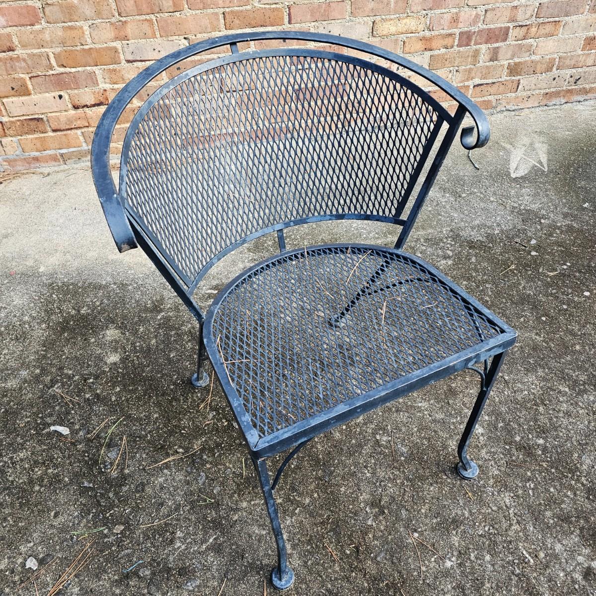 Criss cross open mesh top and chairs with this patio set. Table has open center for umbrella (not included) and measures 48"D x 28"H. Four chairs have curved backs that form arms and are 24.5" x 24" x 29"H, have 16" seat height. Umbrella stand has open weave pattern, measures 19"D x 7"H, has set screw to hold umbrella base. Some rust and wear on all pieces. See photos for details. Local pickup only.