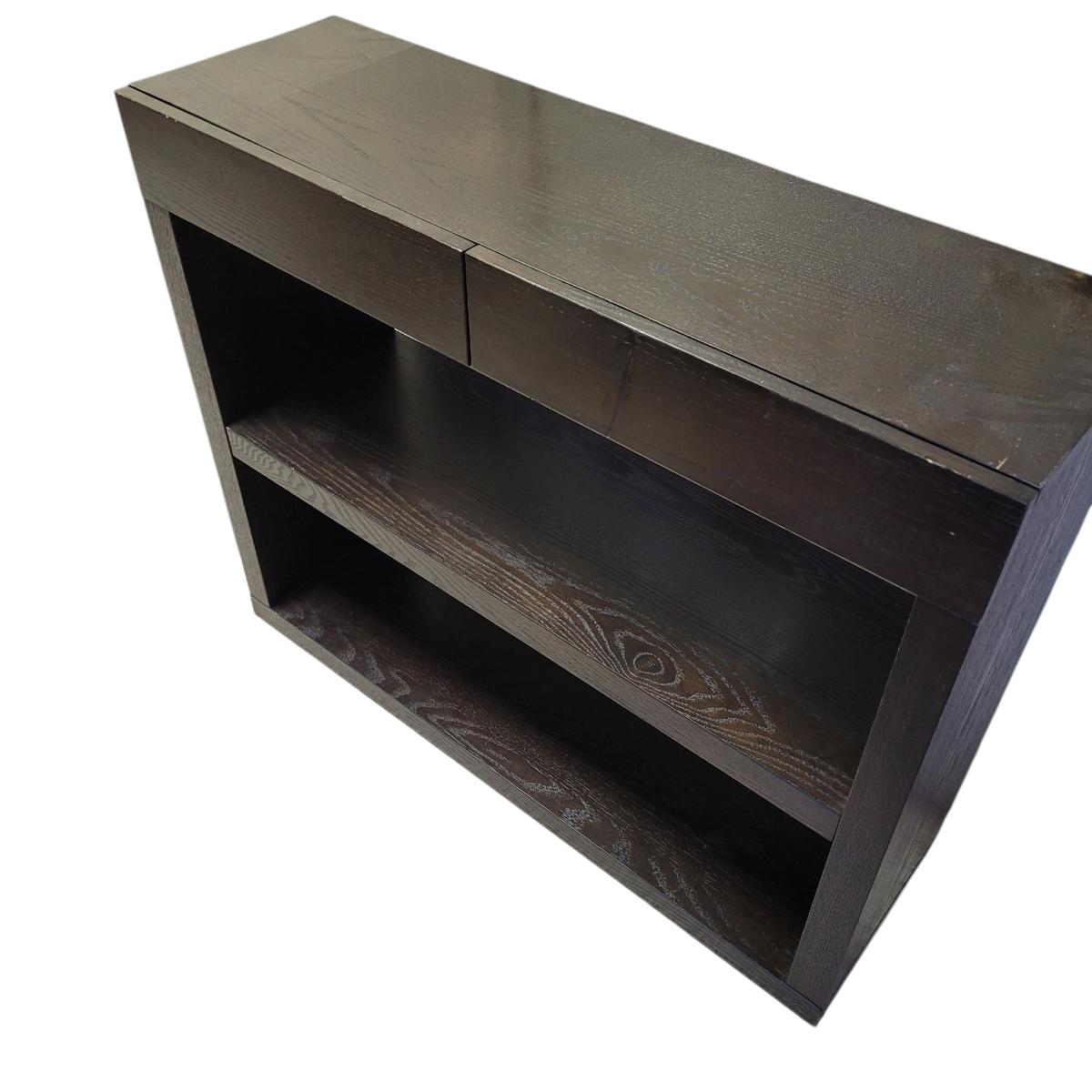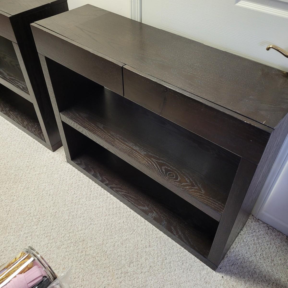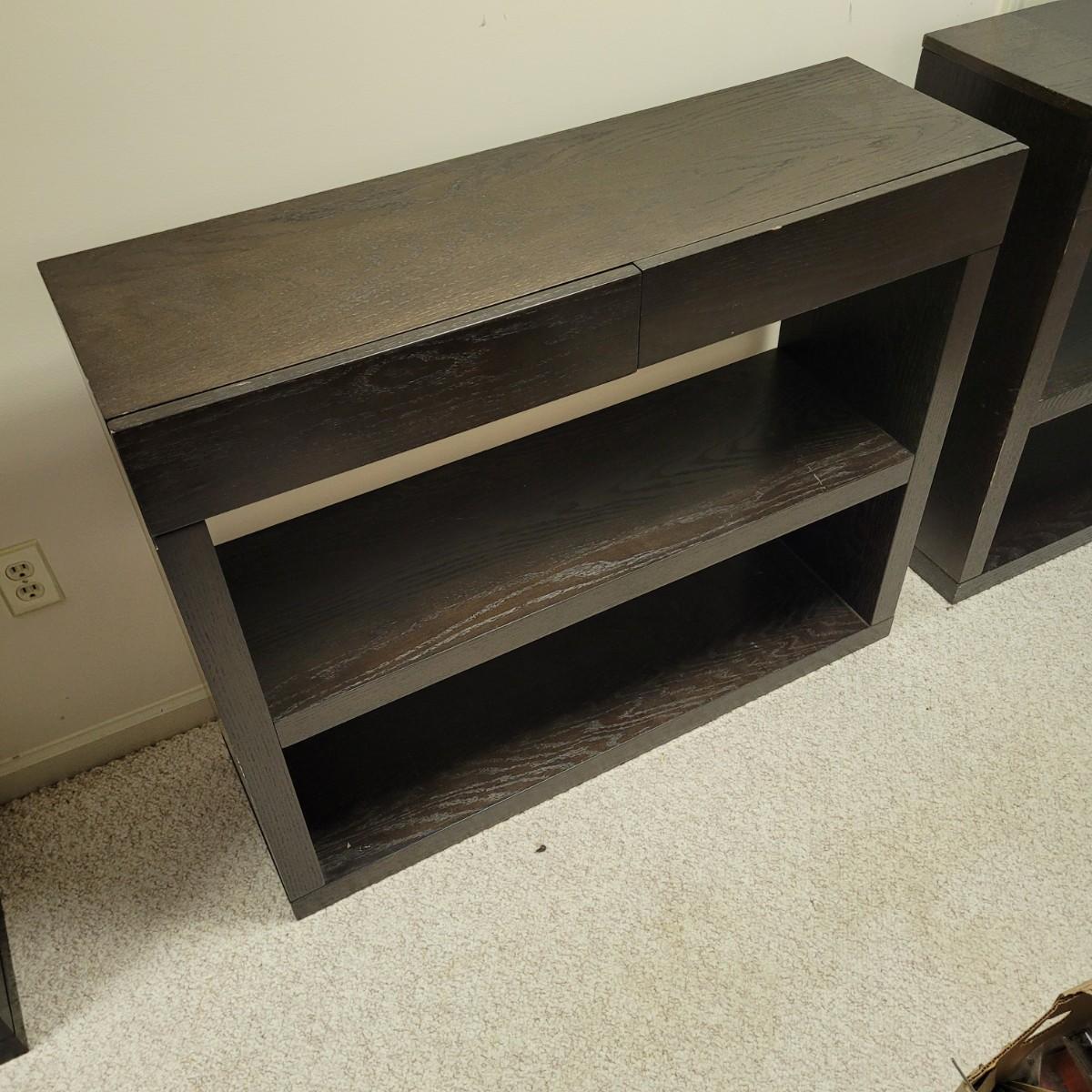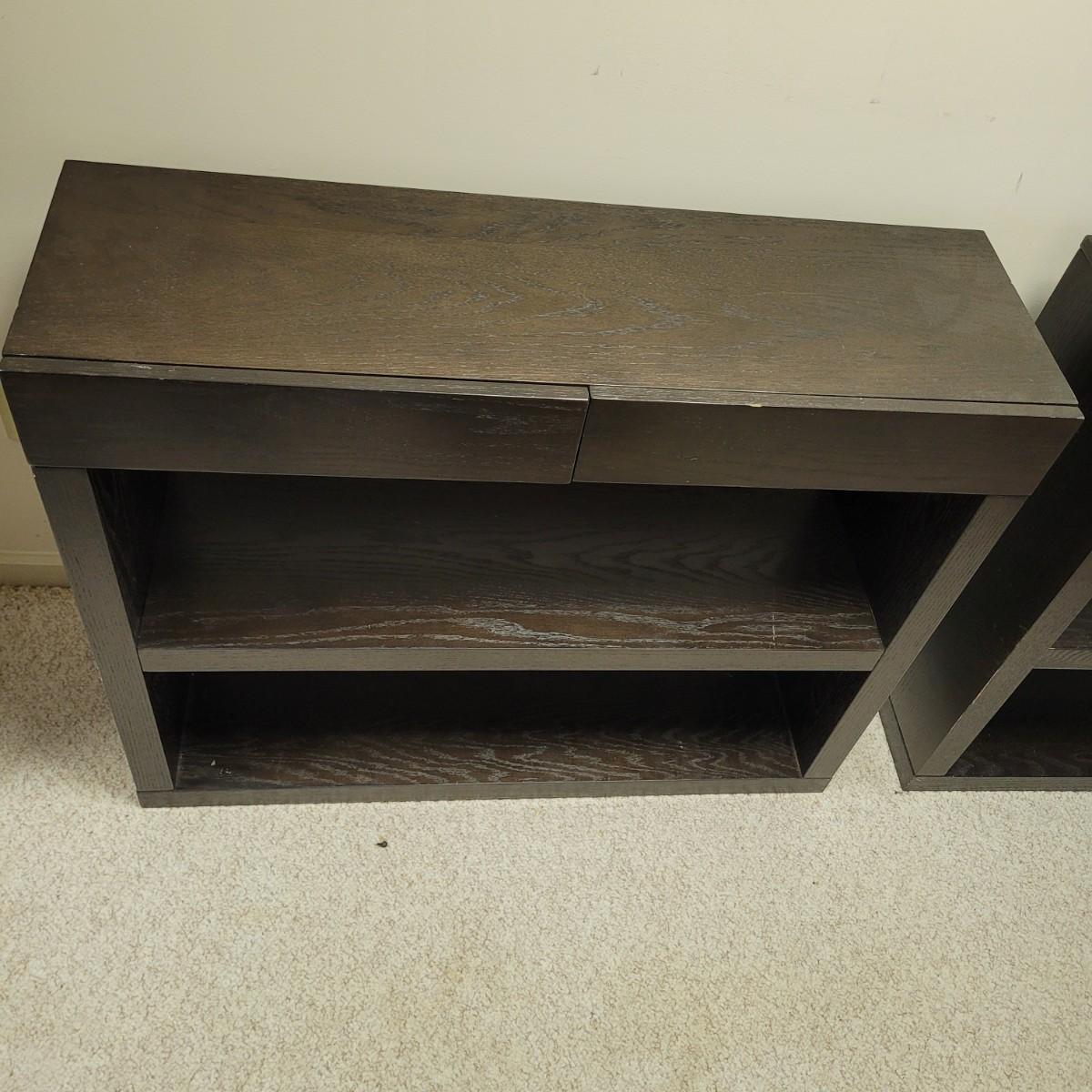 This lot includes two matching wooden storage shelves with drawers. The shelves have two levels of shelving, two sliding drawers, and a flat top surface. They appear to be made from manufactured wood that is made to look like it has a dark stain. Individually, the shelves measure 42" x 13" x 34"H.