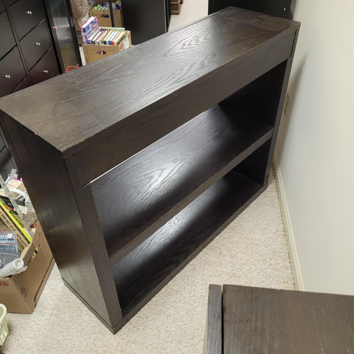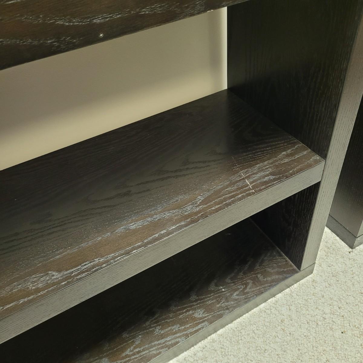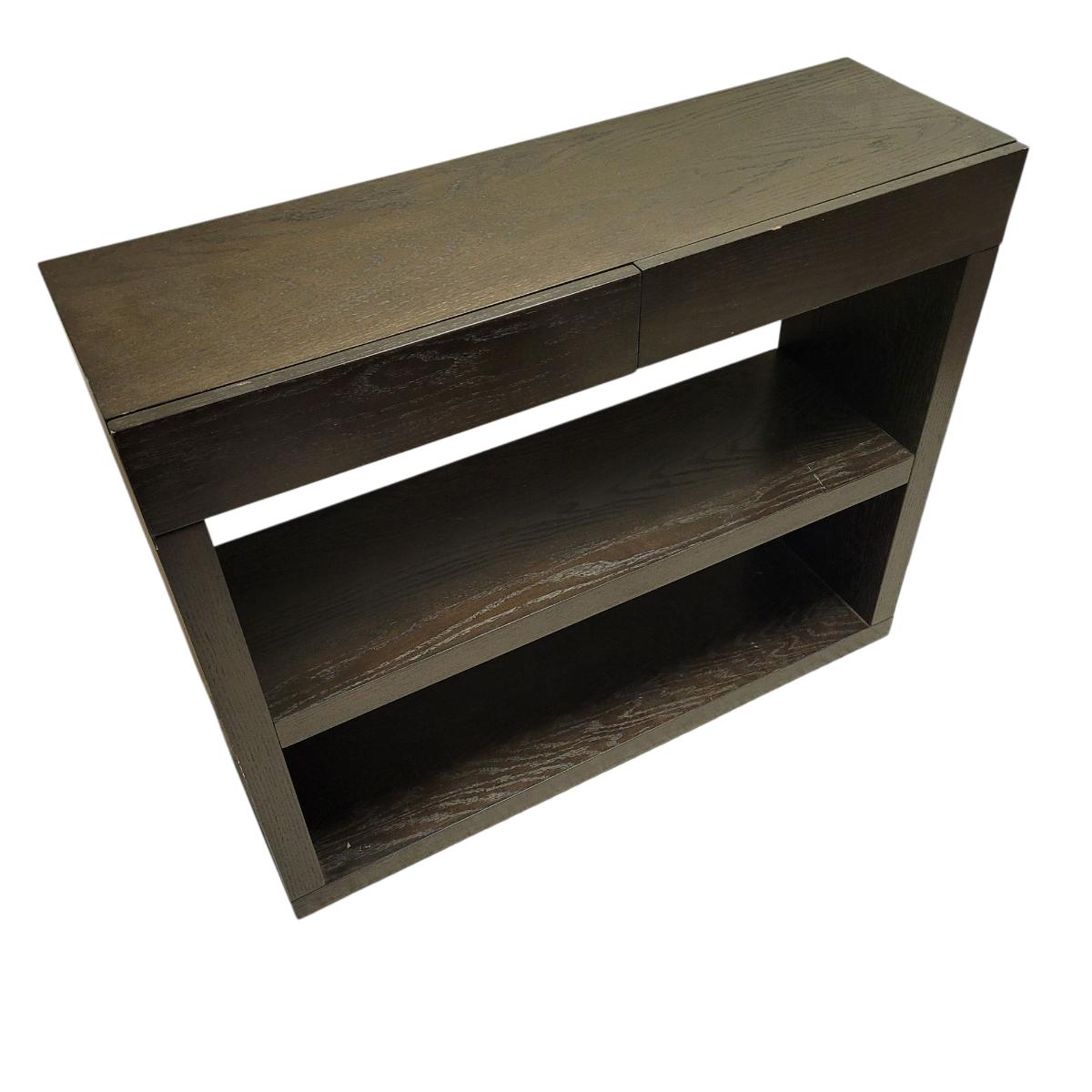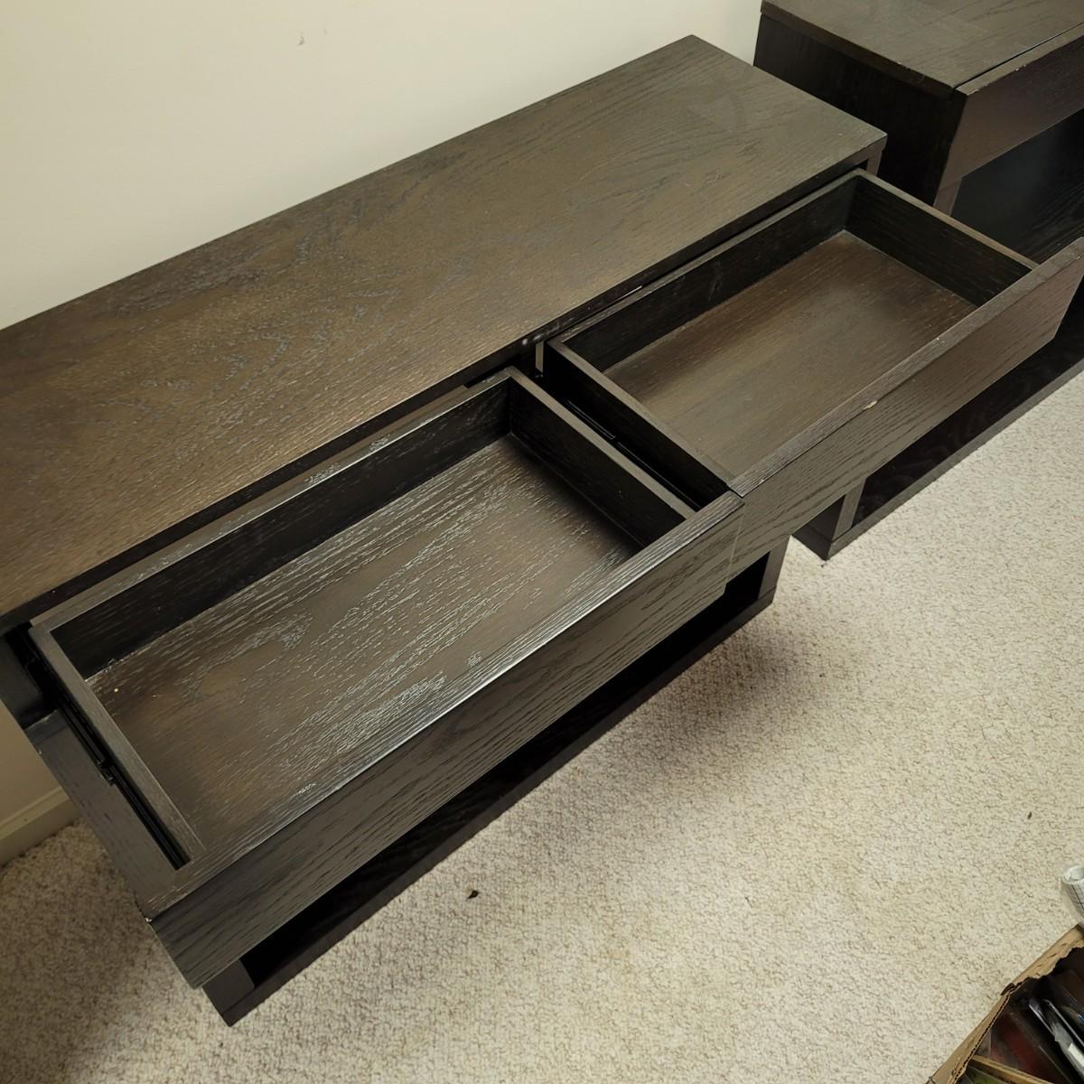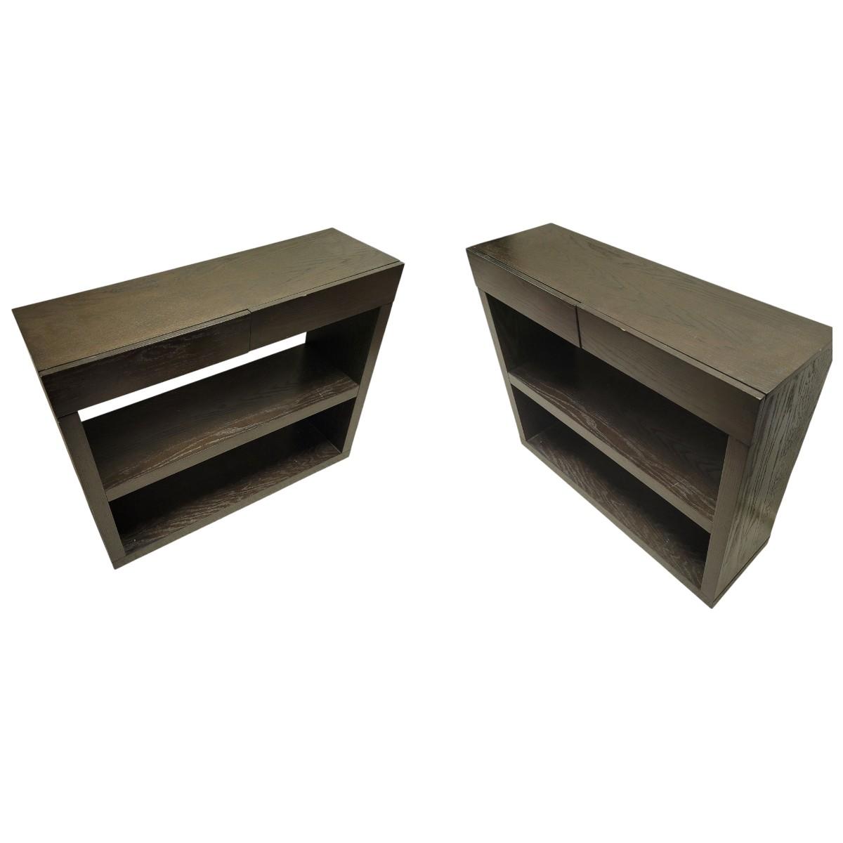 This lot includes two matching wooden storage shelves with drawers. The shelves have two levels of shelving, two sliding drawers, and a flat top surface. They appear to be made from manufactured wood that is made to look like it has a dark stain. Individually, the shelves measure 42" x 13" x 34"H.