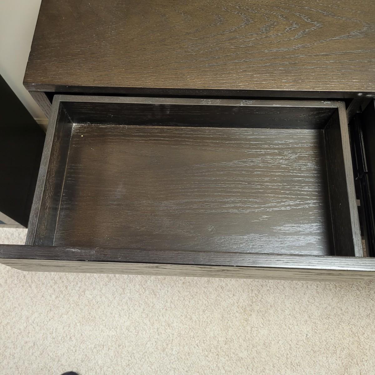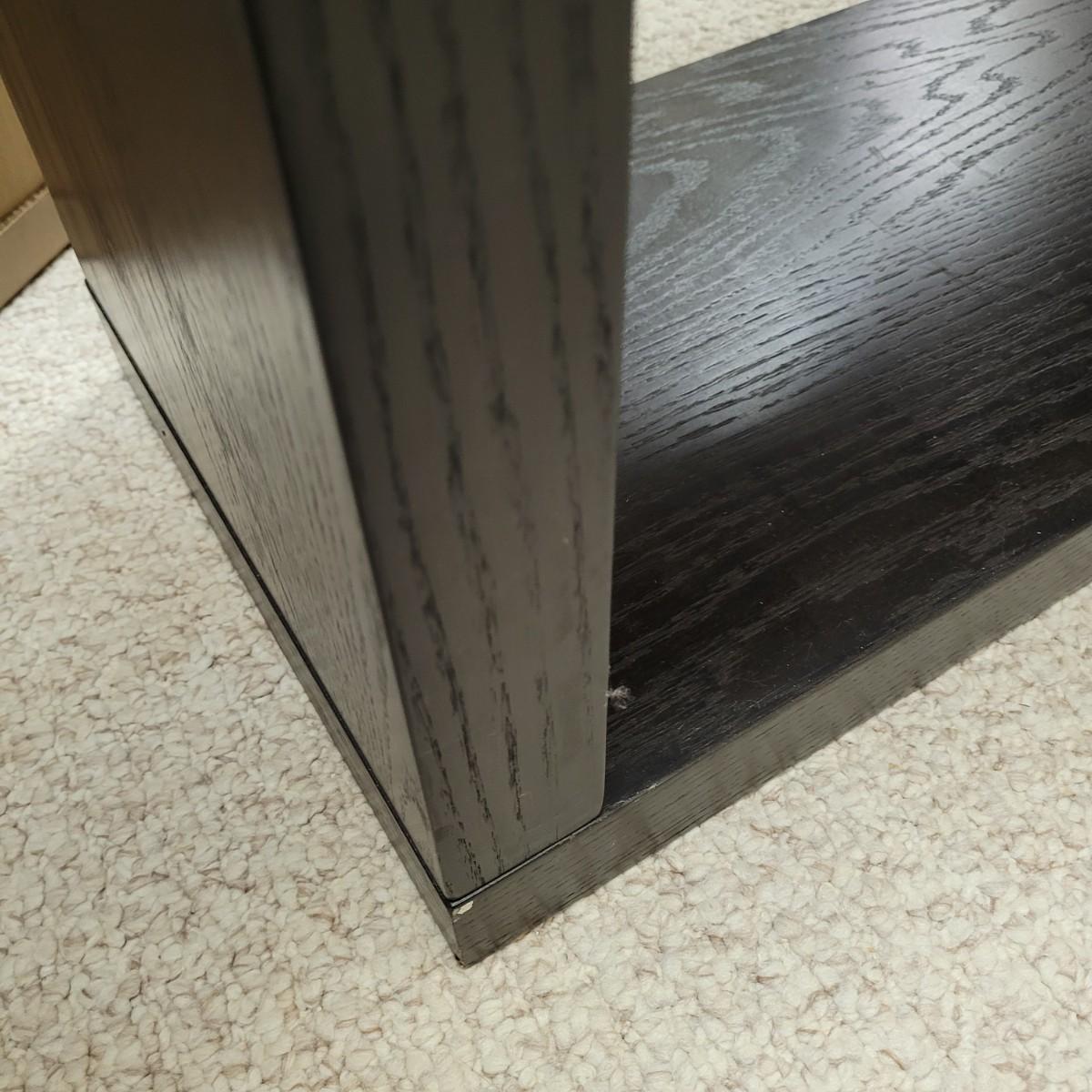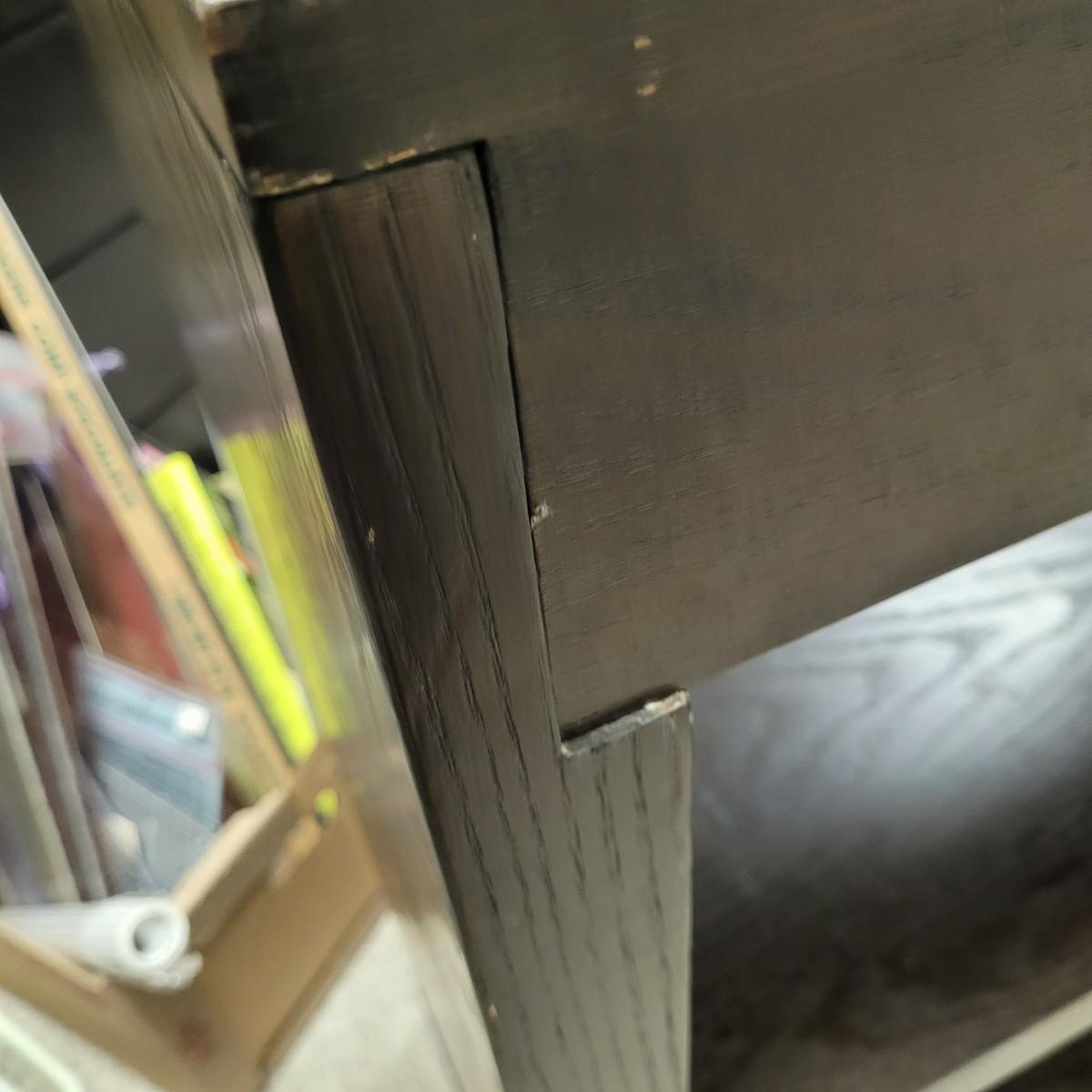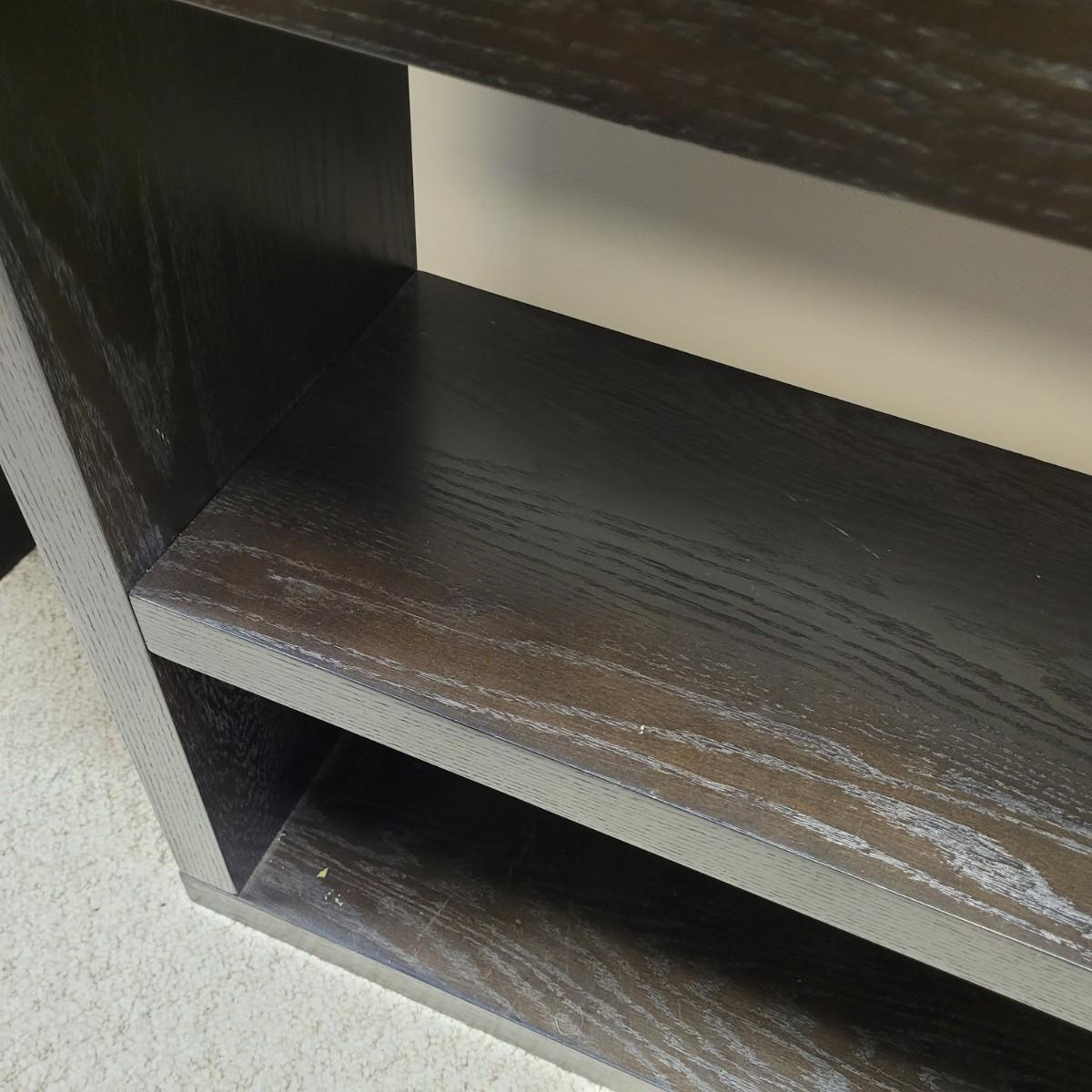 This lot includes two matching wooden storage shelves with drawers. The shelves have two levels of shelving, two sliding drawers, and a flat top surface. They appear to be made from manufactured wood that is made to look like it has a dark stain. Individually, the shelves measure 42" x 13" x 34"H.