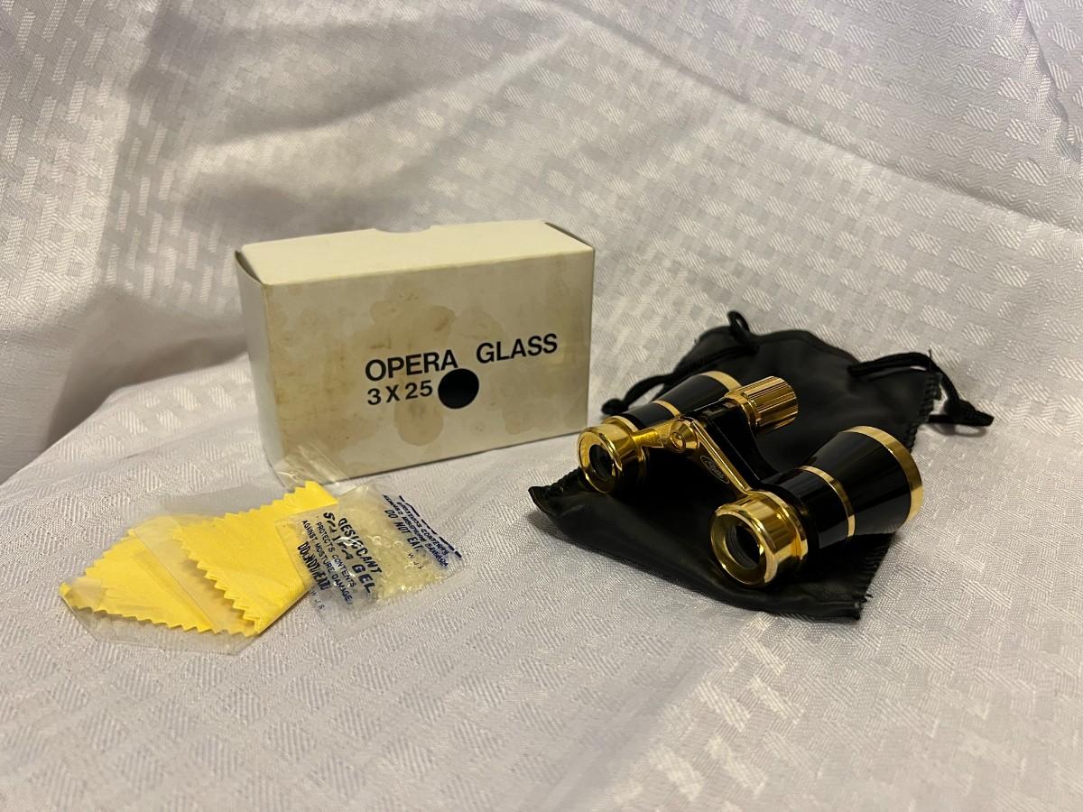 OPERA GLASSES WITH CLEANING WIPE AND PROTECTIVE SLEEVE.