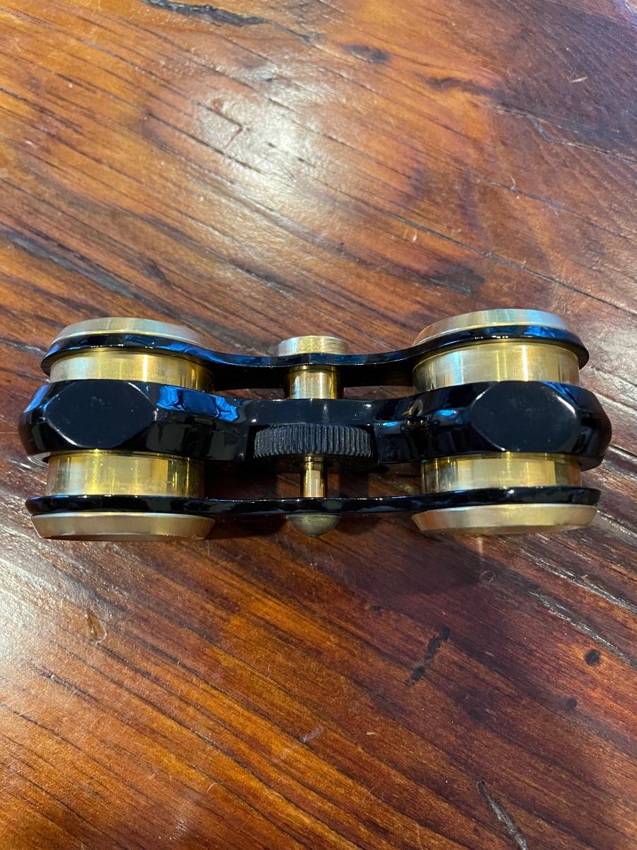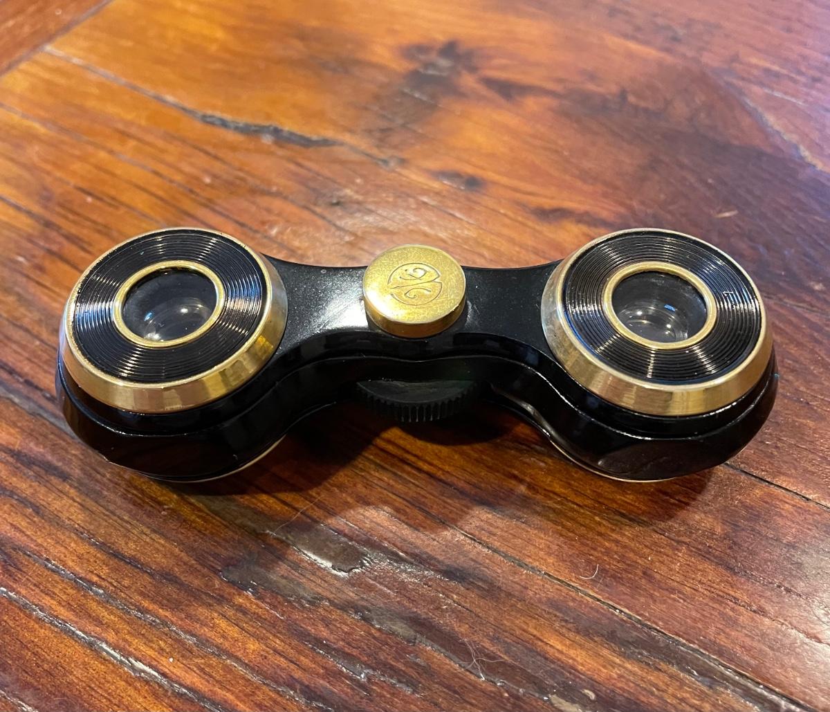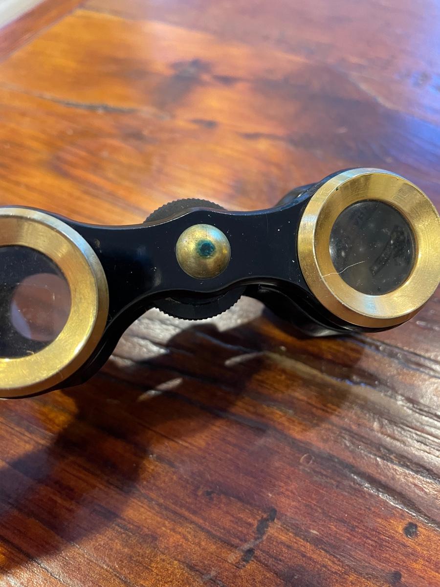 Unsure of the maker. Wristlet case is quite faded, glasses have some wear.