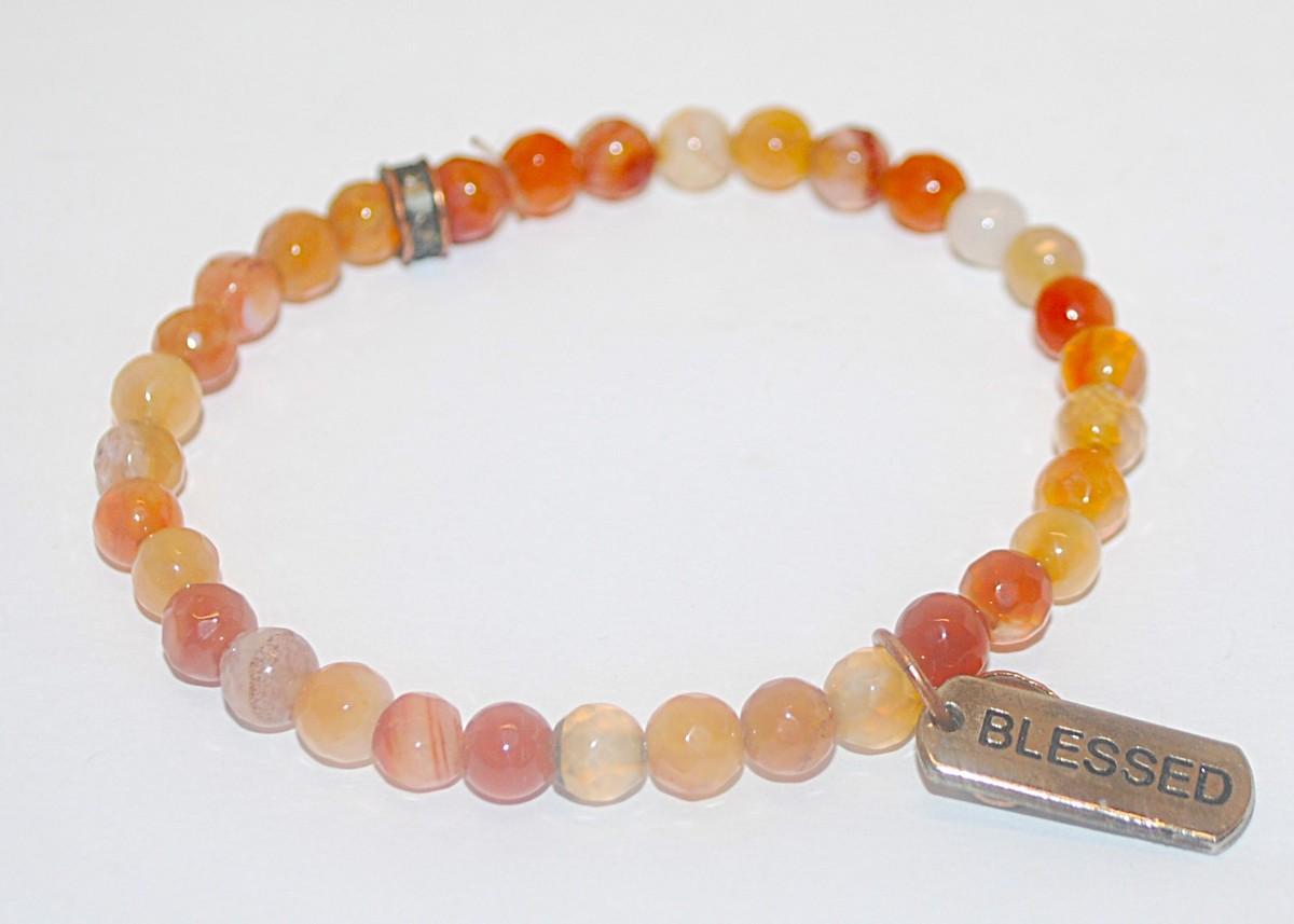 Orange & Amber Bead Elastic BRACELET (2¾"+ Opening) with Brass Colored Heart and "Blessed" Accents