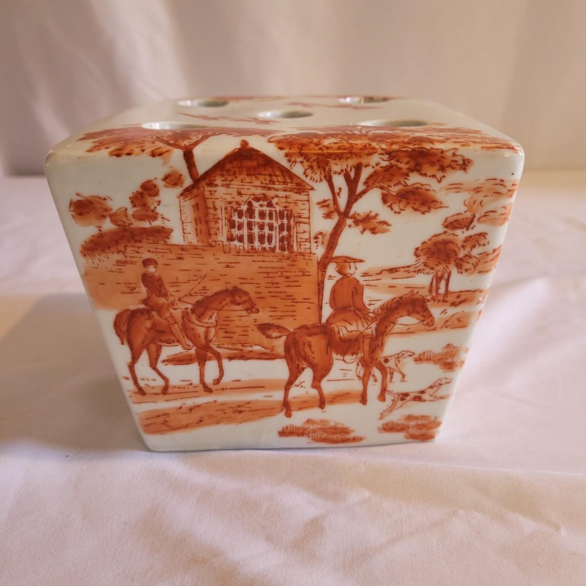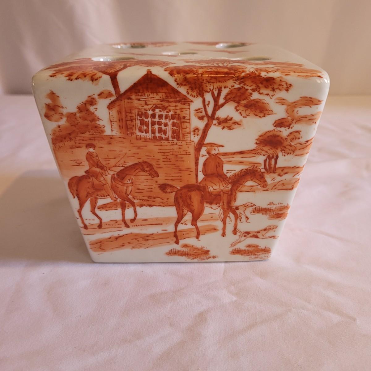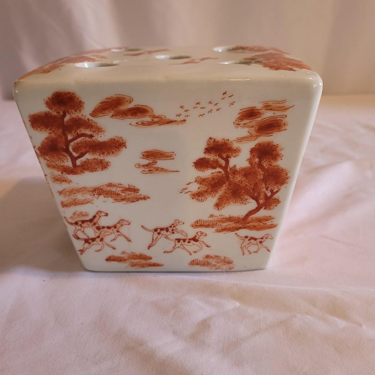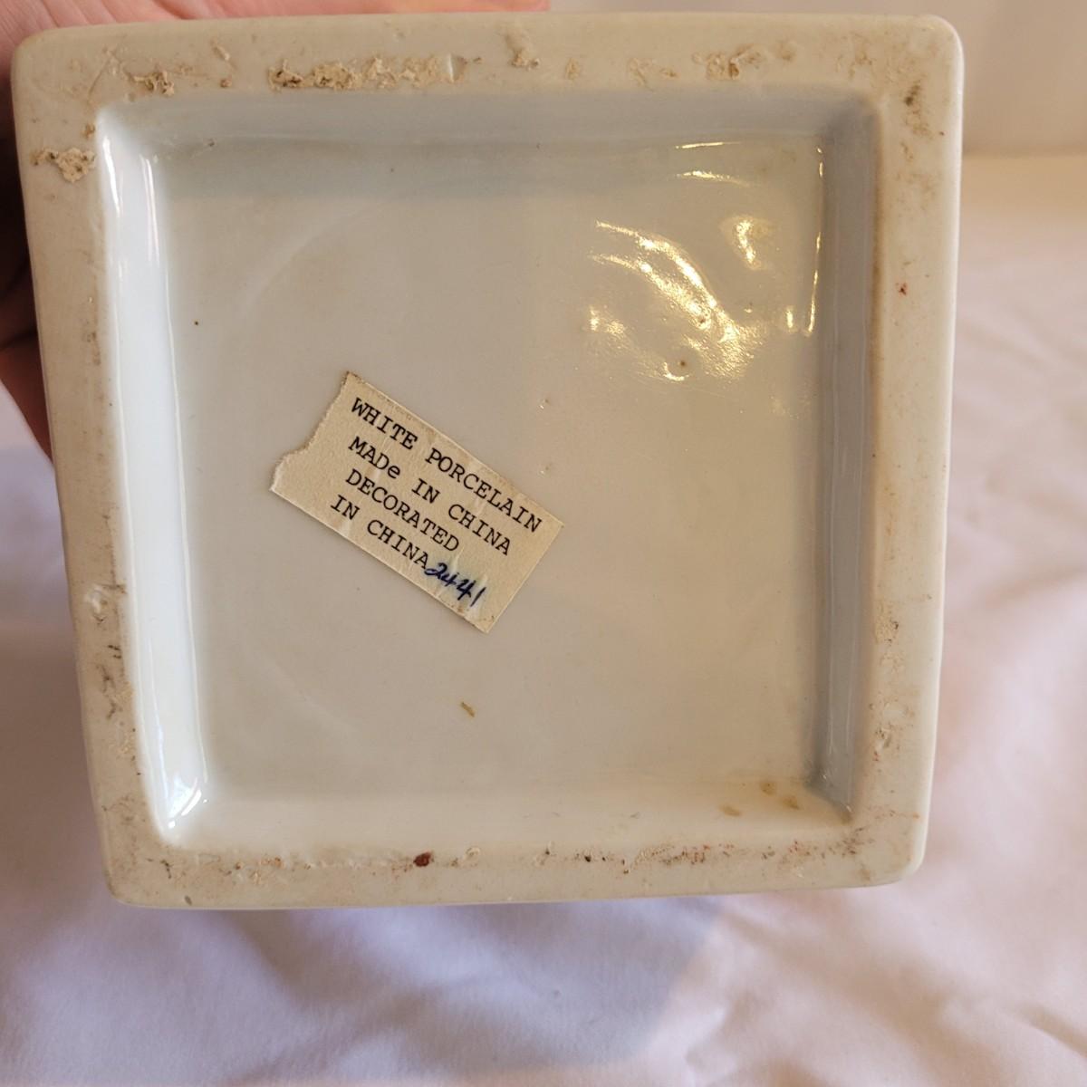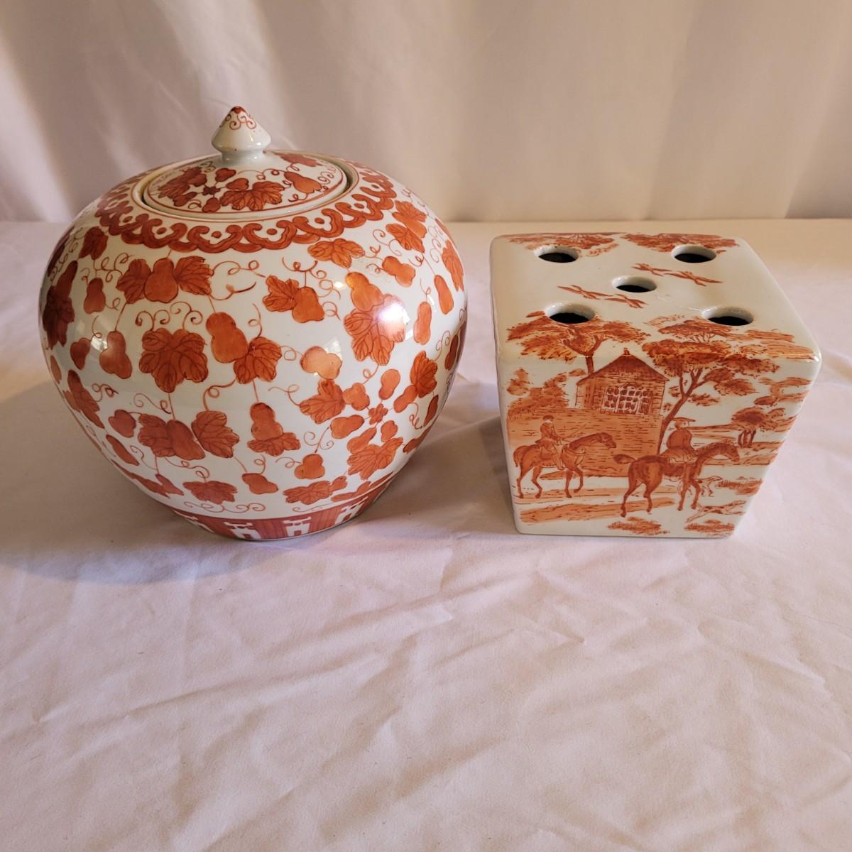 This auction is for two pieces of Chinese style porcelain. The first piece is a ginger jar with patterns of leaves and vines. It features a small lid with a handle. It is marked on the bottom in Mandarin and likely dates to the early 20th century. The ginger jar measures 8" x 8" x 8"H. The second piece is a box shaped flower vase. It features five holes in the top for inserting plant stems. It depicts images of horses, dogs, and trees. The flower case measures 6" x 6" x 5"H.