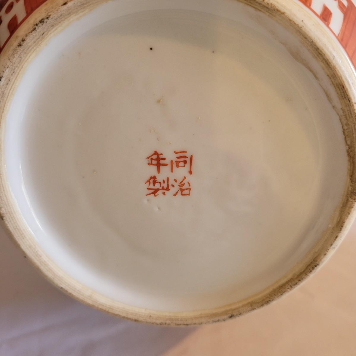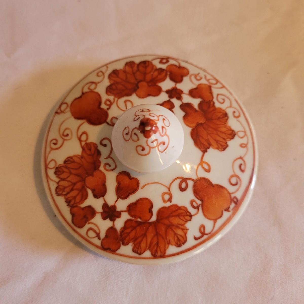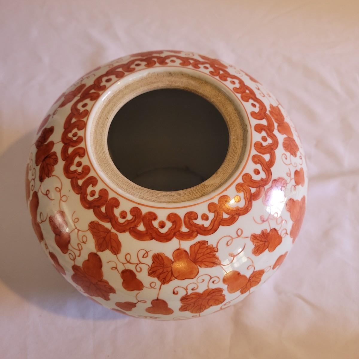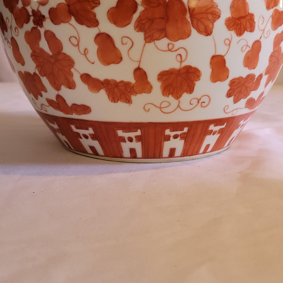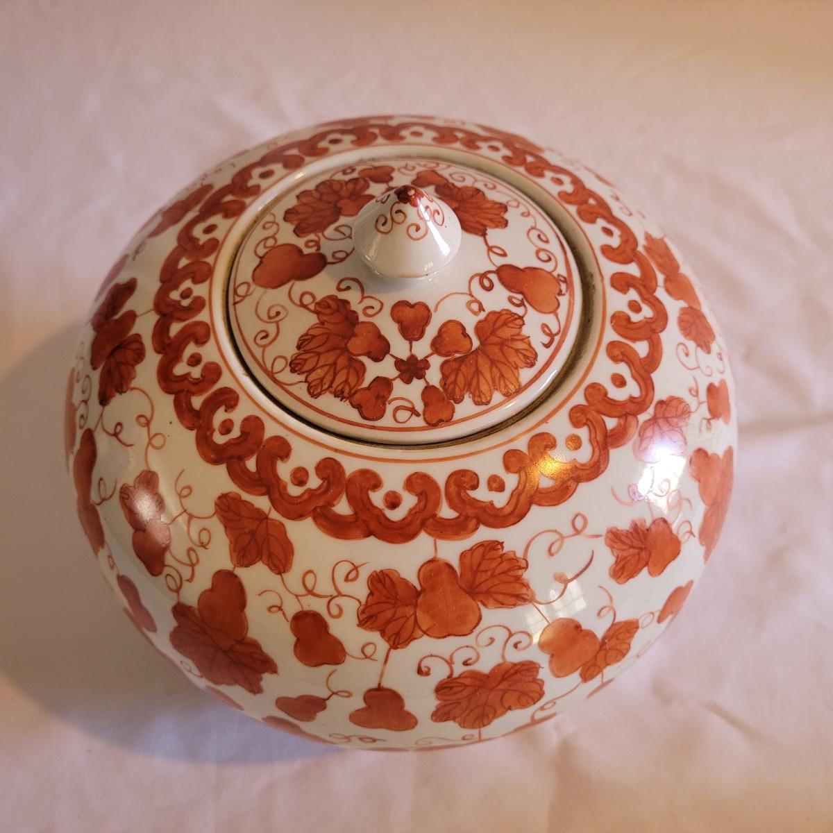 This auction is for two pieces of Chinese style porcelain. The first piece is a ginger jar with patterns of leaves and vines. It features a small lid with a handle. It is marked on the bottom in Mandarin and likely dates to the early 20th century. The ginger jar measures 8" x 8" x 8"H. The second piece is a box shaped flower vase. It features five holes in the top for inserting plant stems. It depicts images of horses, dogs, and trees. The flower case measures 6" x 6" x 5"H.