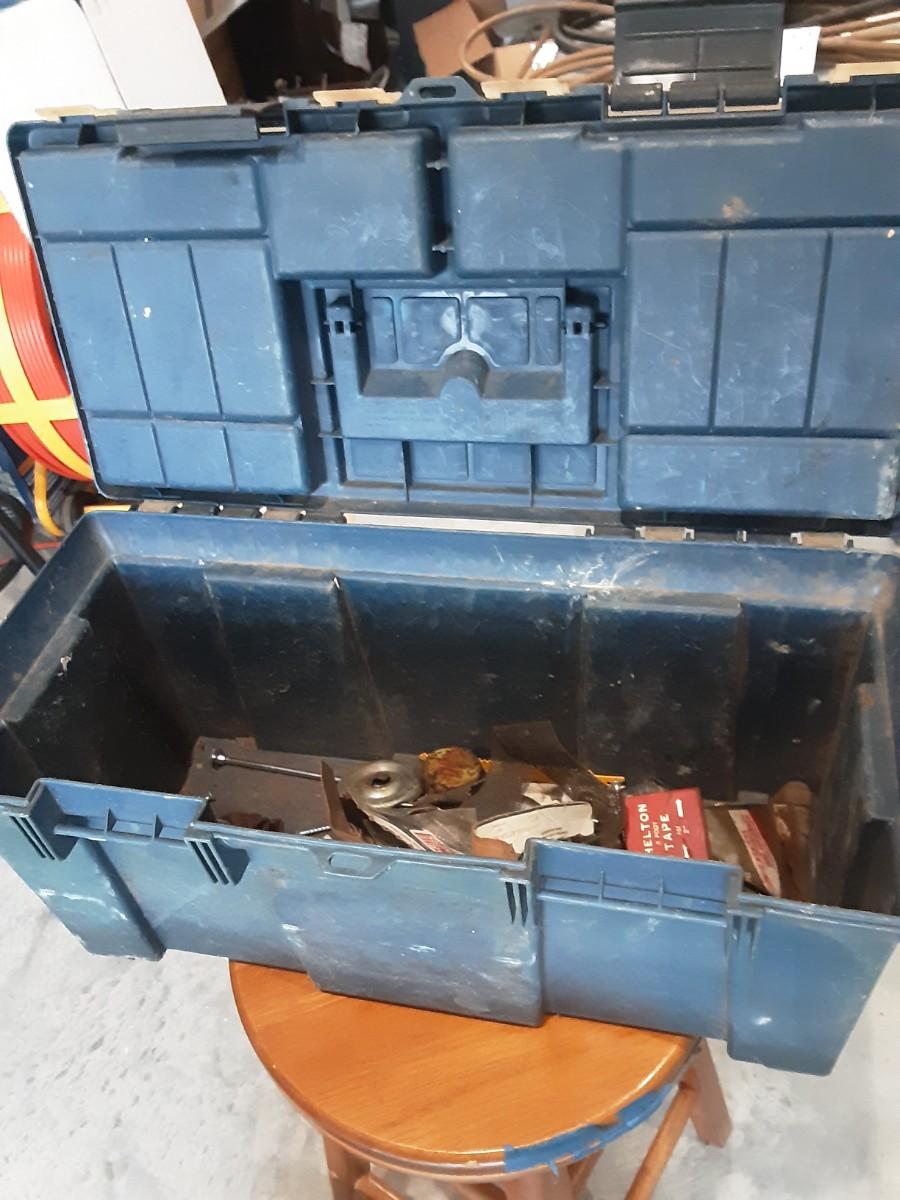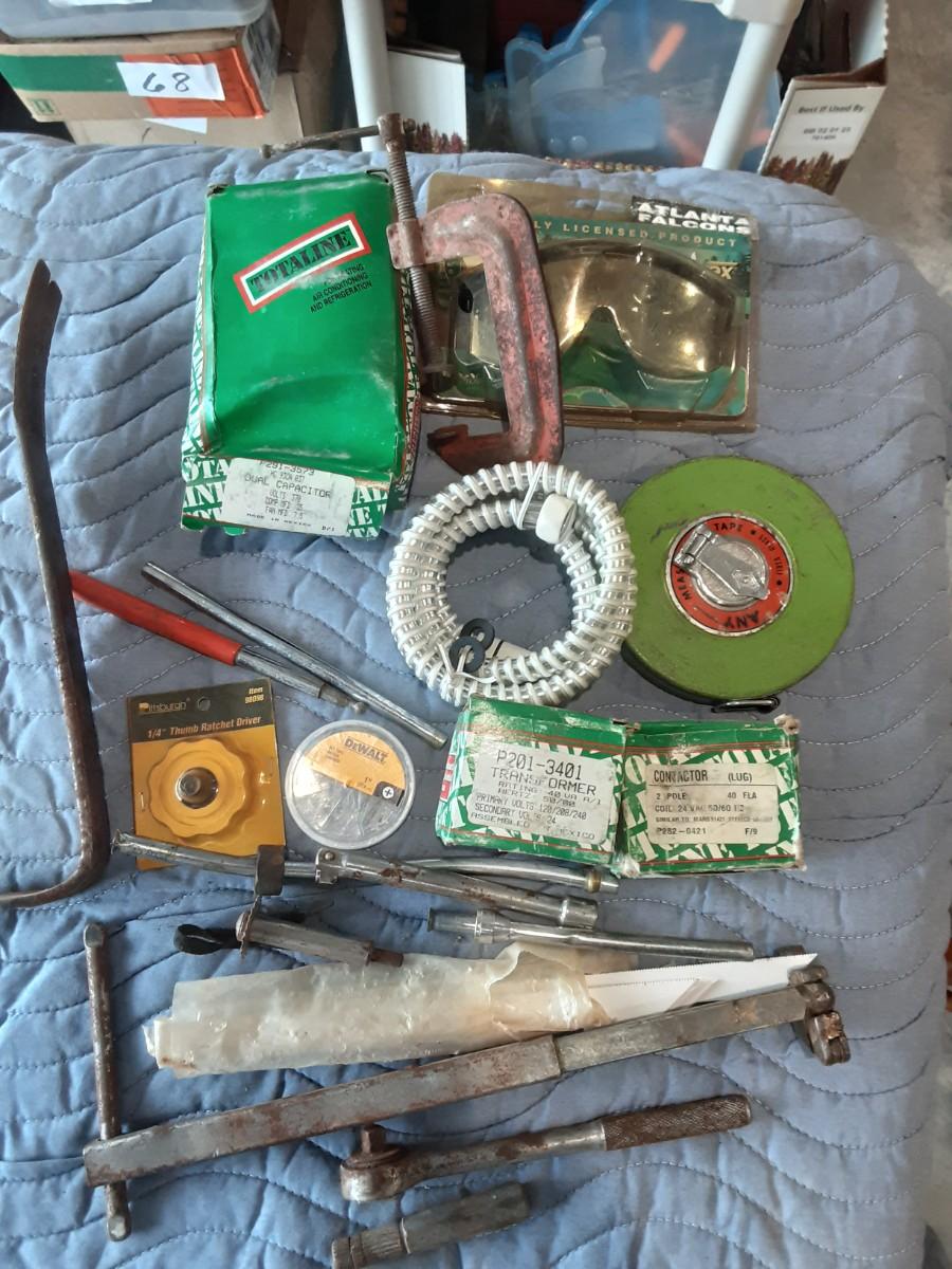 Tool box of assorted parts and tools as shown, including Transformer, Ratchet driver, safety glasses, dual capacitor, tape measures, hose connector, etcetera