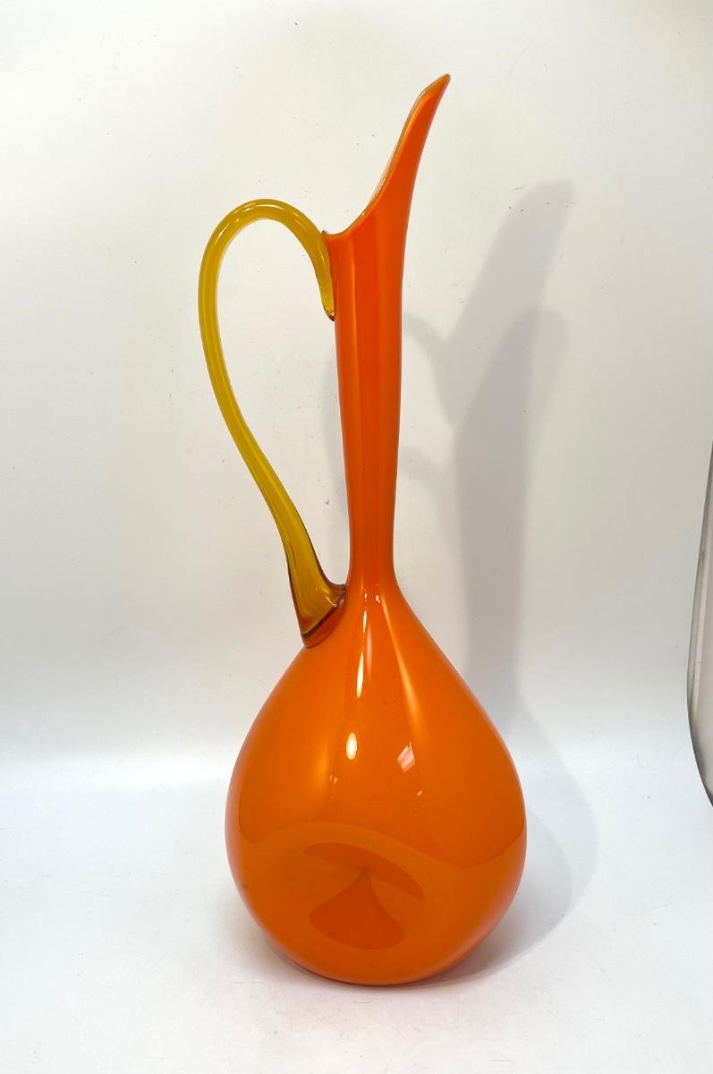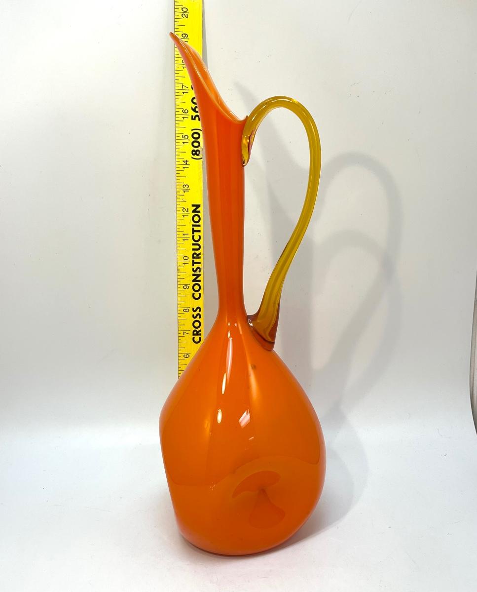 This fabulous piece stands 18 inch high, with a 6-1/2 inch spout-to-handle span and a base diameter of 6 inch, at the widest point. In very good condition, with a few tiny encased bubbles and short, superficial scratches; no nicks, chips, or cracks. Circa 1950.