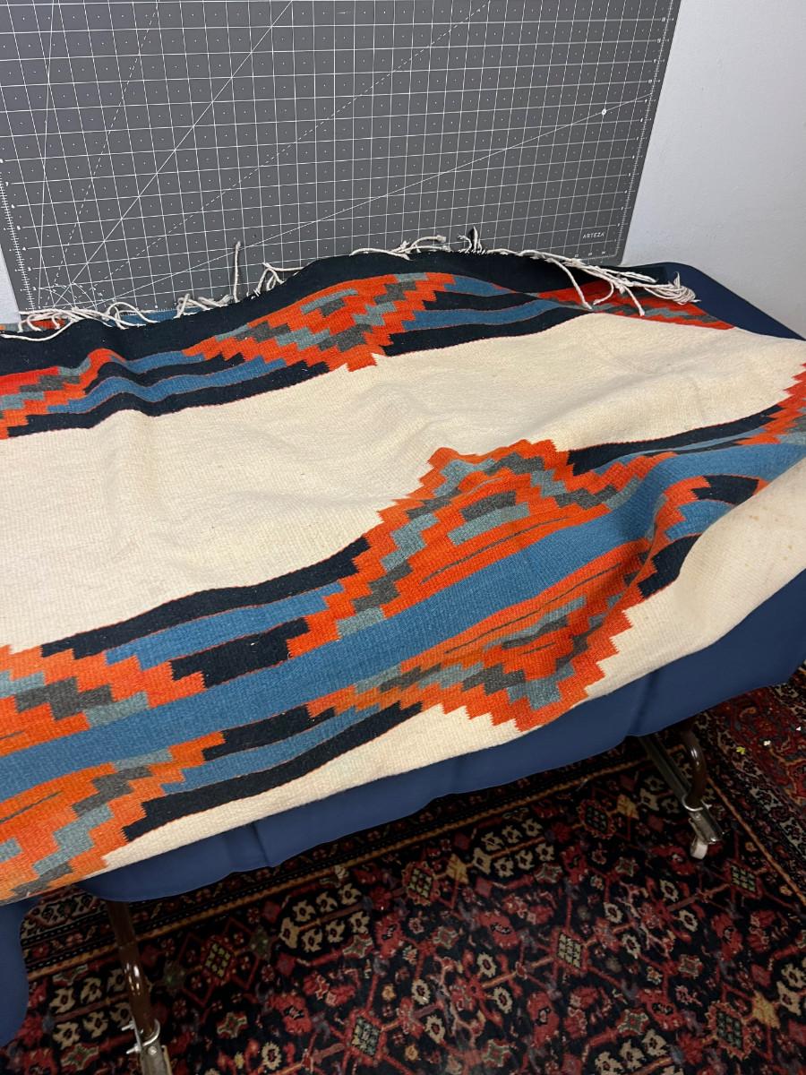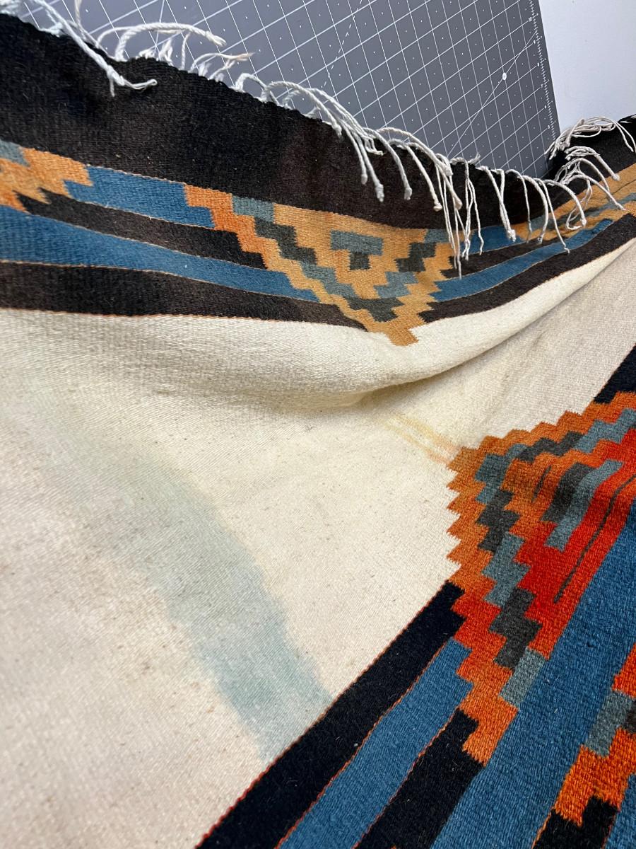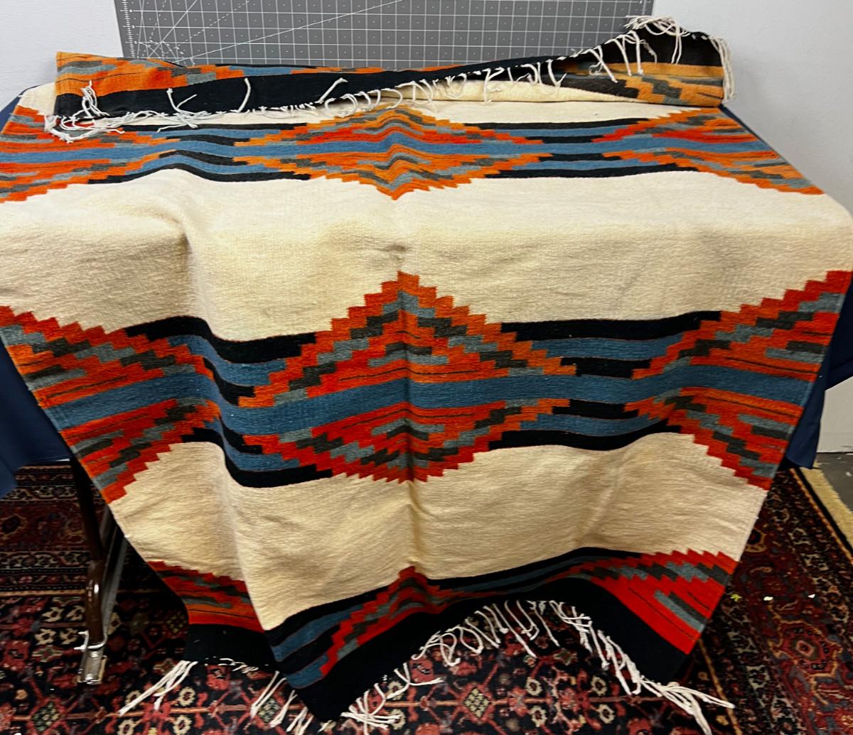 45" by 71" 2 ends fringed. Some Fading Wool on Cotton.