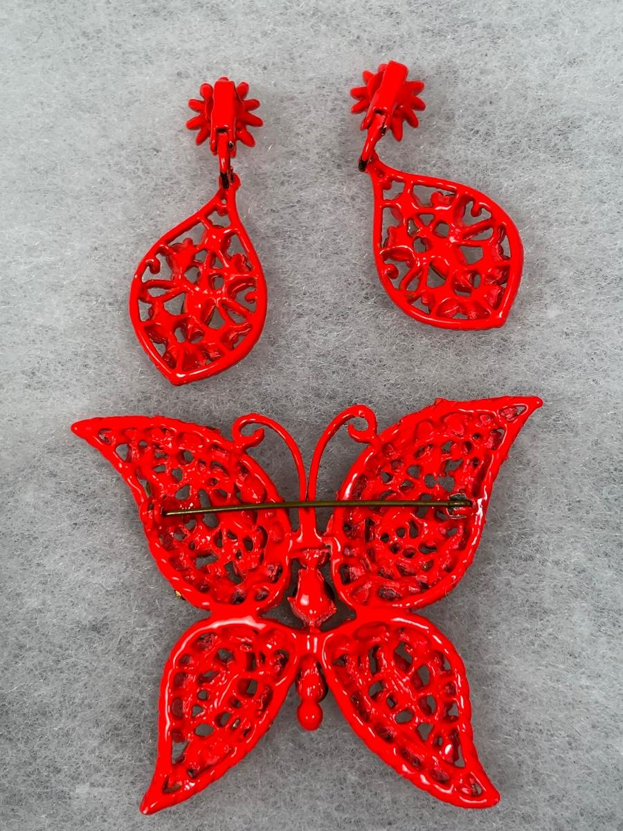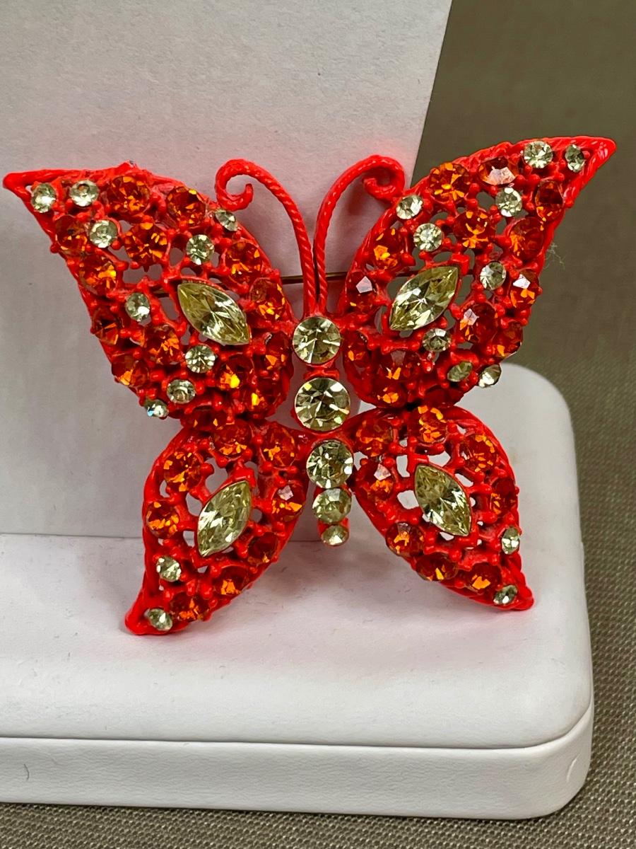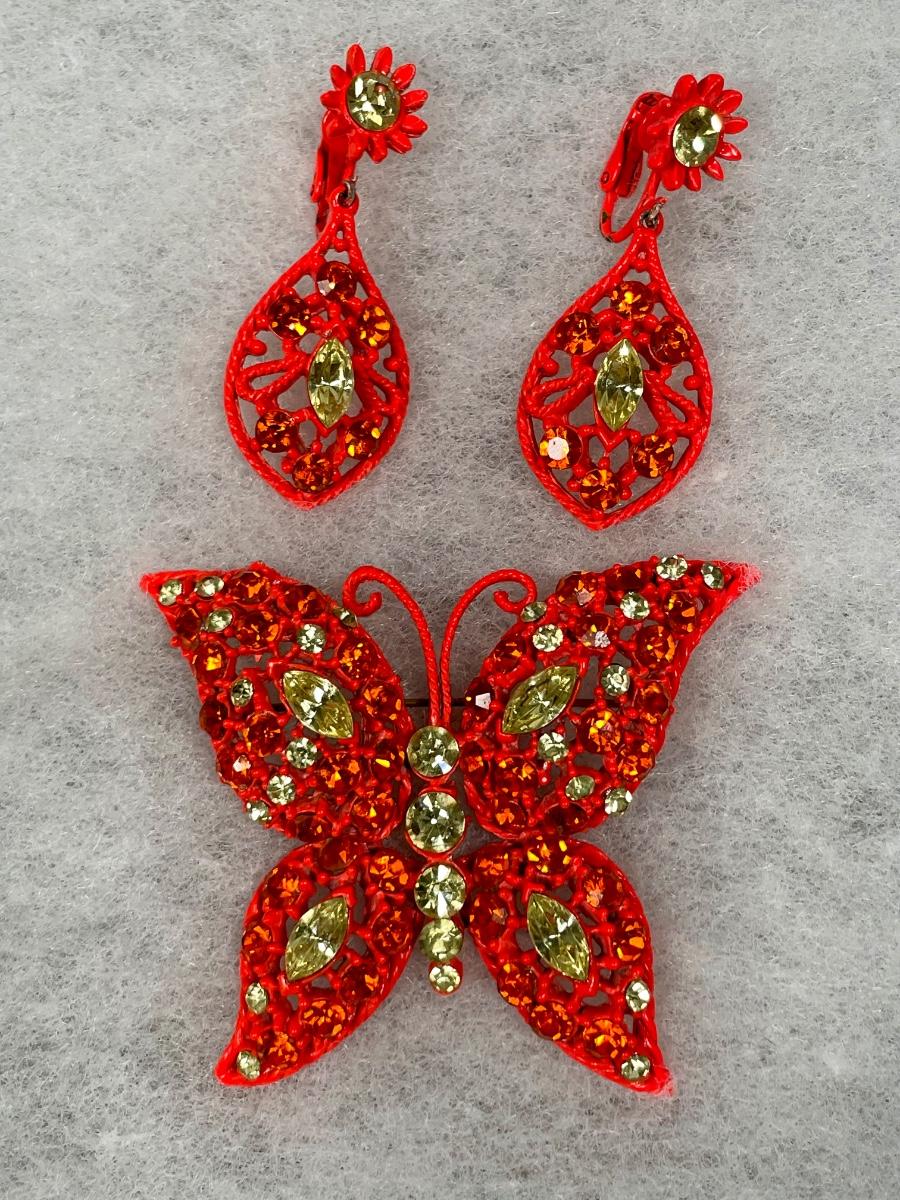 Day glow orange painted metal with yellow rhinestones. Clip dangle earrings.