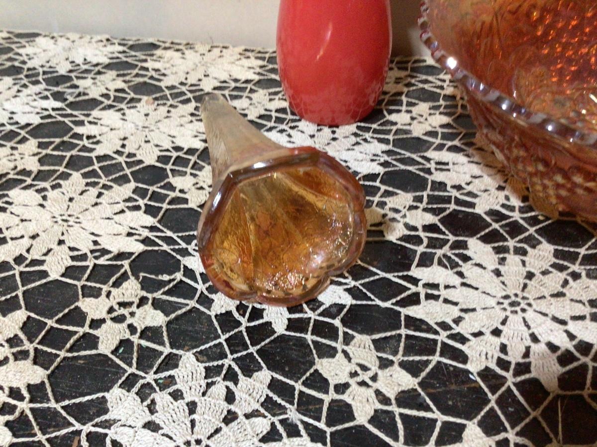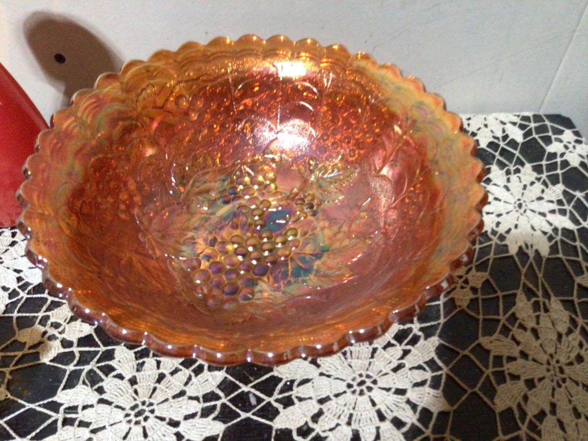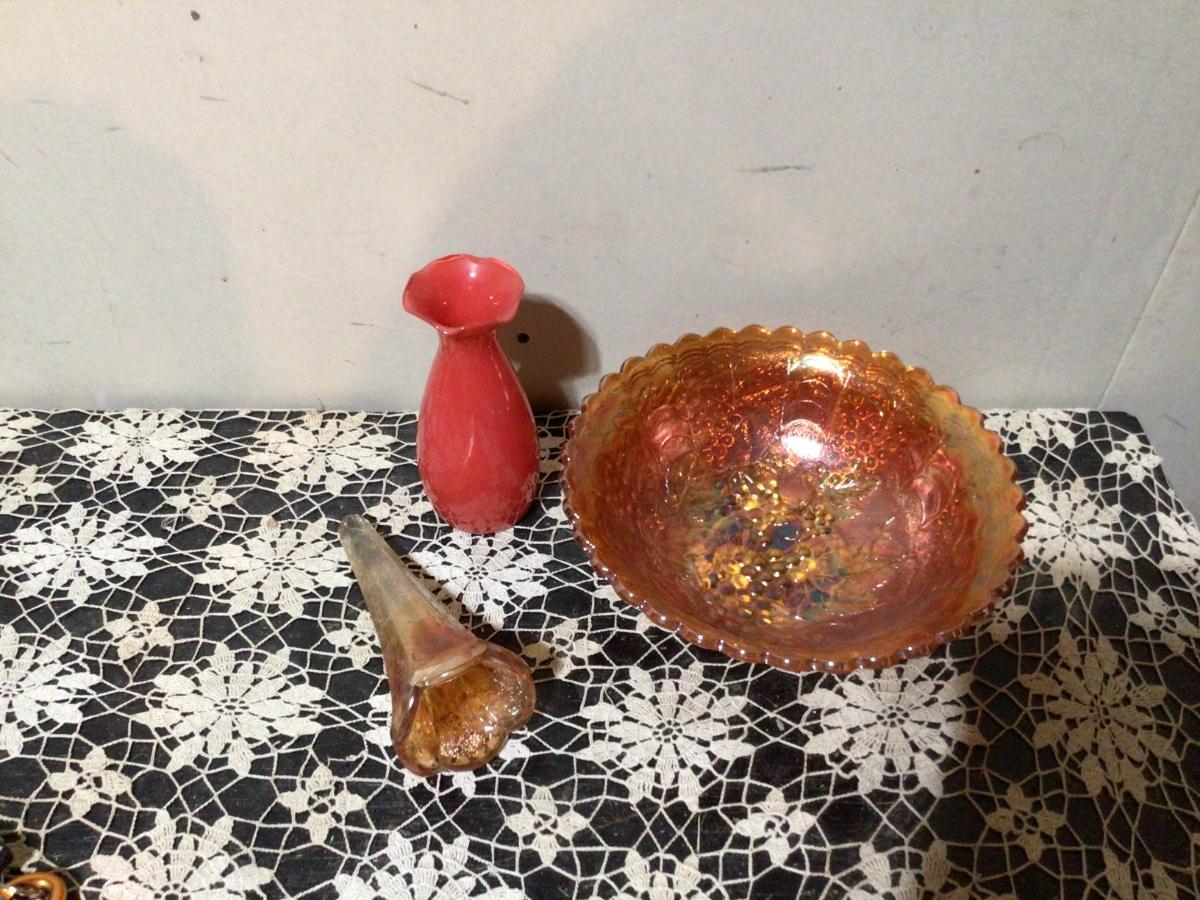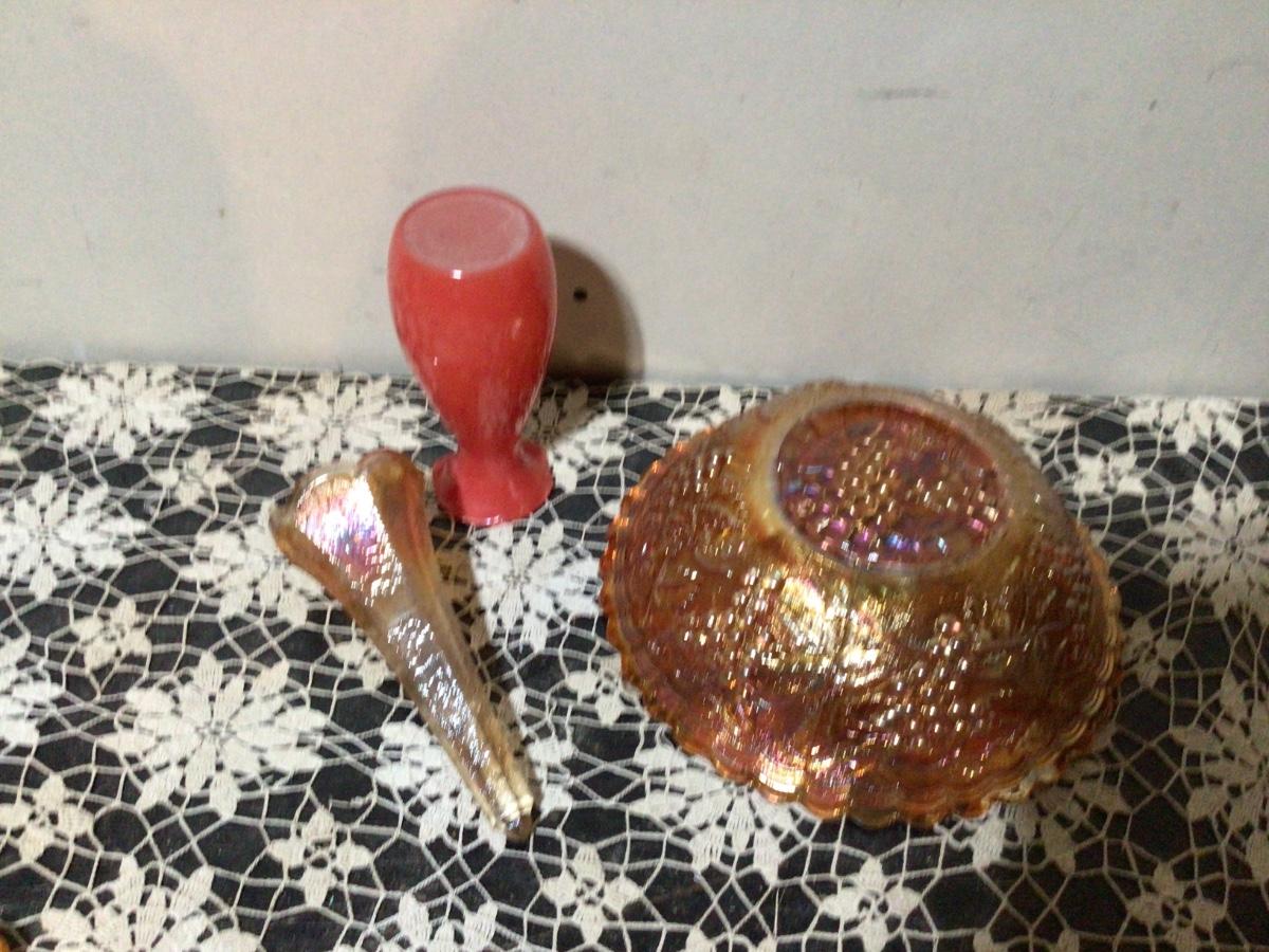 You get large orange carnival glass bowl, orange carnival glass flower vessel, and a reversed painted orange red glass flower vase.