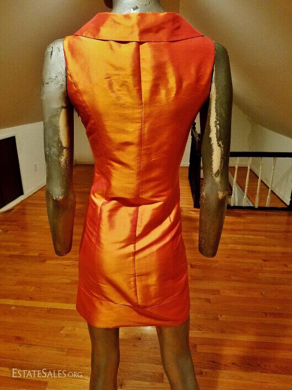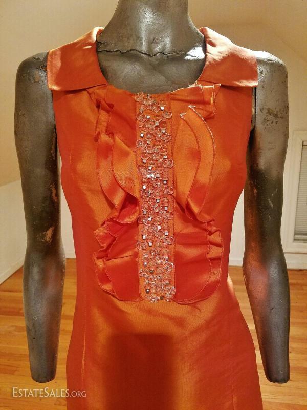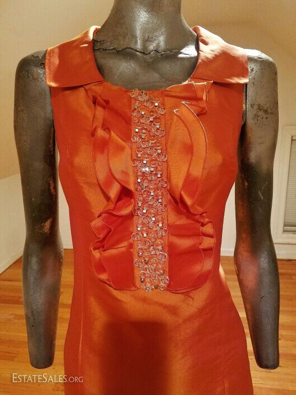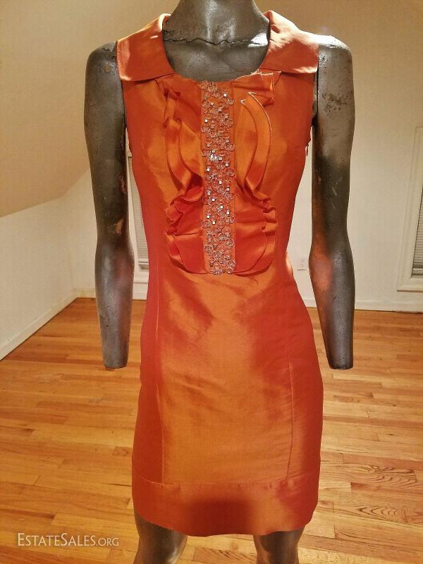 Orange Lame silk embellished mini dress ruffled bodice with collar