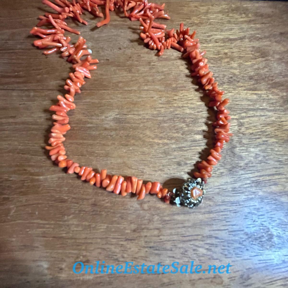 19in Coral Colored Glass Bead Statement Necklace with Detailed Box-Tab Insert Clasp