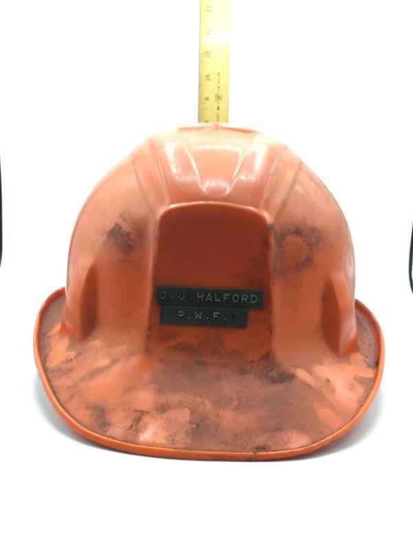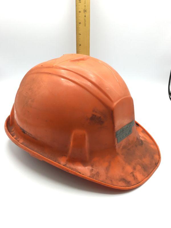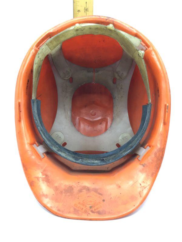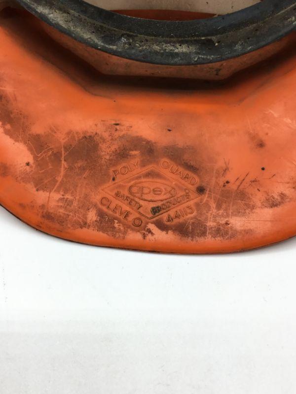 Vintage orange plastic hard hat. Dirty from years in garage. Good condition. Made by Apex Safety Products.