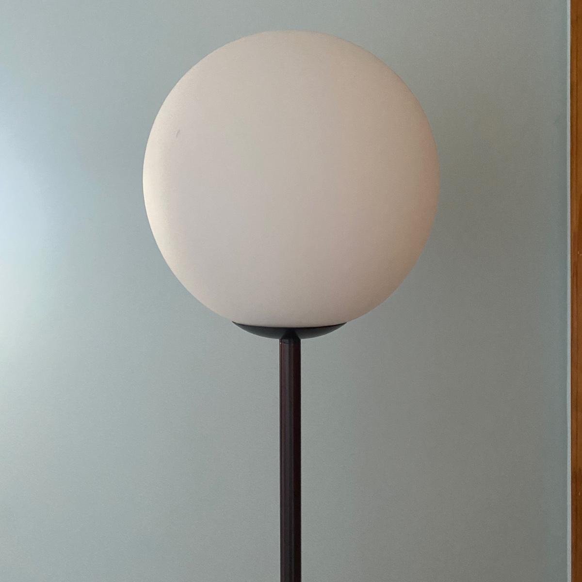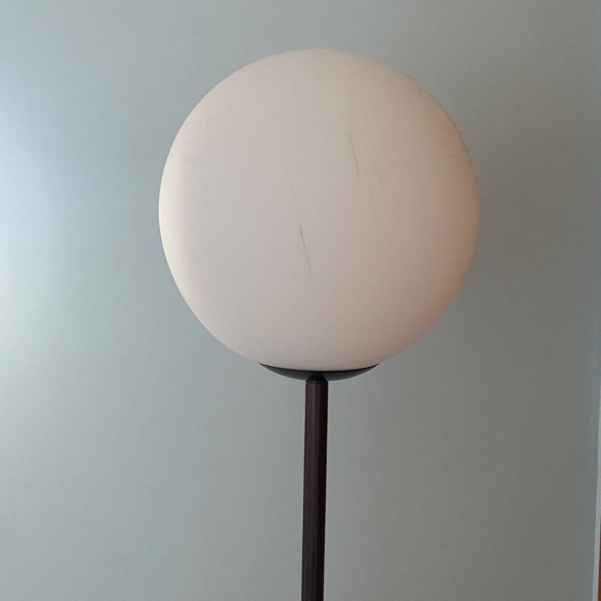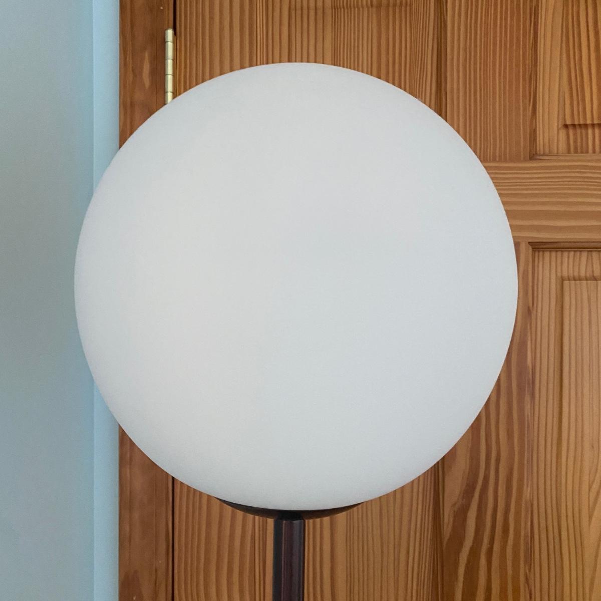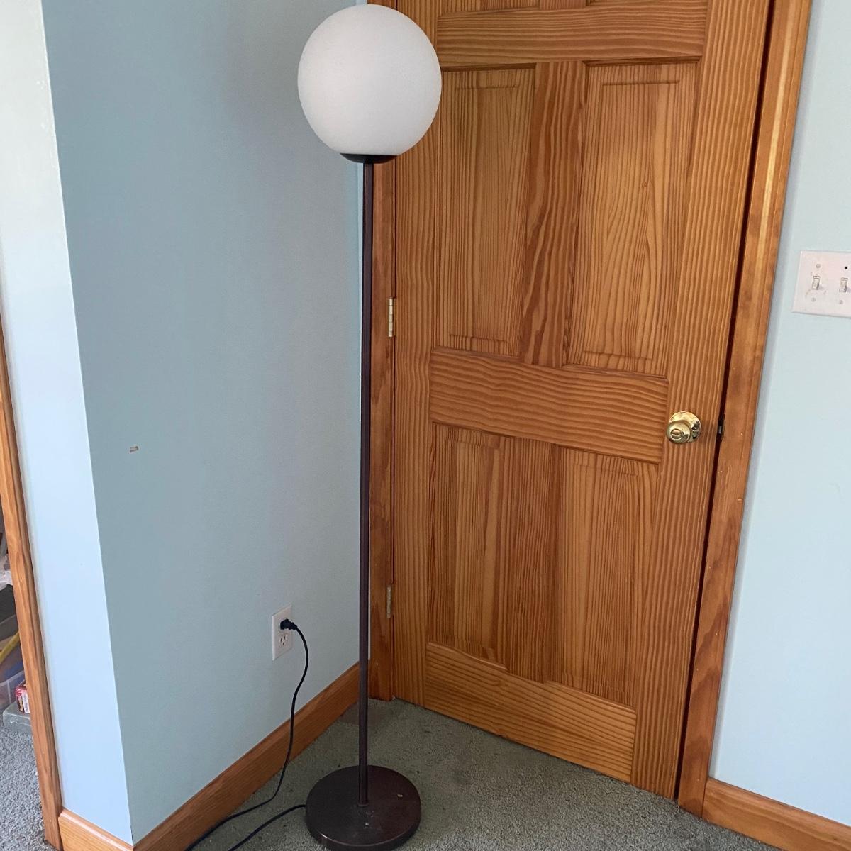 Mid century style orb floor lamp. Plastic globe and metal stand. Globe has a few marks that may be able to be washed off. Measures 64” tall , globe is 9” width. Step button on cord for light function. Local pick up only.