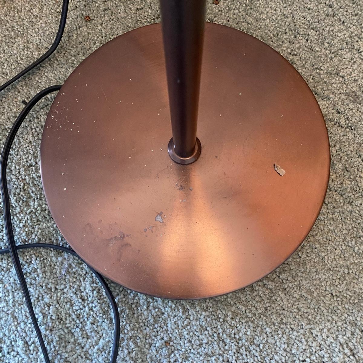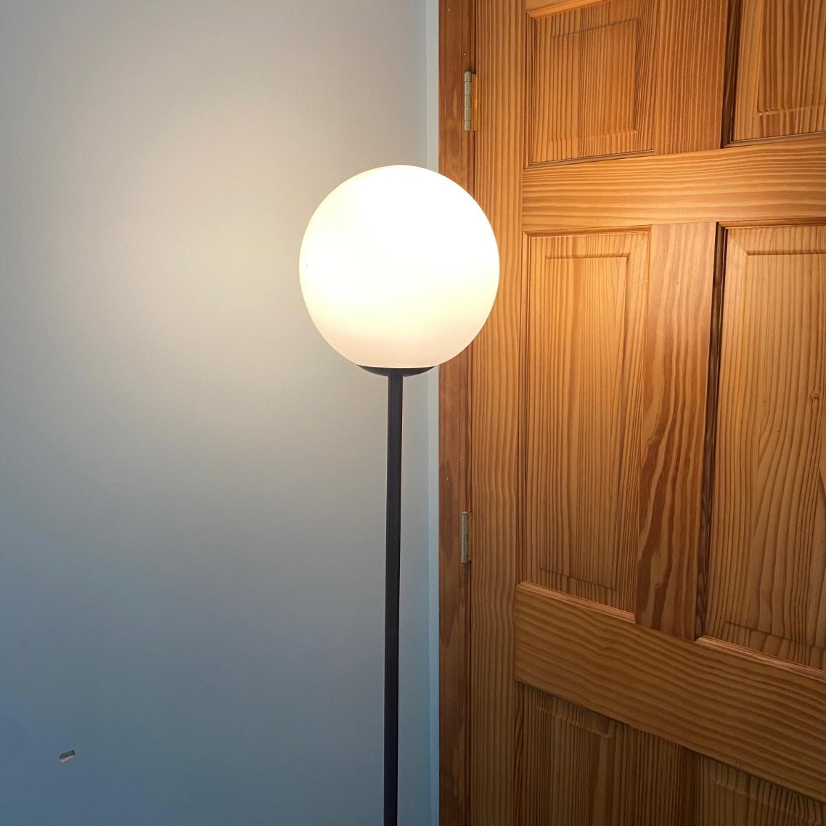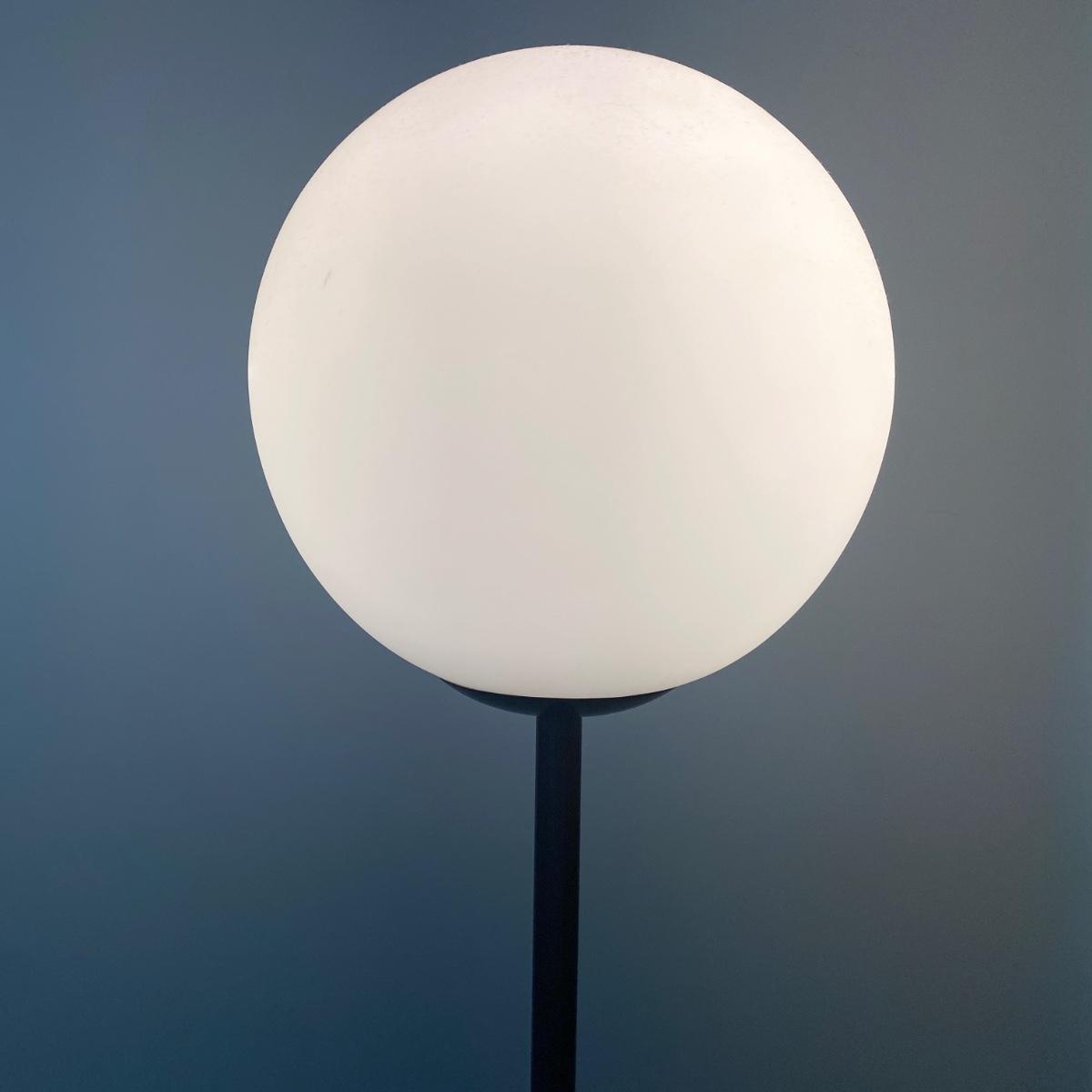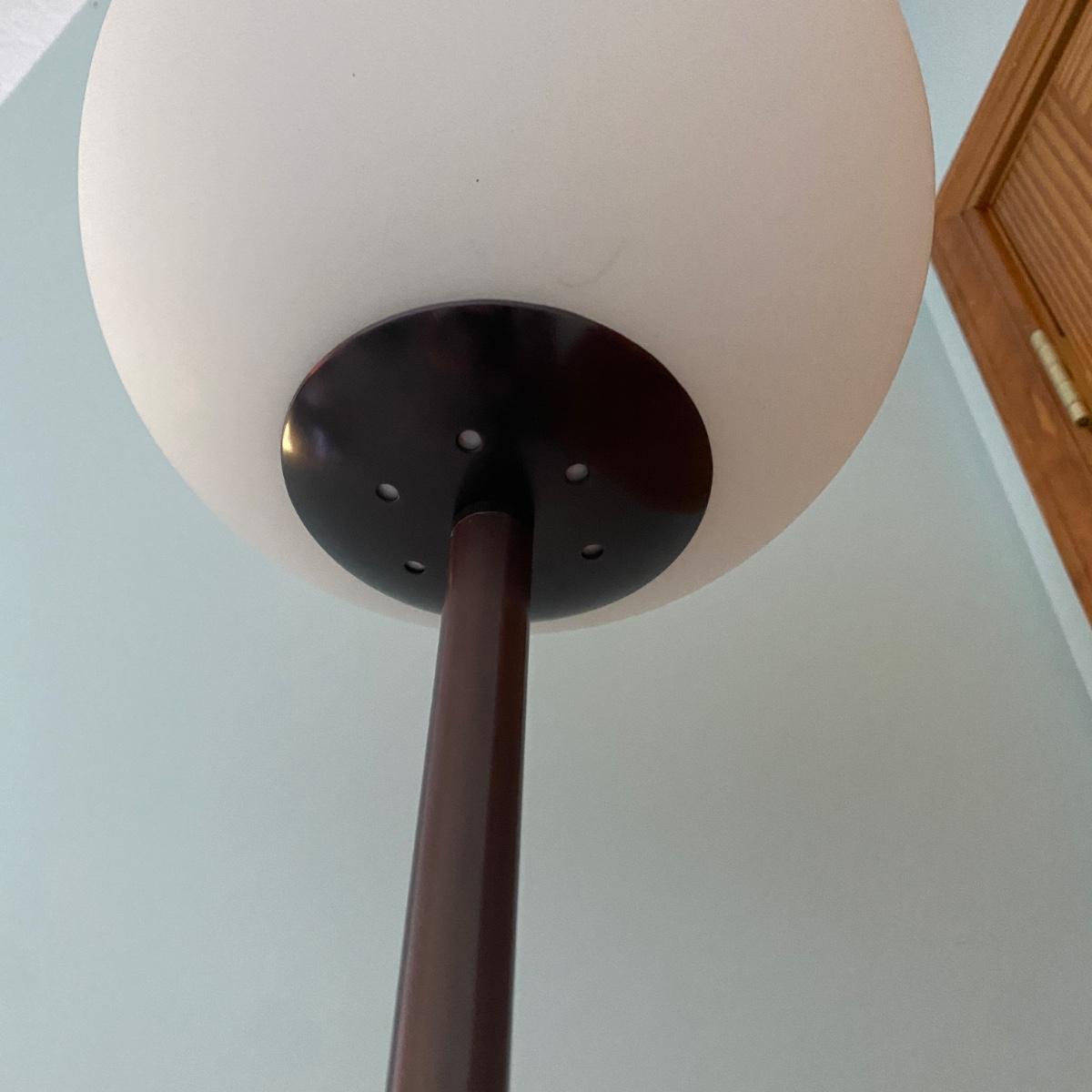 Mid century style orb floor lamp. Plastic globe and metal stand. Globe has a few marks that may be able to be washed off. Measures 64” tall , globe is 9” width. Step button on cord for light function. Local pick up only.