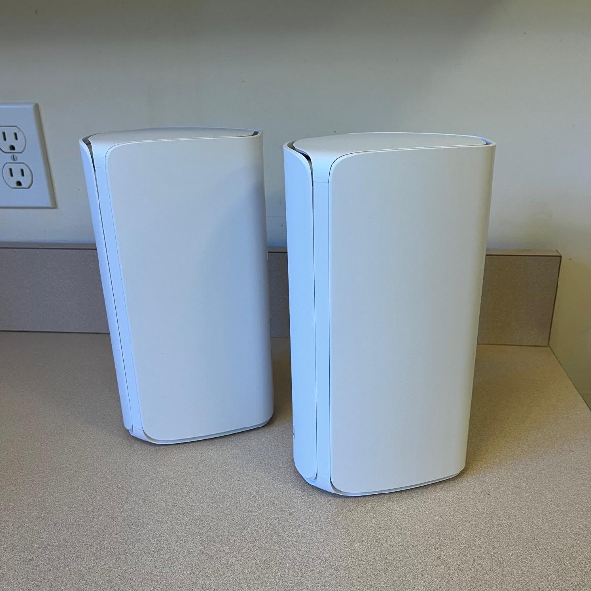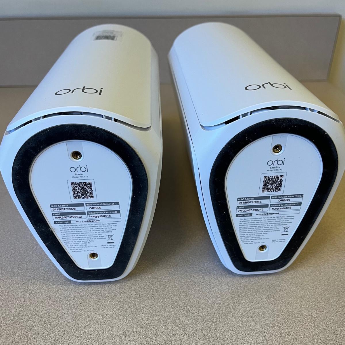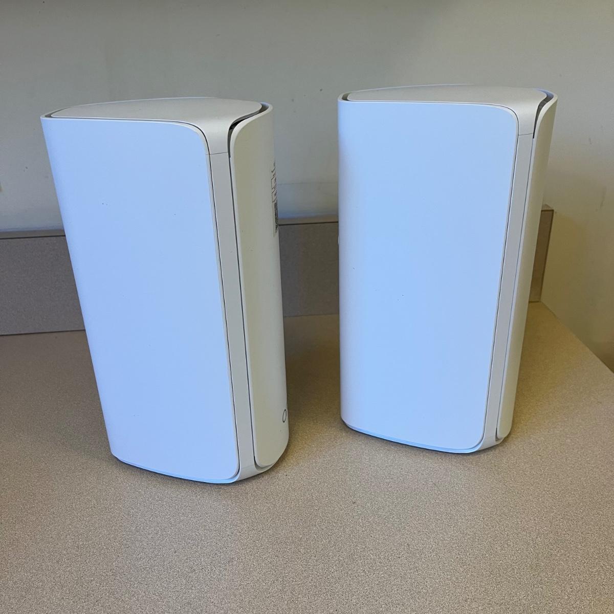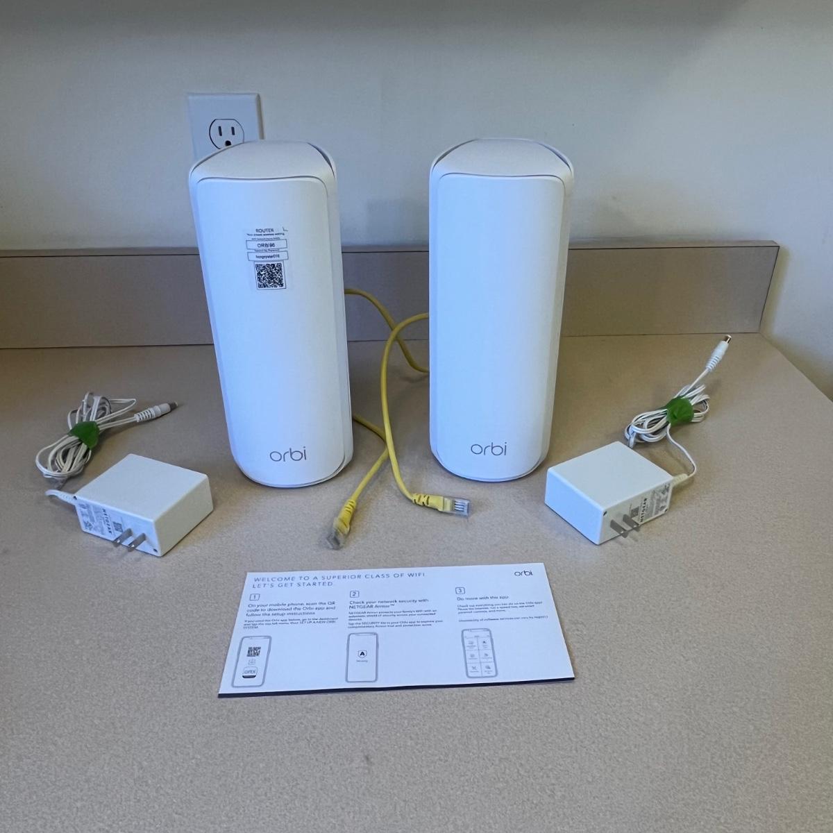 Two Orbi routers each measure 4” x 5” x 10”H. Includes two Netgear power adapters and an ethernet cable. See pictures for details. Shipping available.