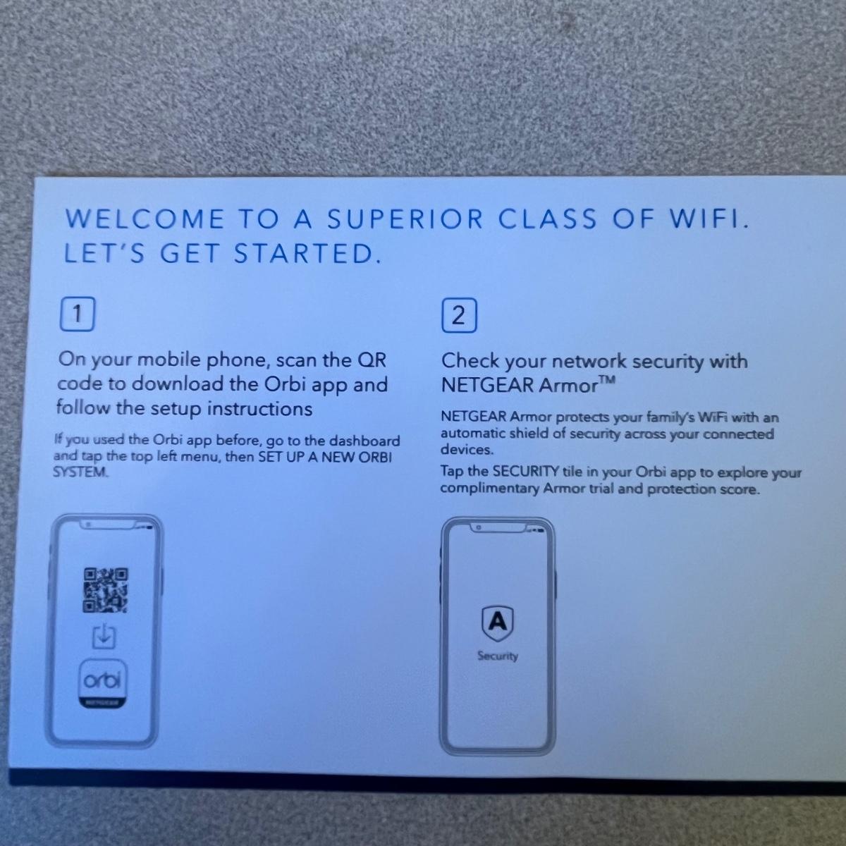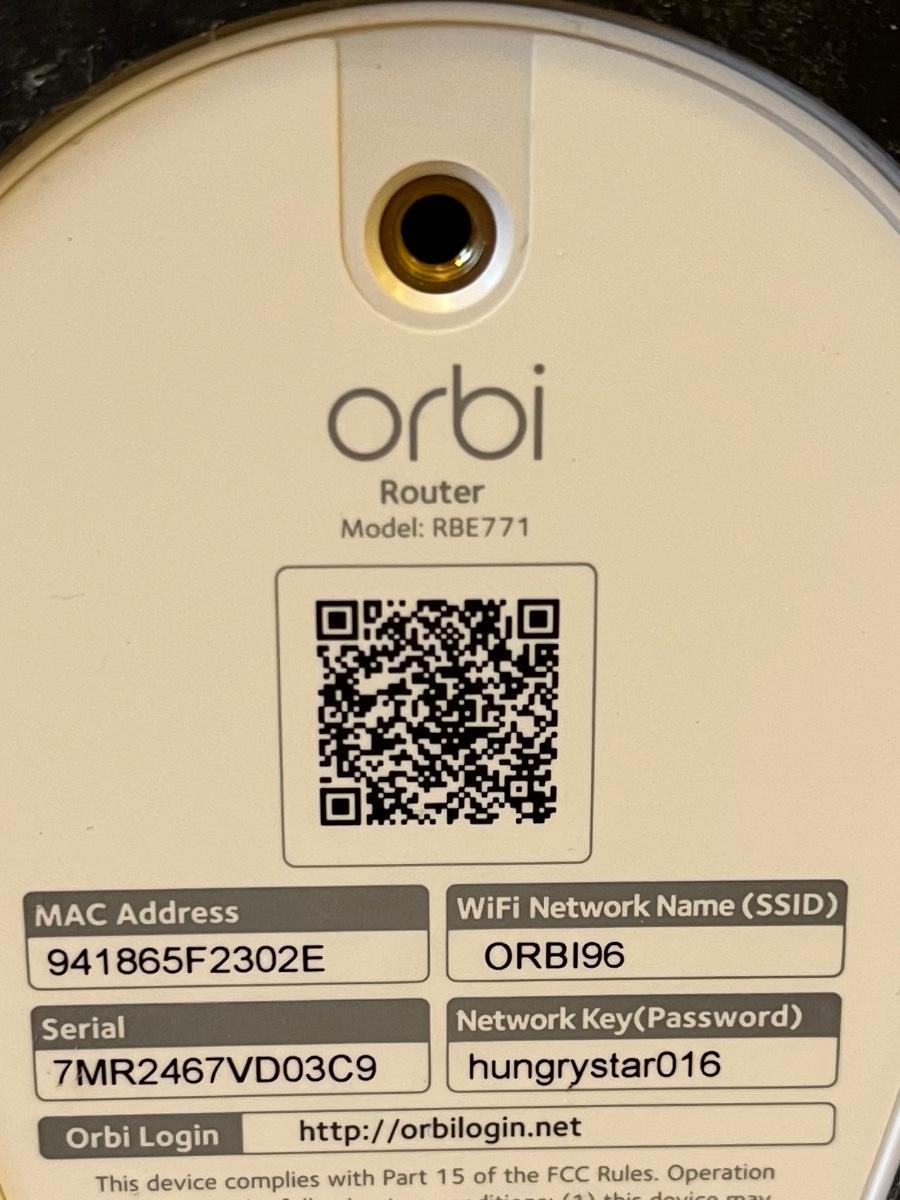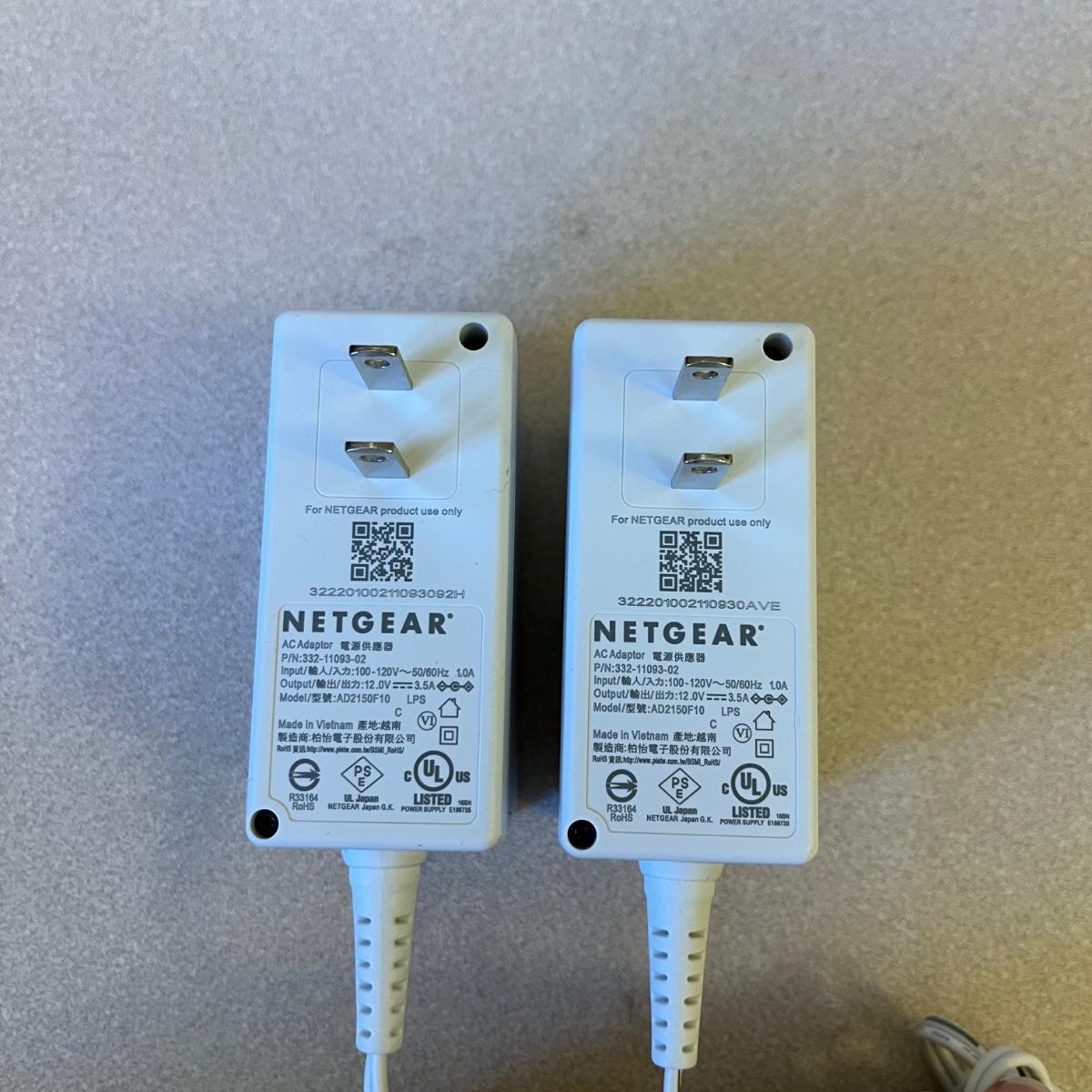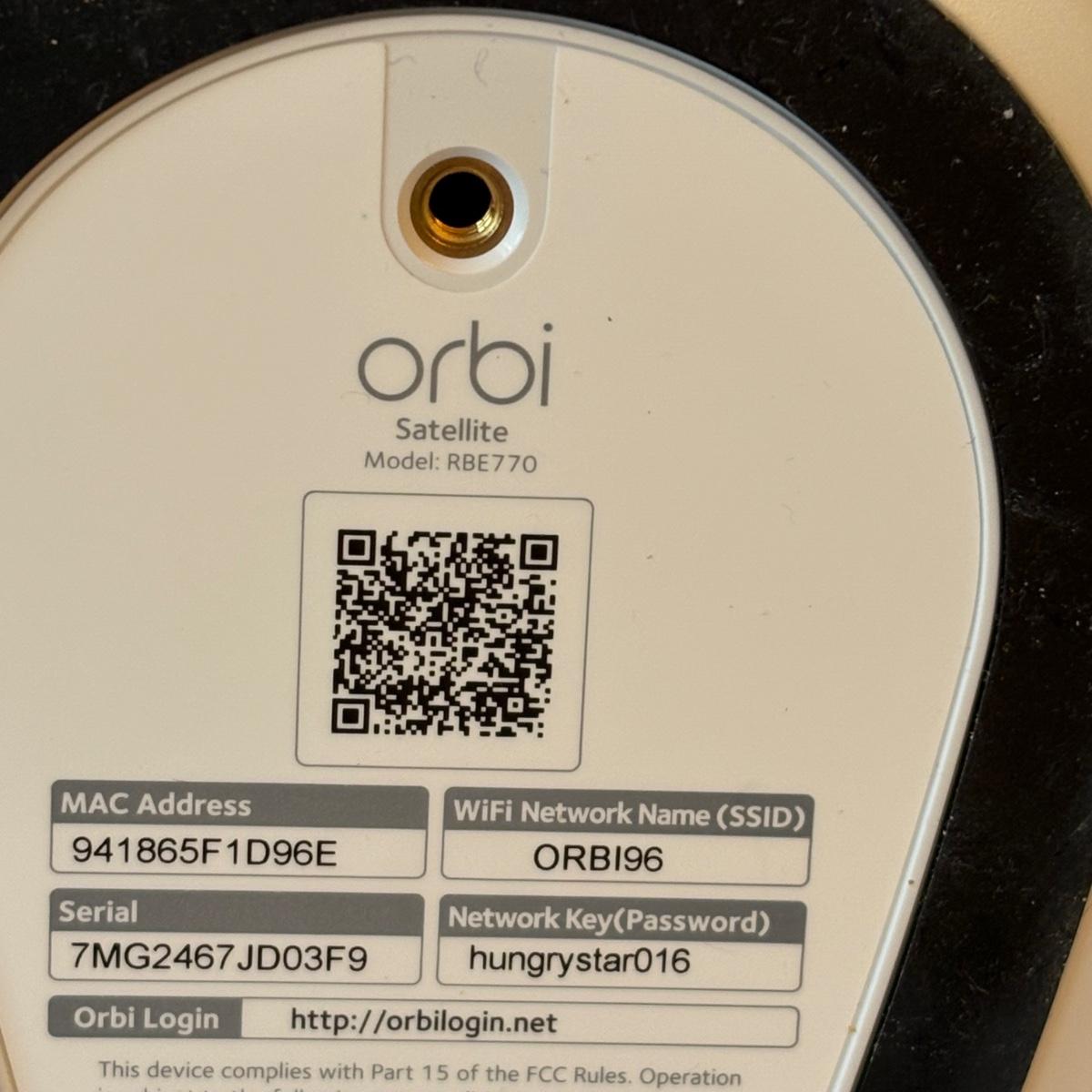 Two Orbi routers each measure 4” x 5” x 10”H. Includes two Netgear power adapters and an ethernet cable. See pictures for details. Shipping available.