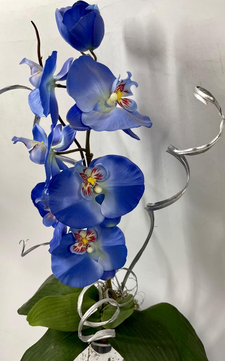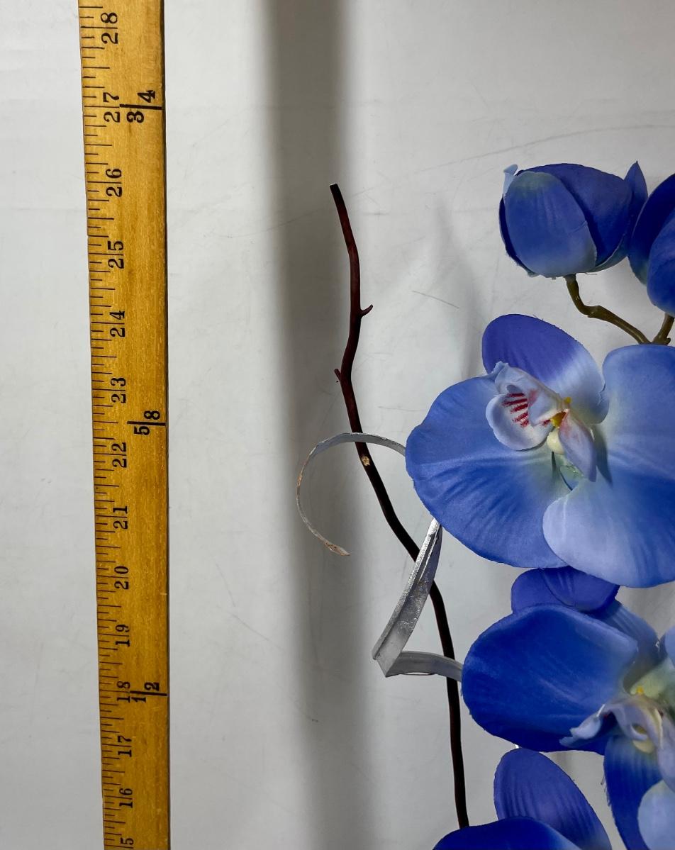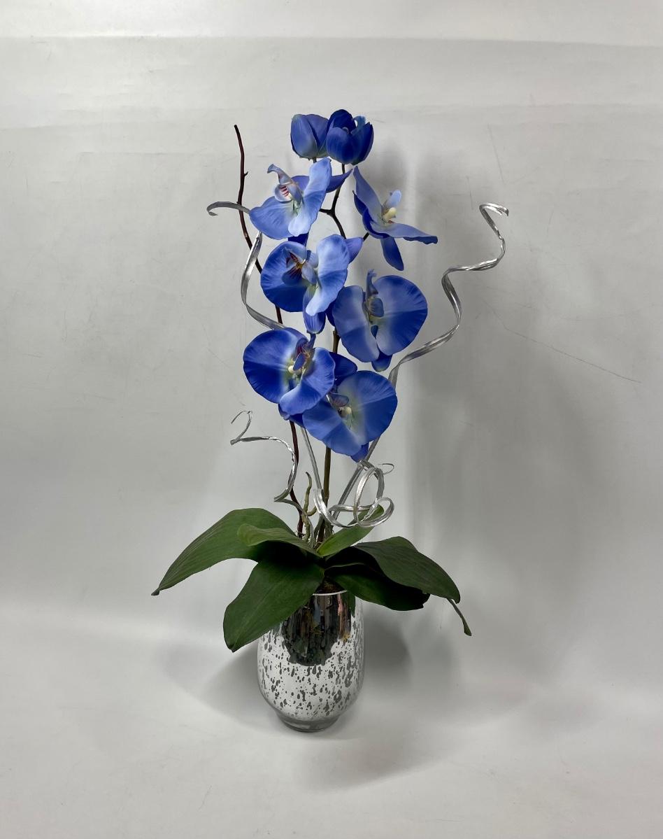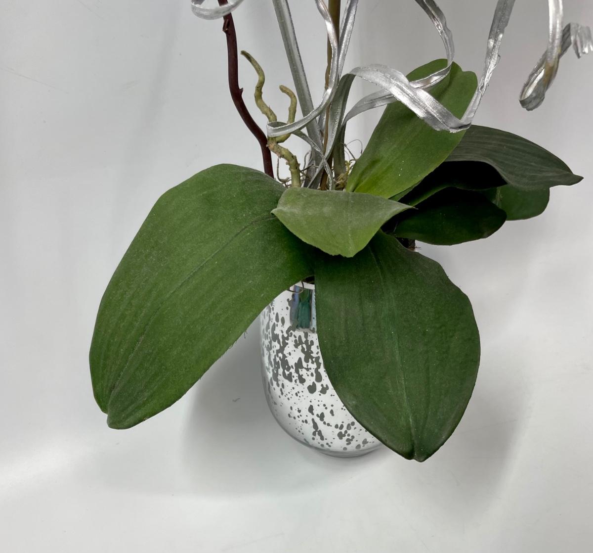 Colorful artificial silk Orchid in a mirrored glass pot. Stands approx. 27” tall.