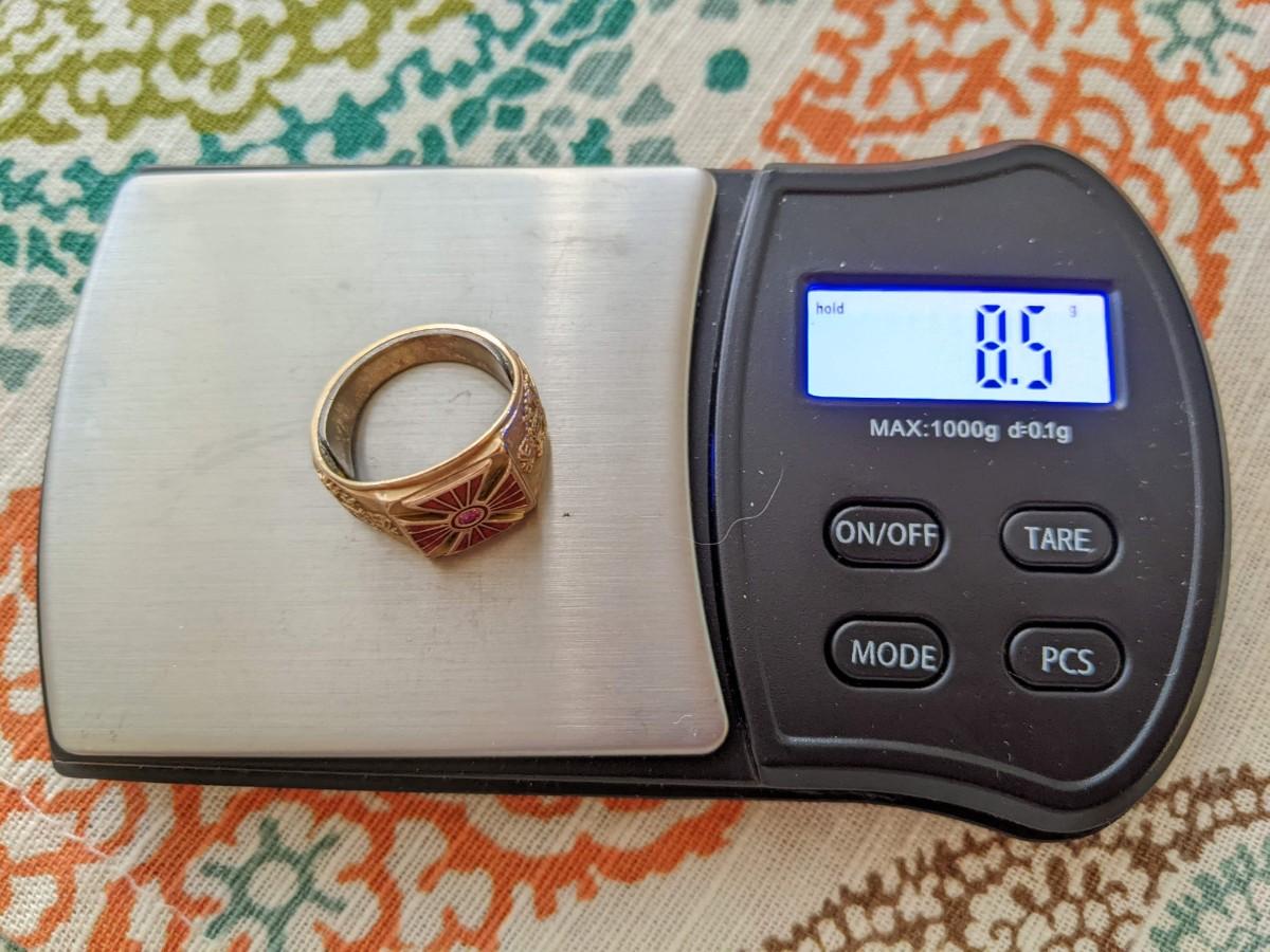 Ring weighs 8.5 g but note: there has been an adjustment made to the back inside of the ring.