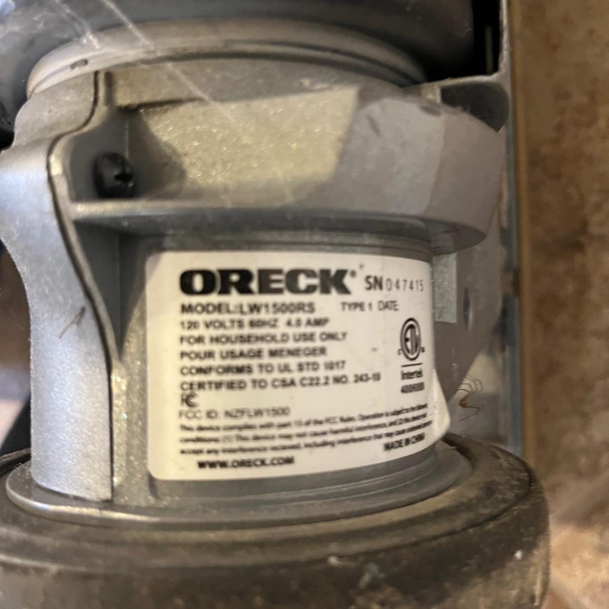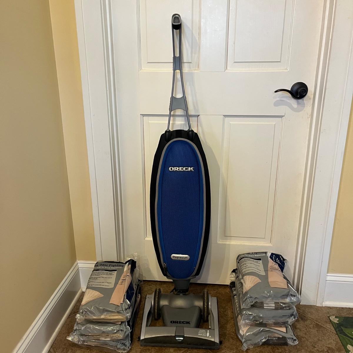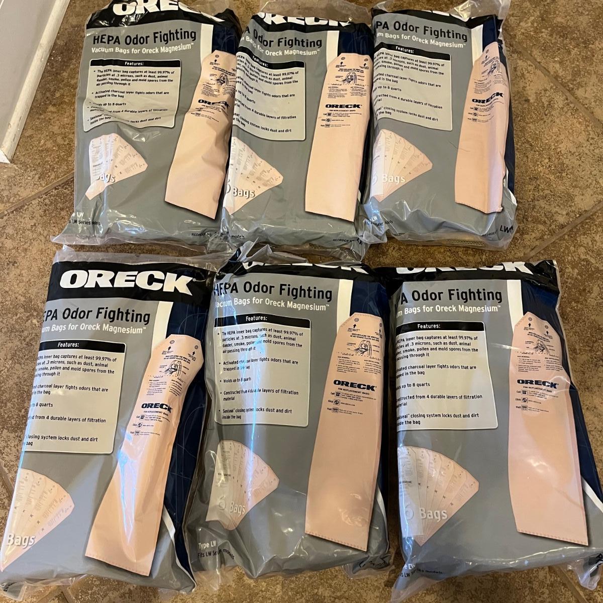 Oreck Magnesium cordless upright vacuum model # LW1500RS. Vacuum could not be tested as battery in handle appears to need replacing. Also includes five new packages of bags and one open package of bags.
