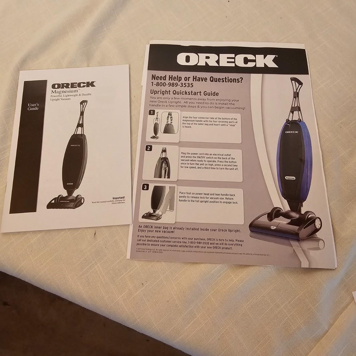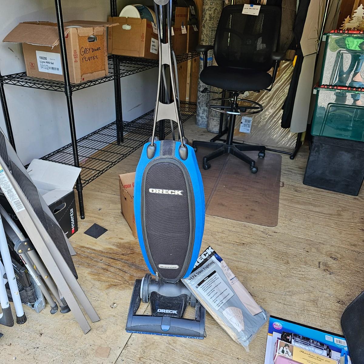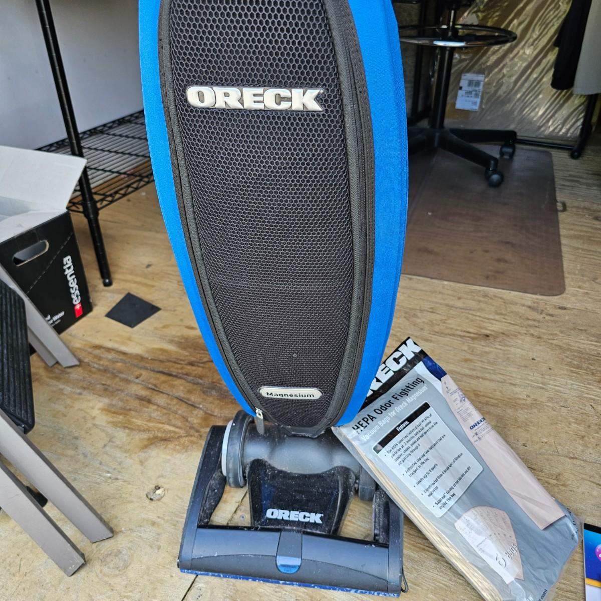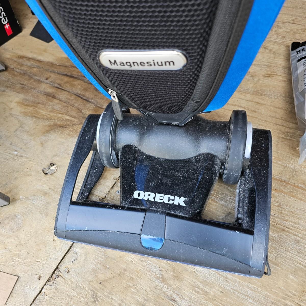 Nice lightweight Oreck Magnesium vacuum. Two speed power and easy turning. Unit measures 12" x 10" x 48"H, comes with extra bags and manual. Vacuum powered on when plugged in. See photos for details. Local pickup only.