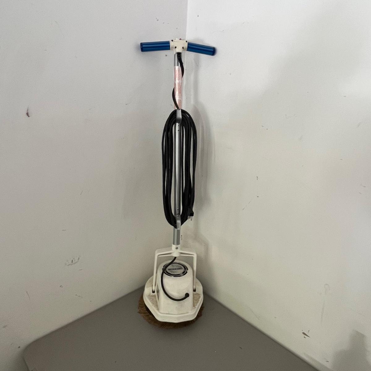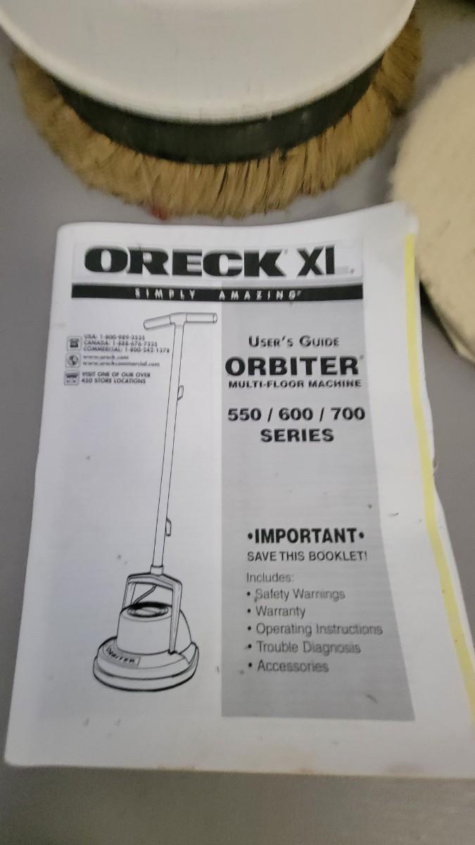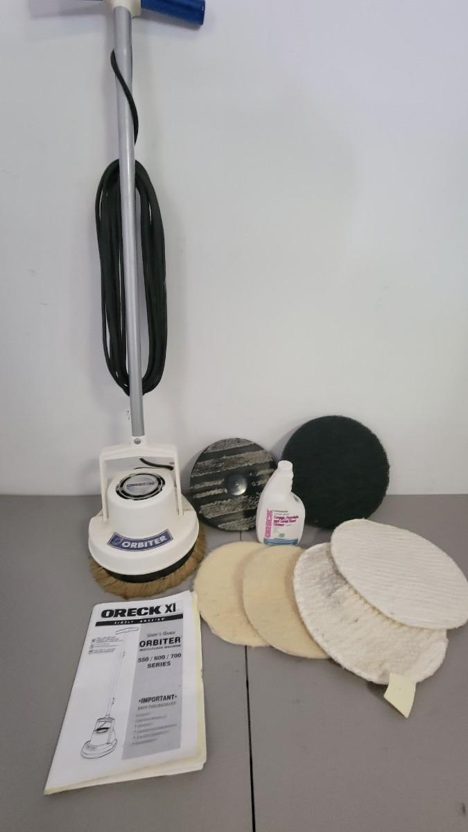 Oreck Orbiter multi floor machine and instruction manual. Includes multiple different cleaning attachment heads and a bottle of Oreck grunge attack cleaner. Measures approximately 10" x 11" x 45" Cleaner tested and works. Local pickup only