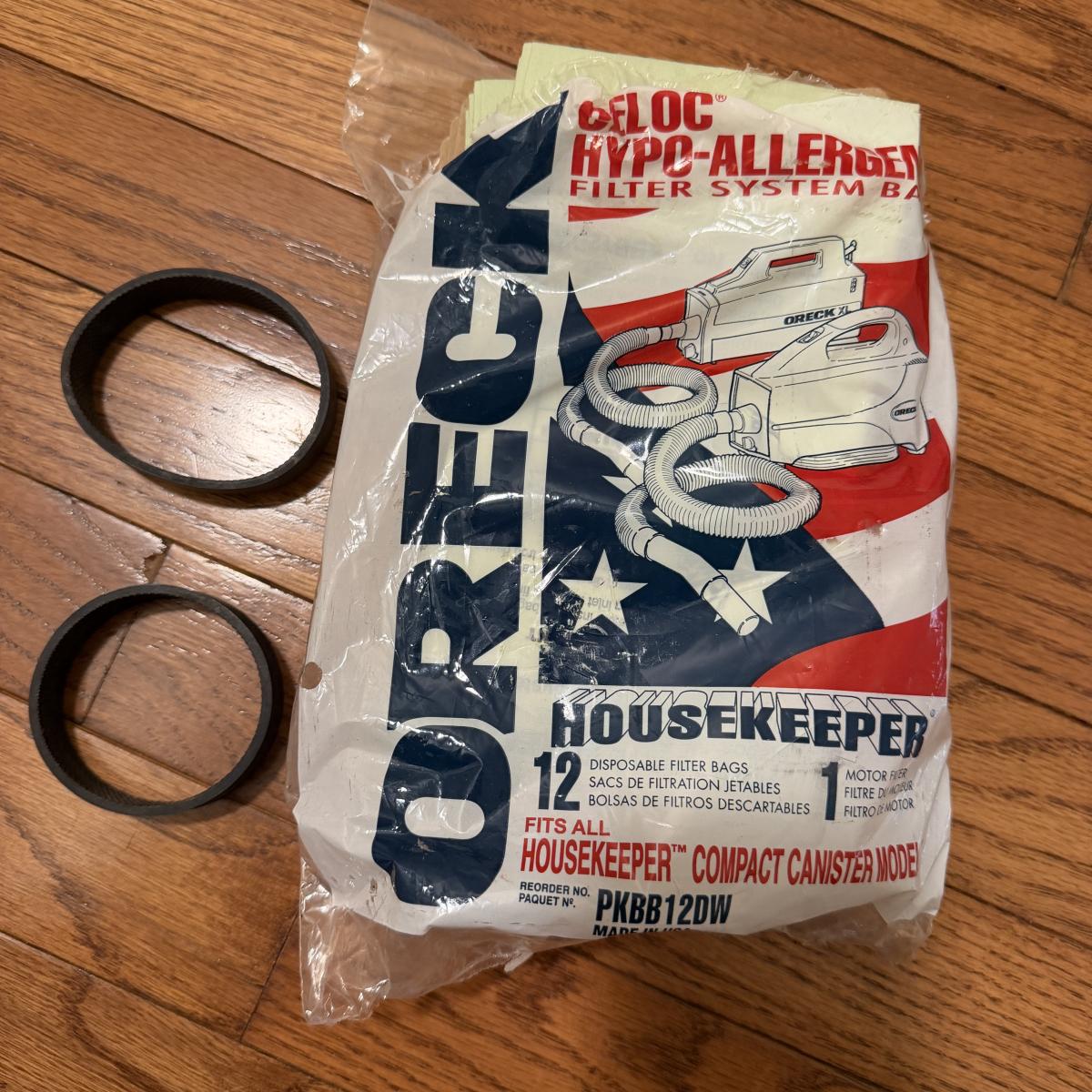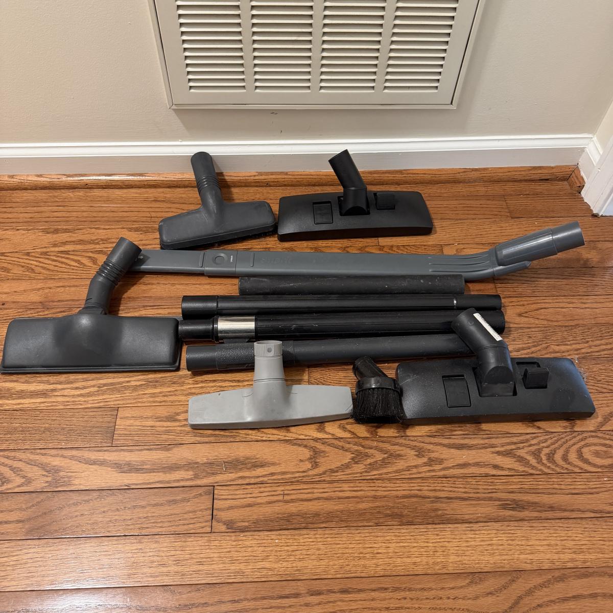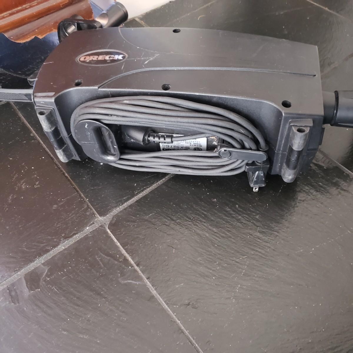 Lot includes an Oreck canister vacuum that powered on when plugged in. Vacuum does not have wheels. It has a strap for carrying. Also includes a large selection of attachments.