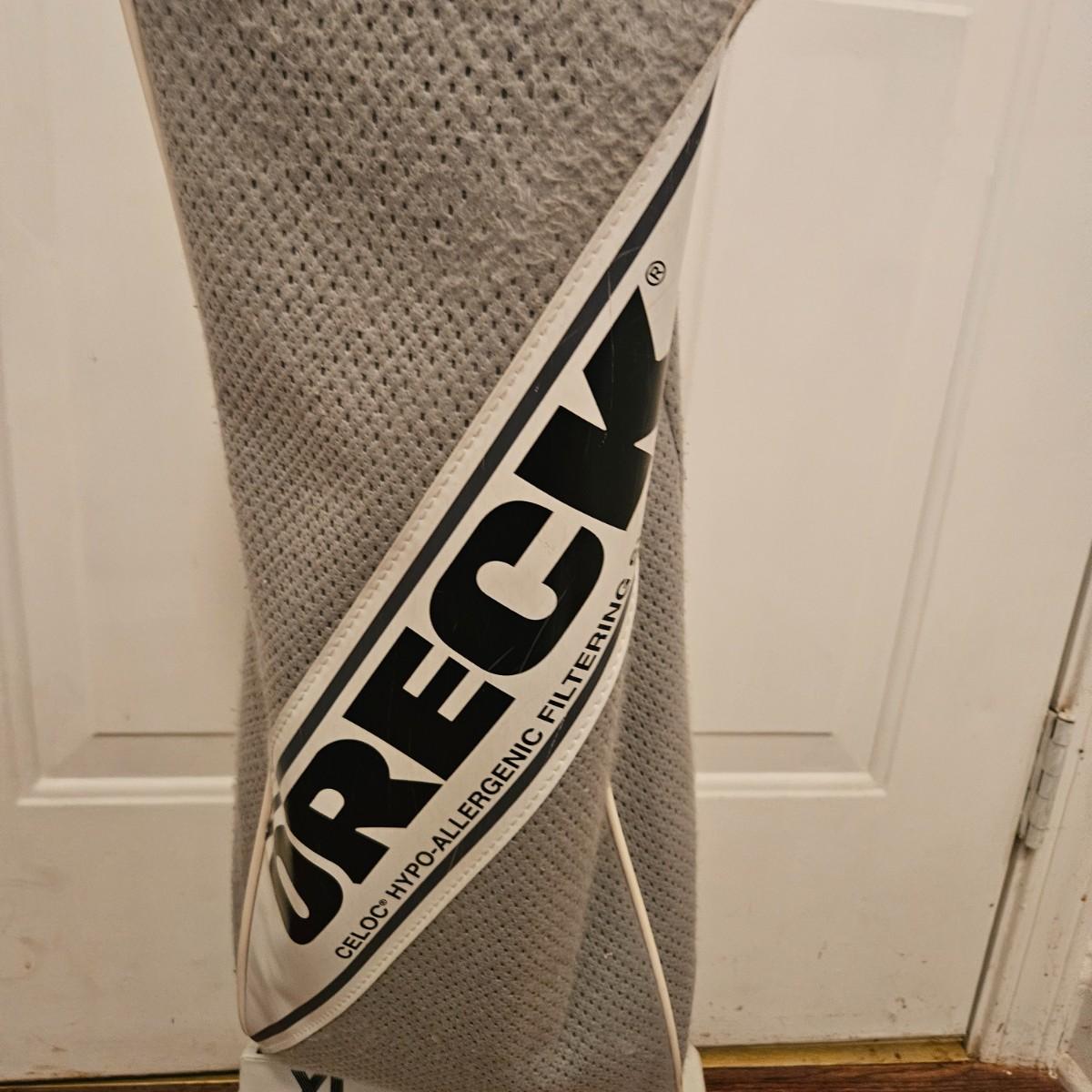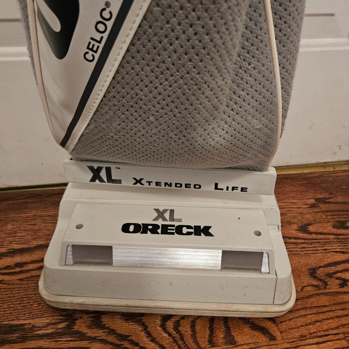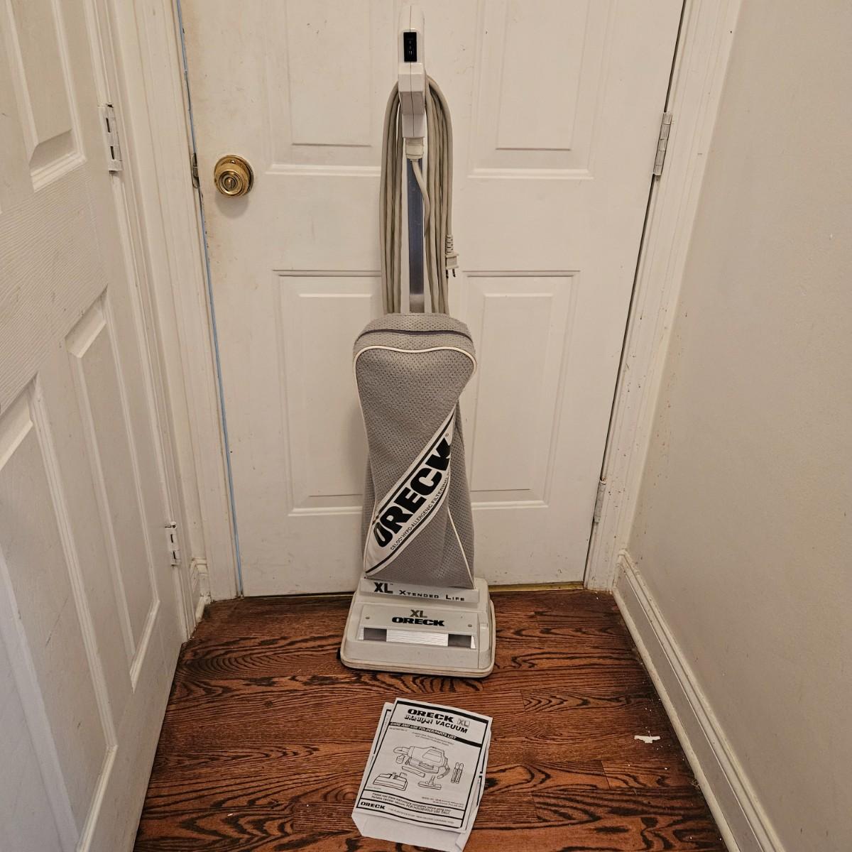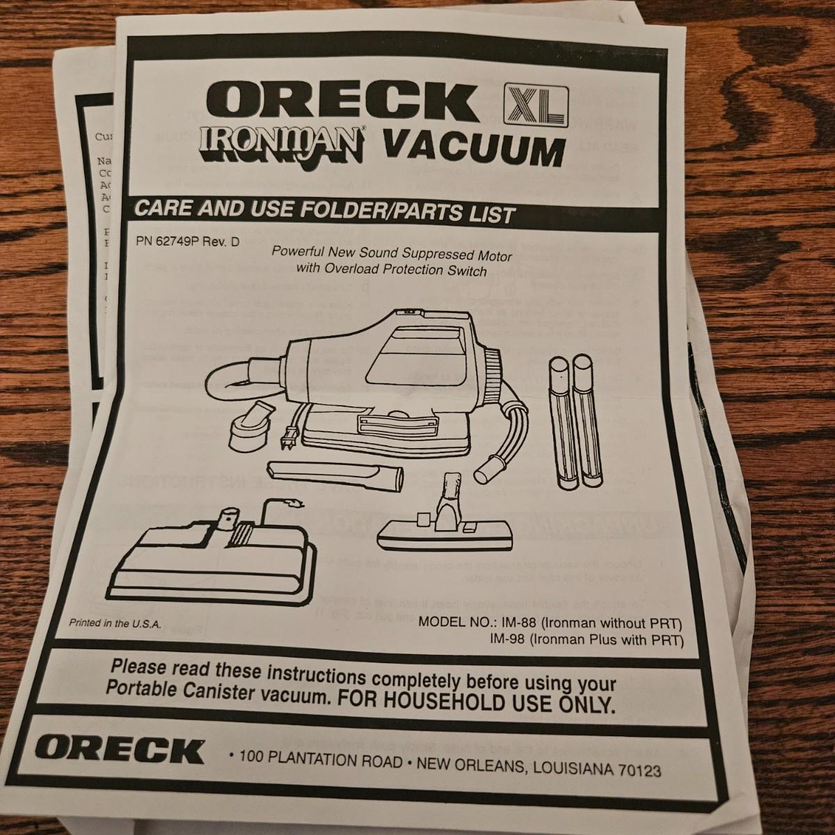 An Oreck XL Ironman vacuum that powered on when plugged in. It includes the original manual and receipt, and measures approximately 12.5" x 9" x 48"H. Local pickup only