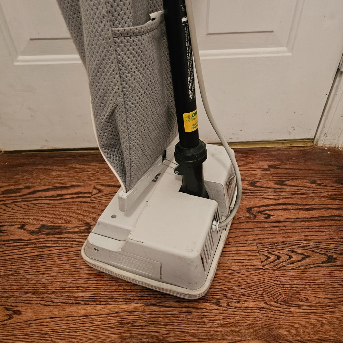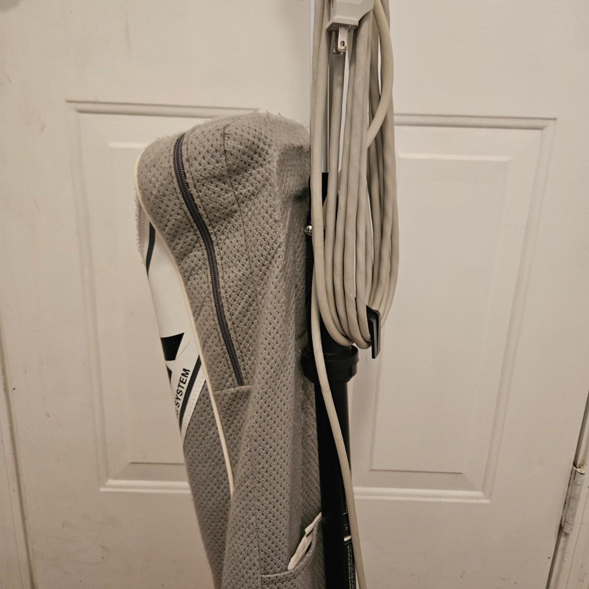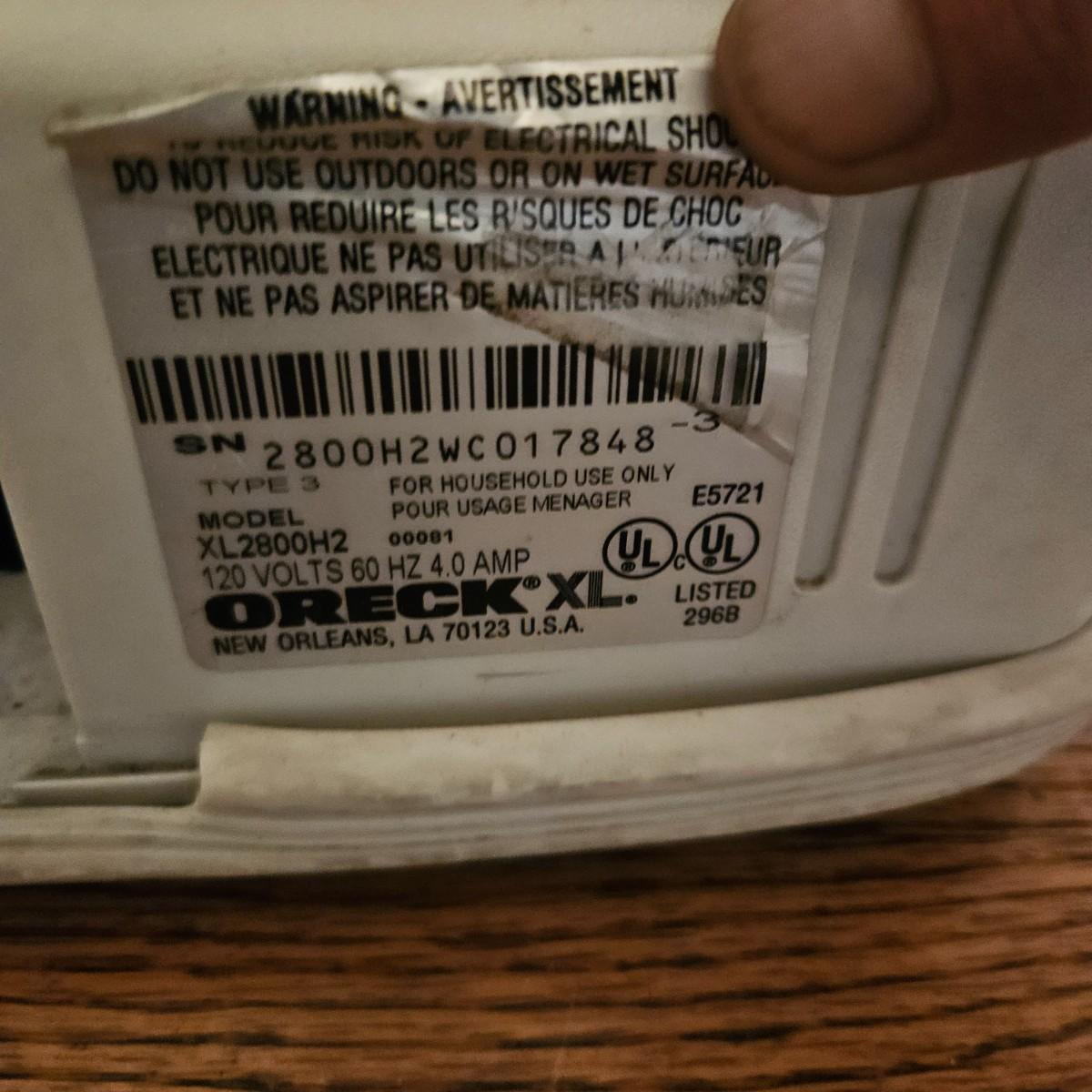 An Oreck XL Ironman vacuum that powered on when plugged in. It includes the original manual and receipt, and measures approximately 12.5" x 9" x 48"H. Local pickup only