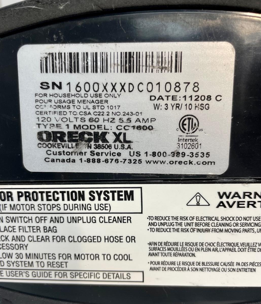 Oreck XL vacuum. Model CC1600. Includes all attachments and shoulder strap.Tested, works well.
