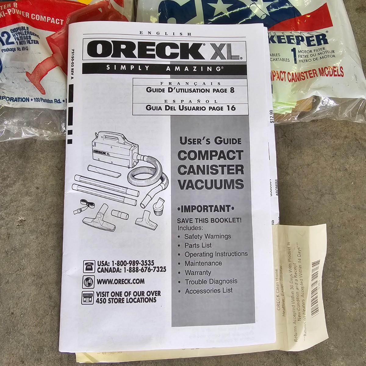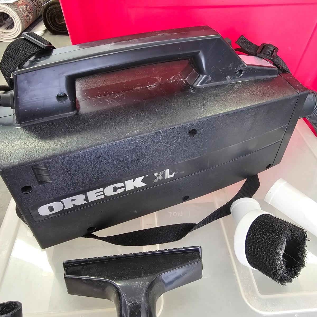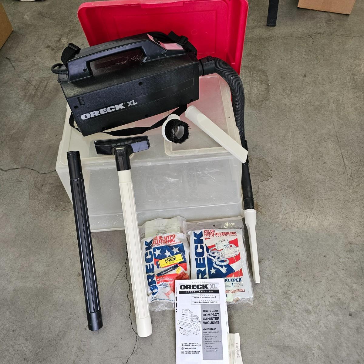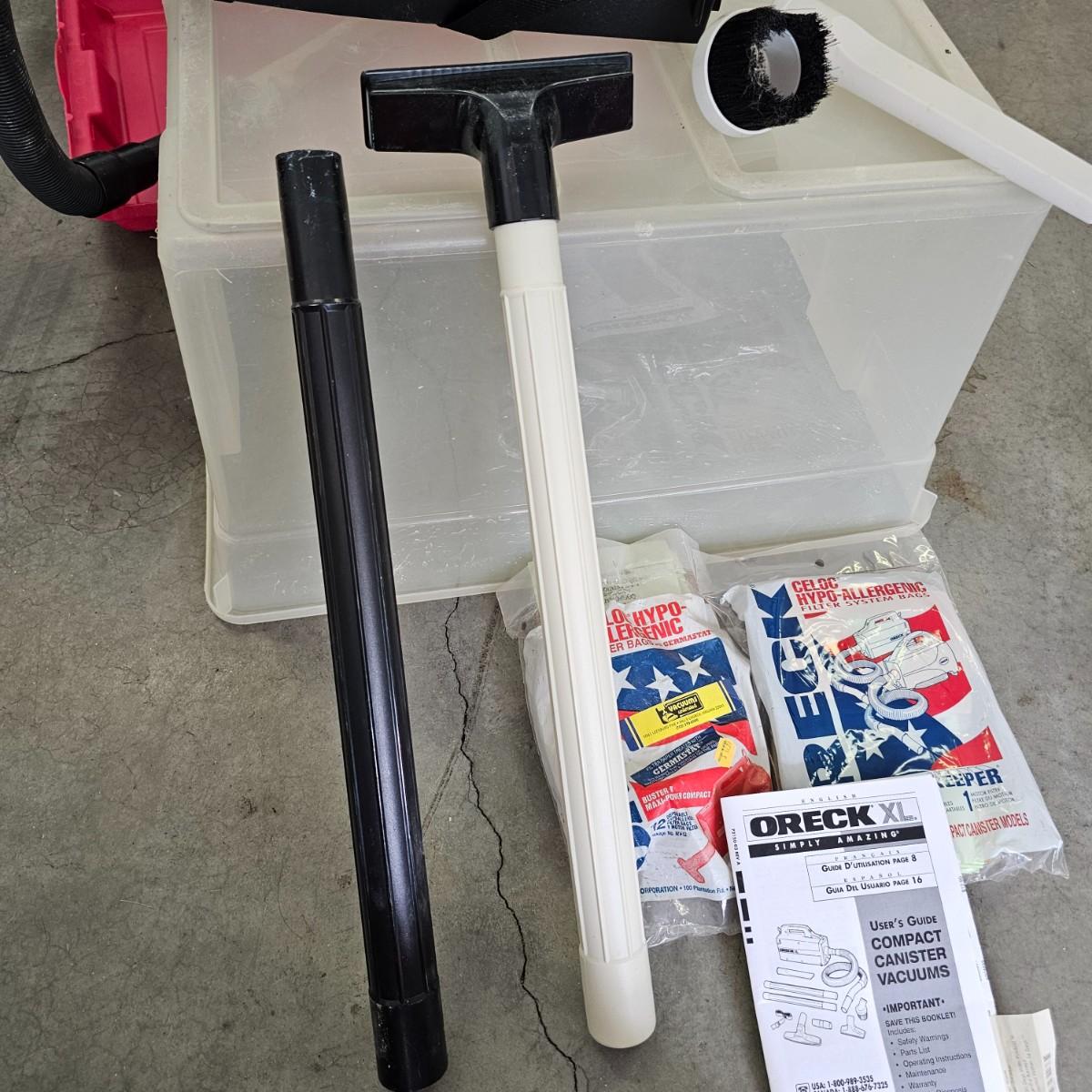 One compact canister vacuum and accessories by Oreck. Includes shoulder strap, two 18" extension tubes, crevice tools, a brush, replacement bags and instruction manual. Also comes with tub provided for storage. Item powered on when plugged in. See photos for details. Local pickup only.