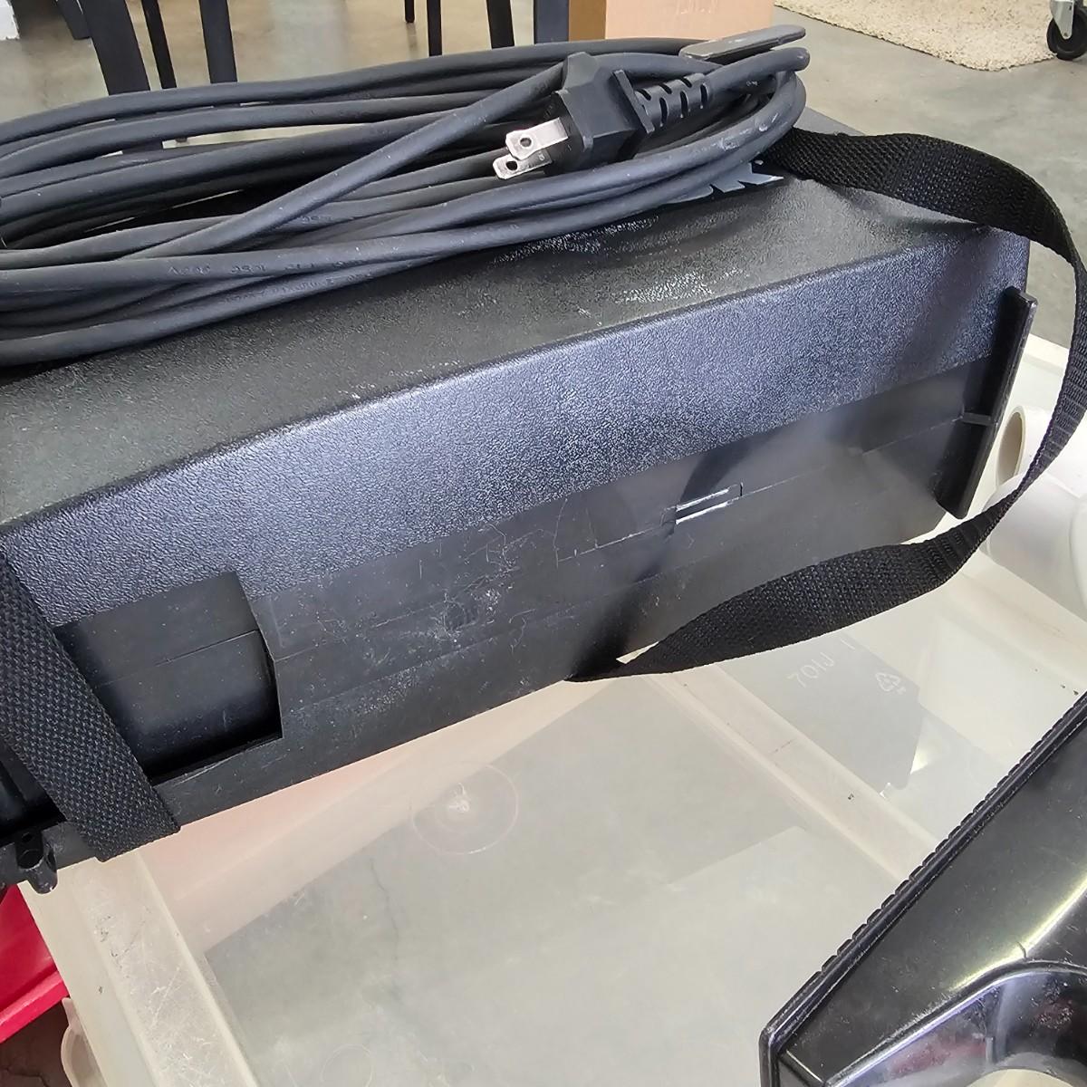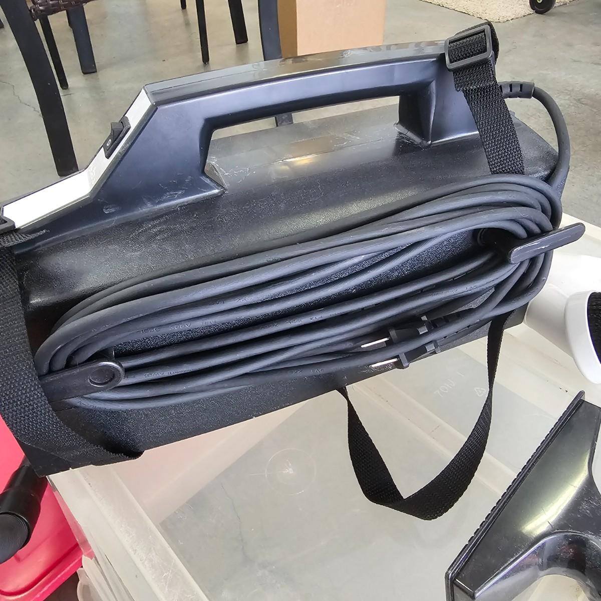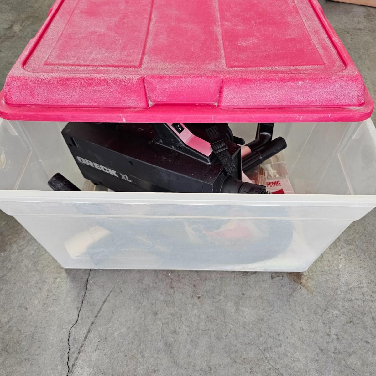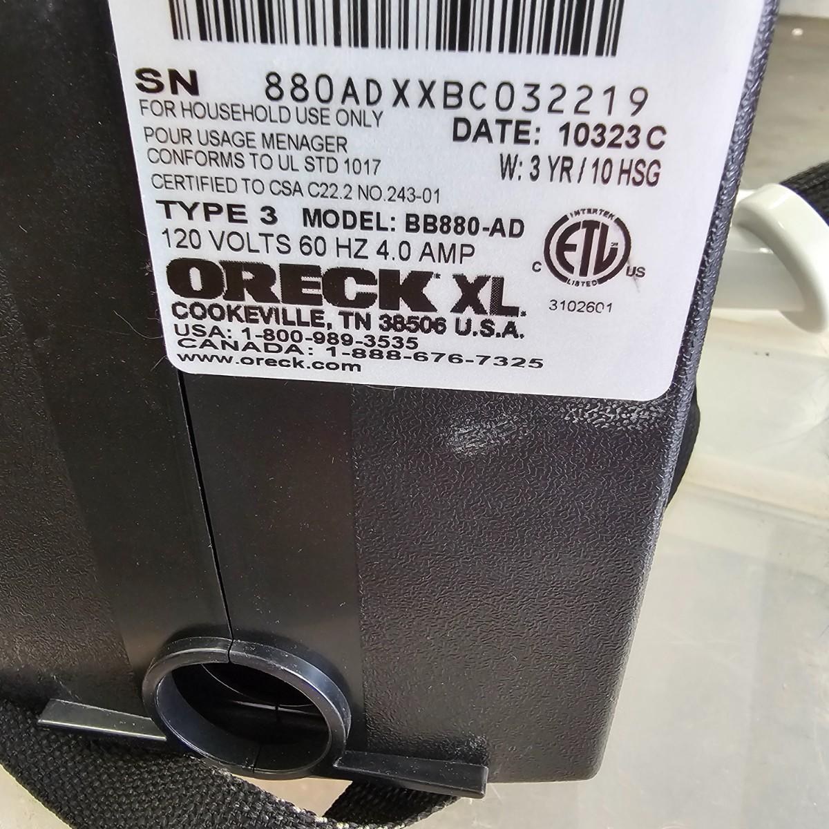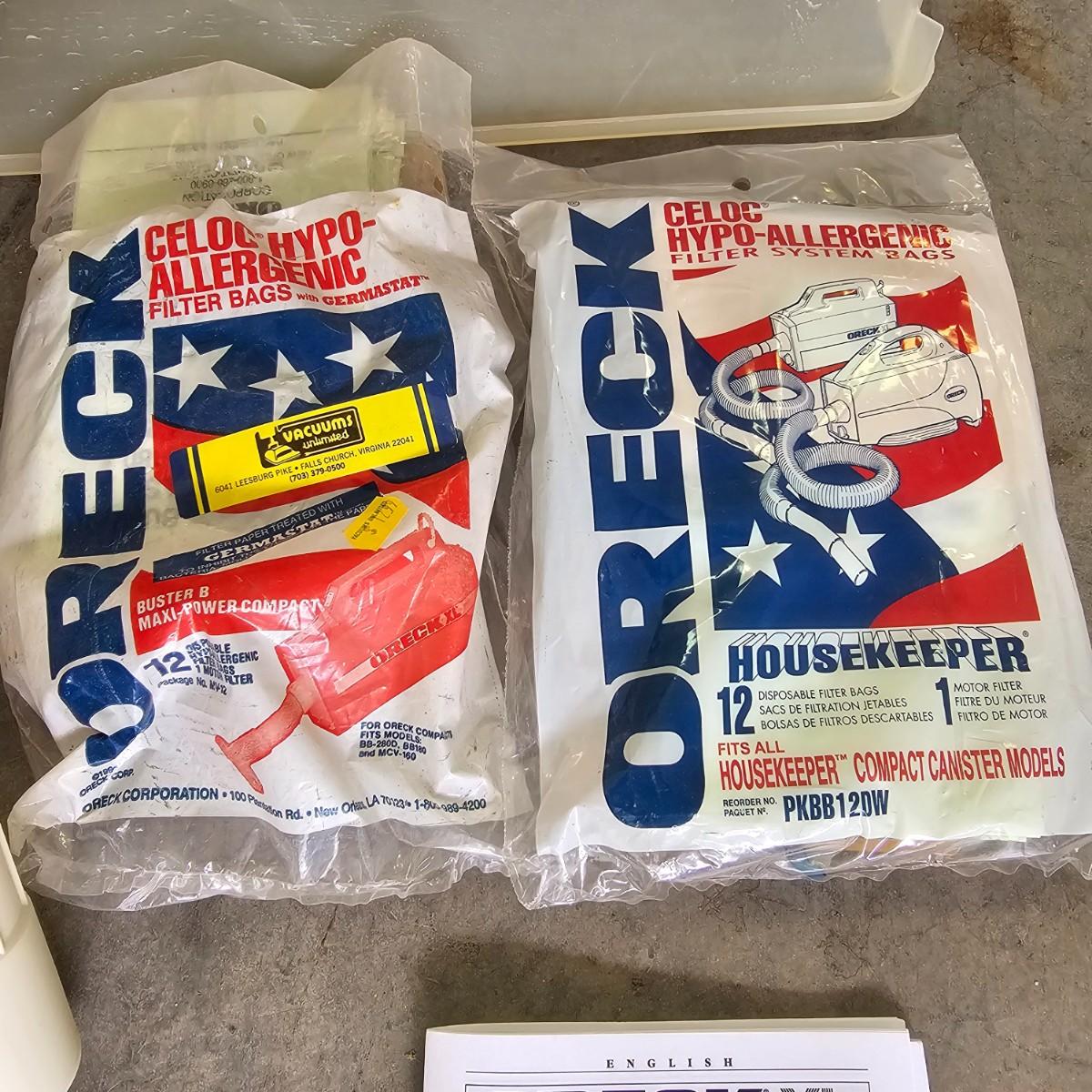 One compact canister vacuum and accessories by Oreck. Includes shoulder strap, two 18" extension tubes, crevice tools, a brush, replacement bags and instruction manual. Also comes with tub provided for storage. Item powered on when plugged in. See photos for details. Local pickup only.