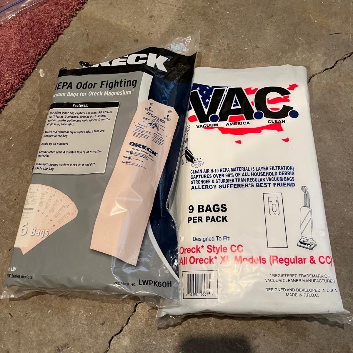 Lot includes an Oreck XL2 Ultra upright vacuum with extra vacuum bags and a Ryobi Evercharge cordless hand vacuum. Both vacuums powered on when tested.