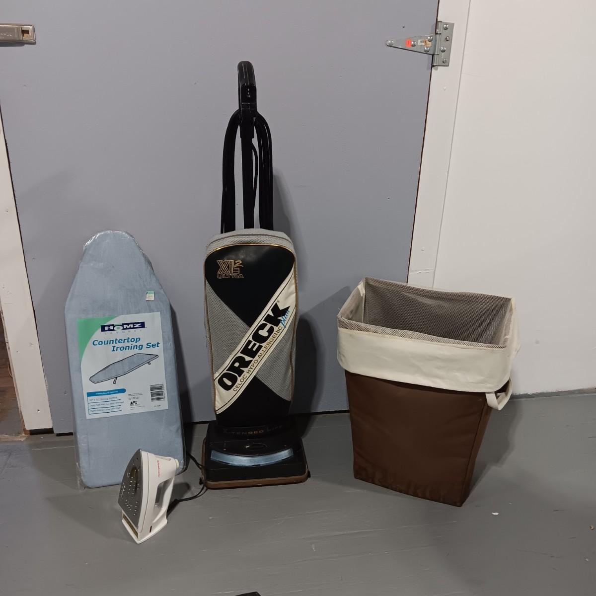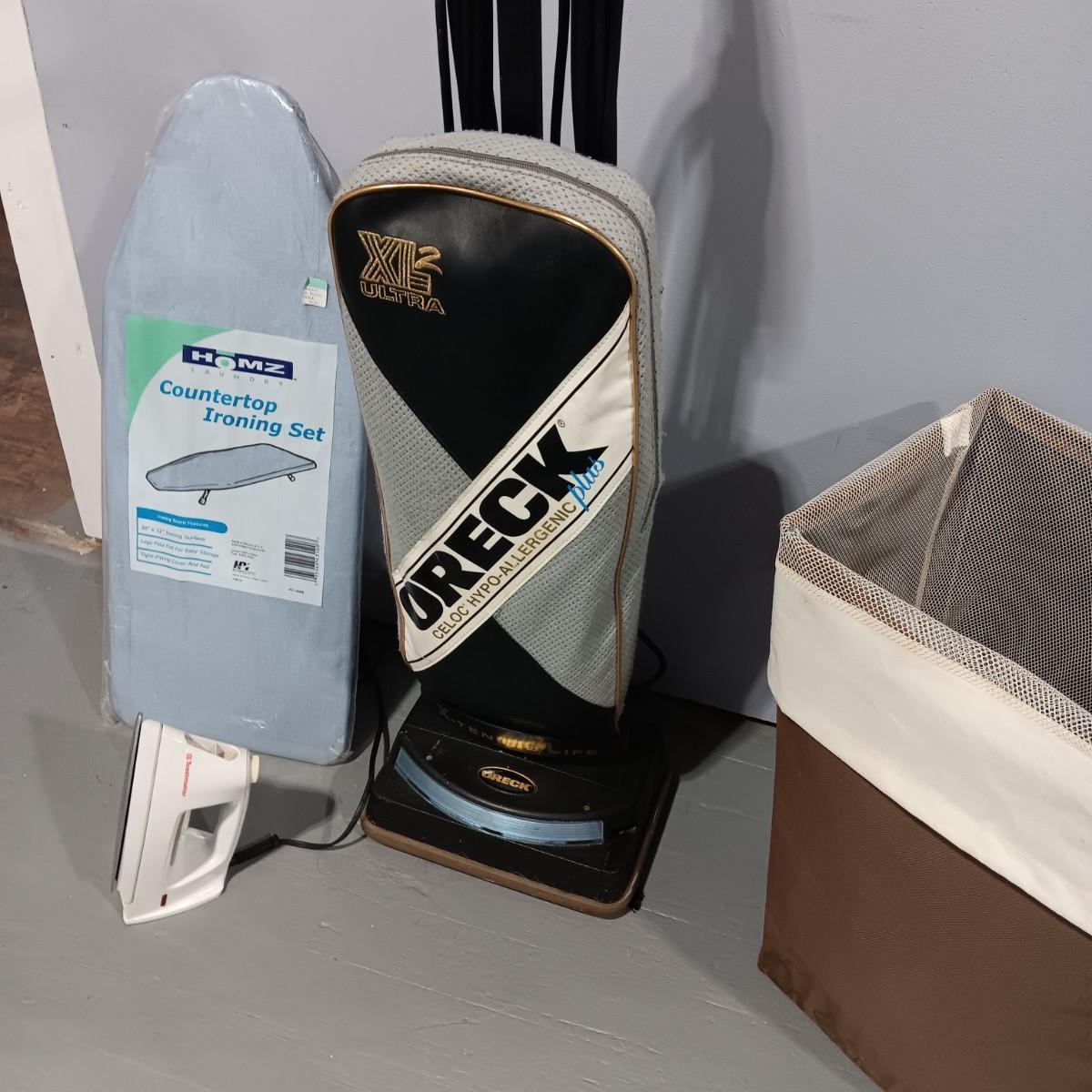 ORECK XTENDED LIFE VACUUM, CLOTHES HAMPER, IRON AND BOARD