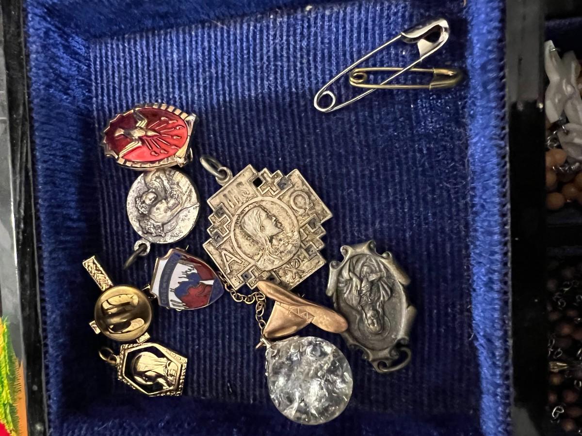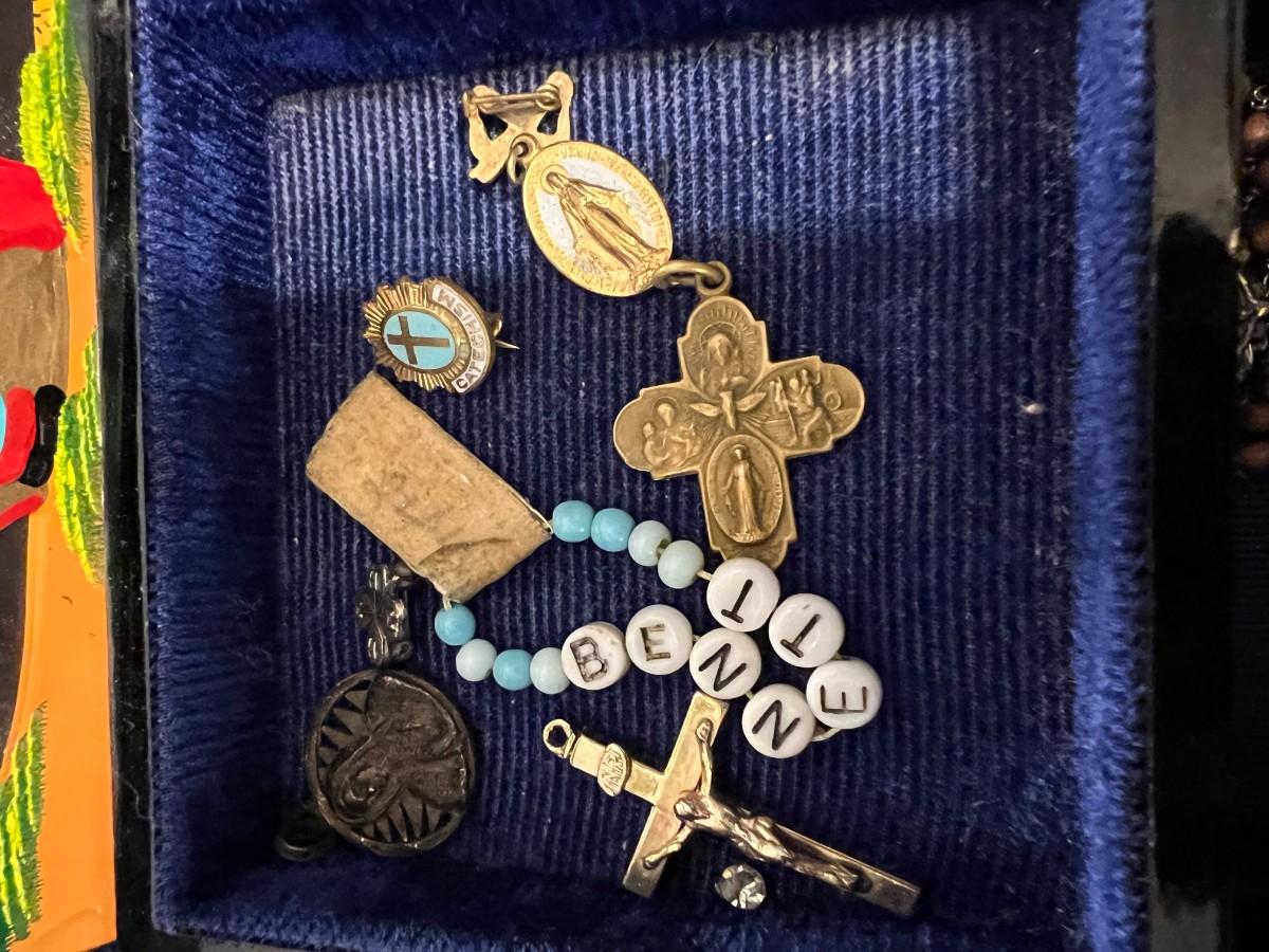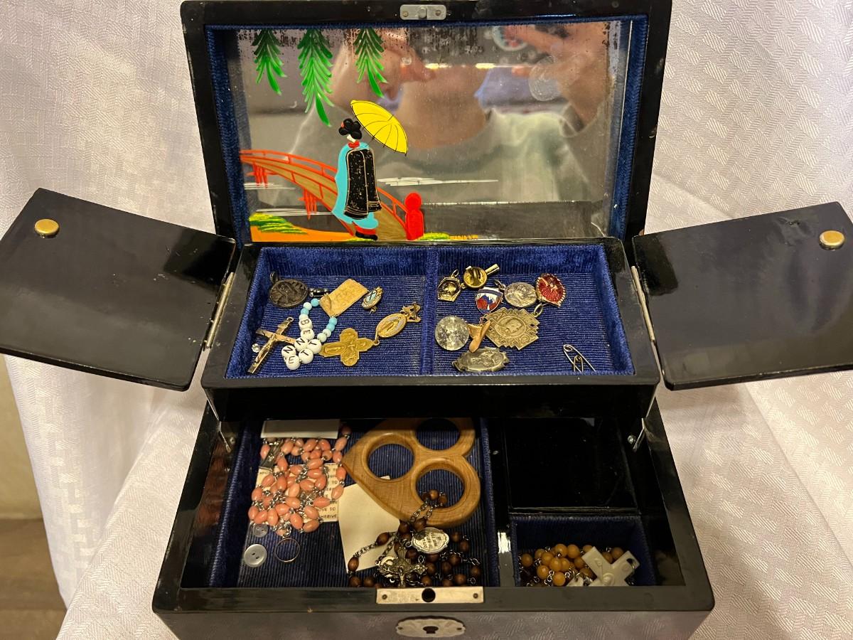ORIENTAL JEWELRY BOX, ROSARIES AND RELIGIOUS MEDALS.