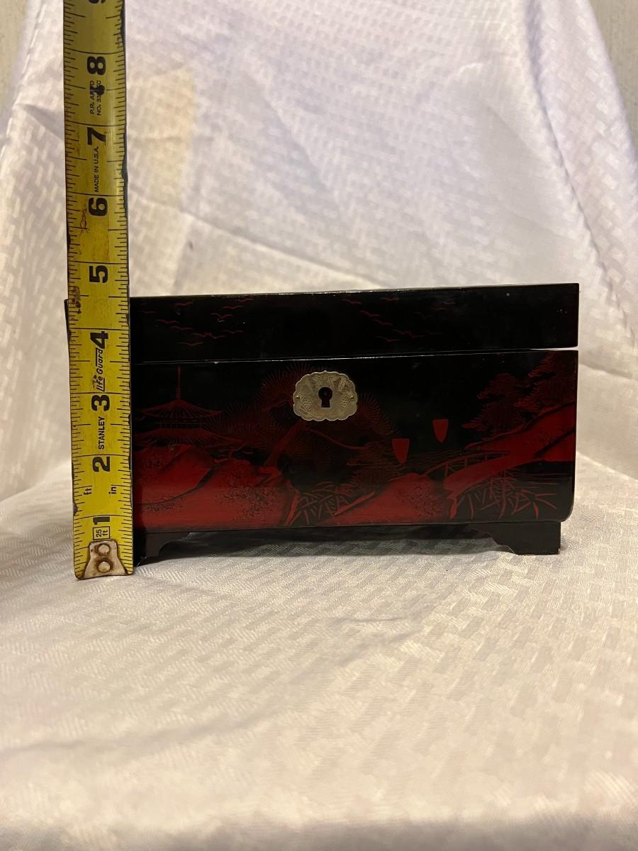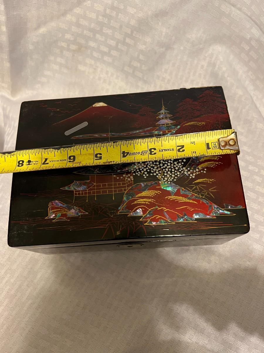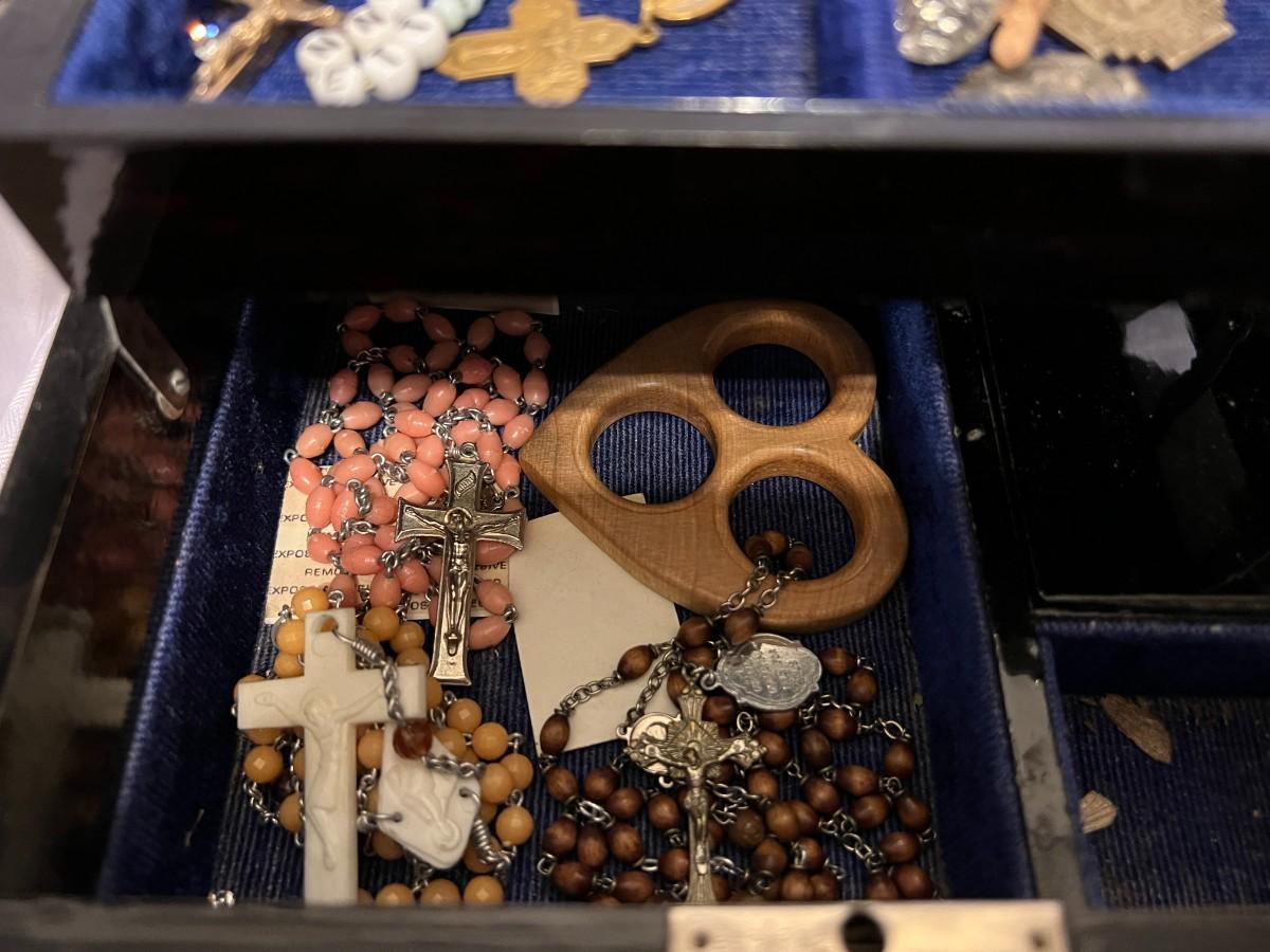 ORIENTAL JEWELRY BOX, ROSARIES AND RELIGIOUS MEDALS.