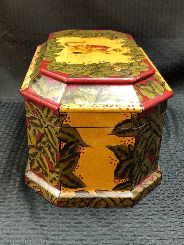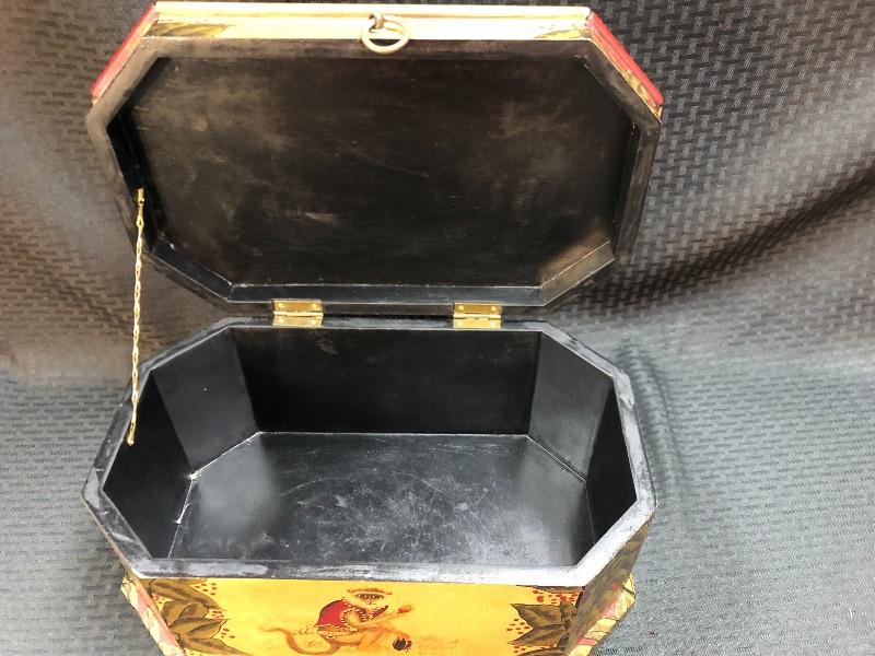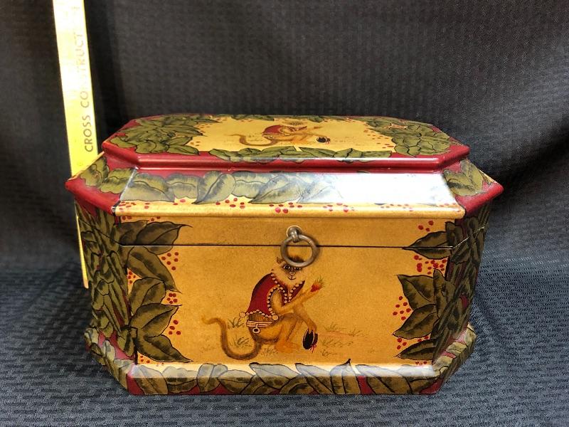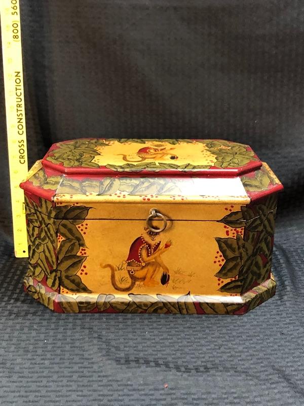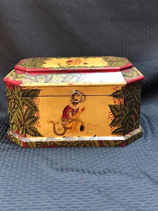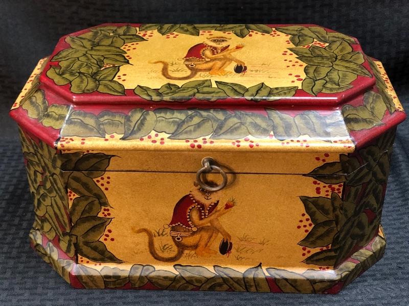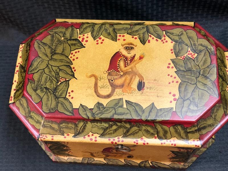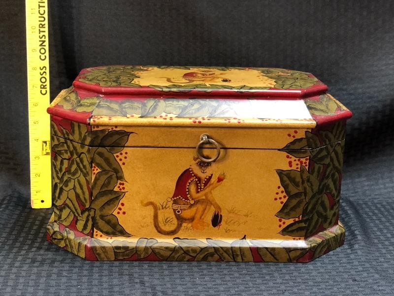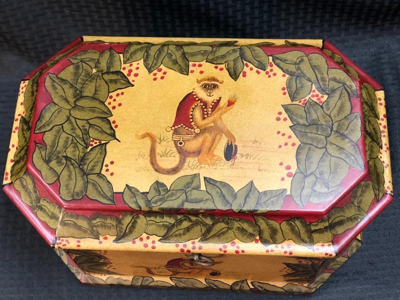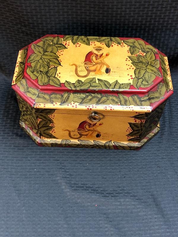 Wood decorative trinket box featuring a organ grinders circus monkey on it. Good size about 8" tall. Minor signs of use, displays nicely.