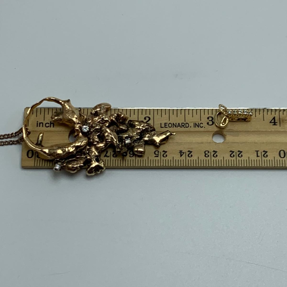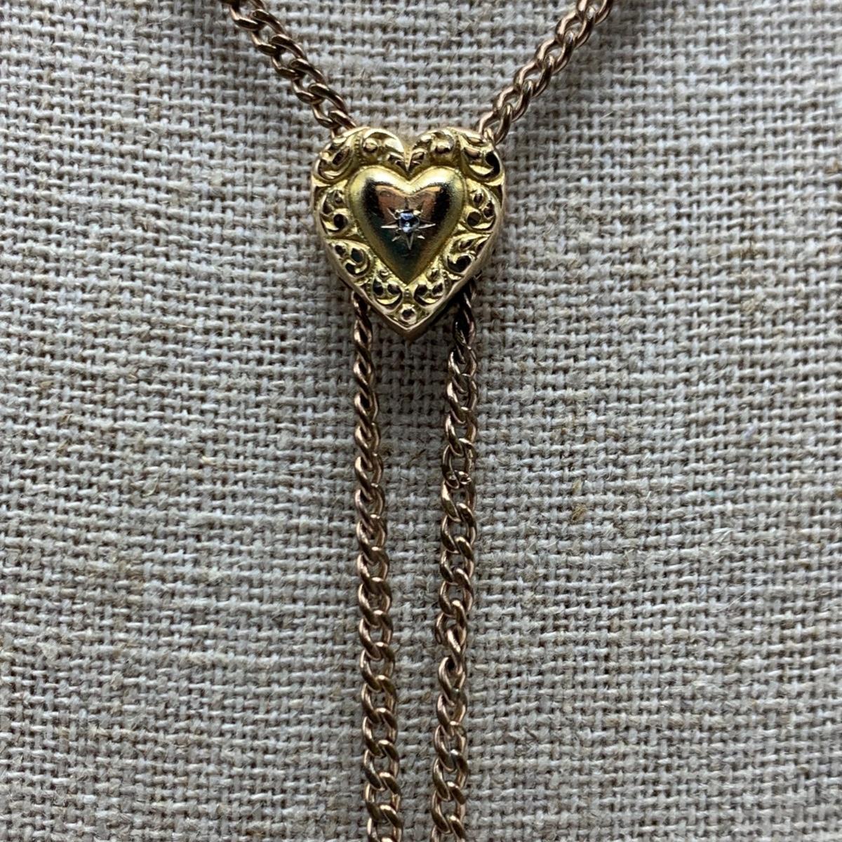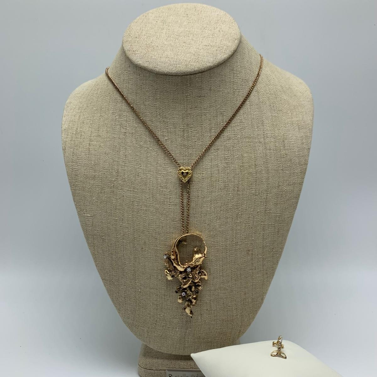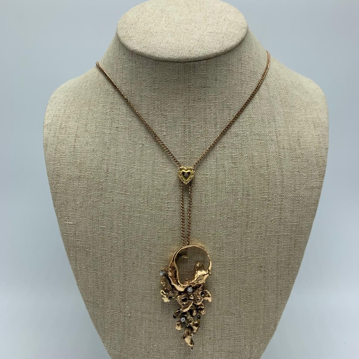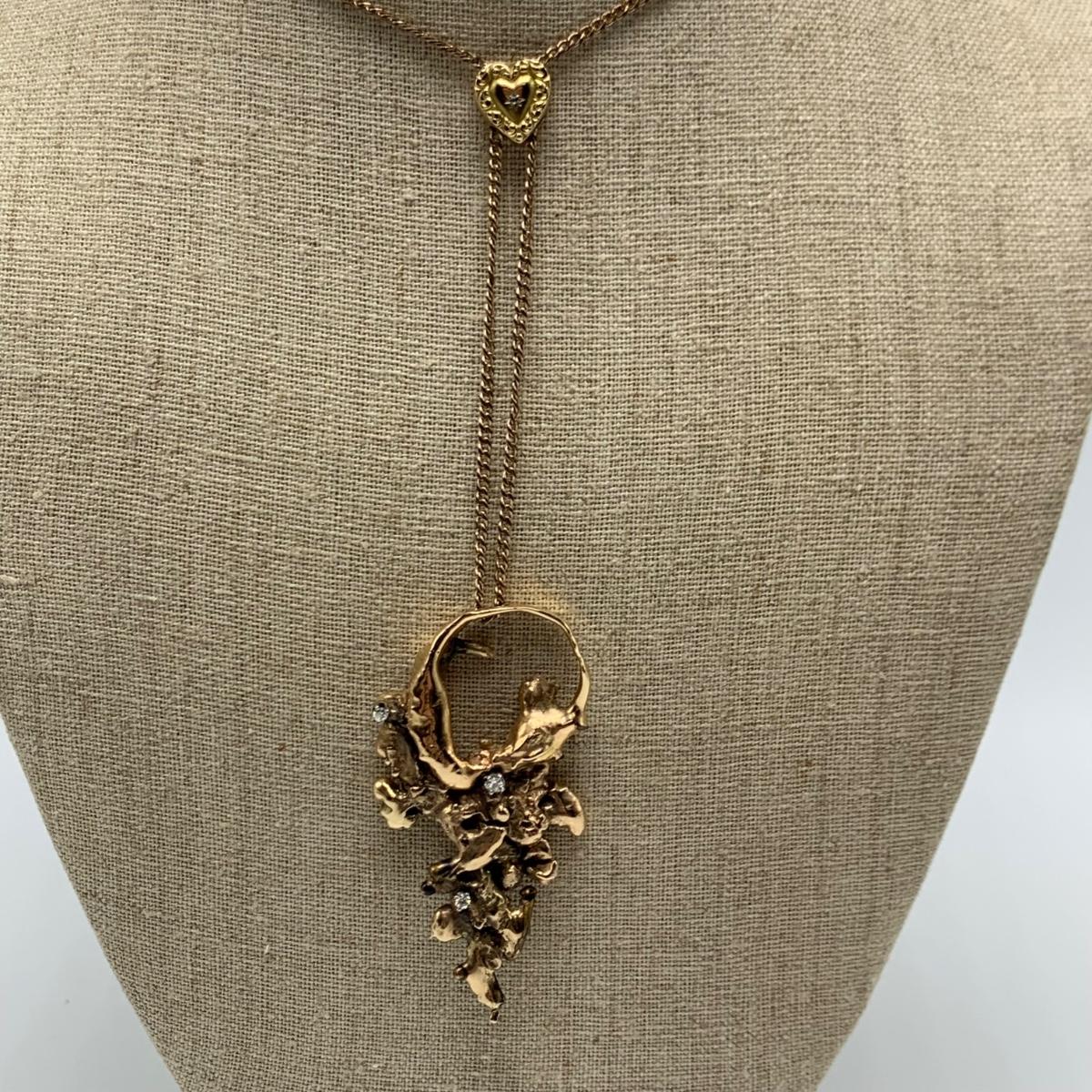 A very unique and beautiful organically-shaped gold-colored metal pendant on a golden necklace chain with a movable heart pendant attached that can slide up or down to tighten or loosen the necklace like in the style of a bolo tie. The clasp of the necklace chain is marked “˜1/20 12K’. The necklace chain is approximately 28”. The small pendant/clasp appears to be stamped 14K. Our Diamond tester indicated that all gemstones on both pendants are diamonds (9 total). All sales are final. No returns or refunds. Please bid accordingly.