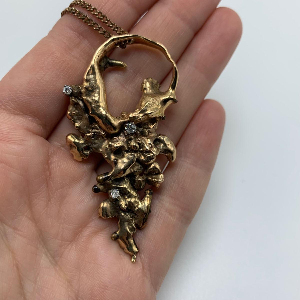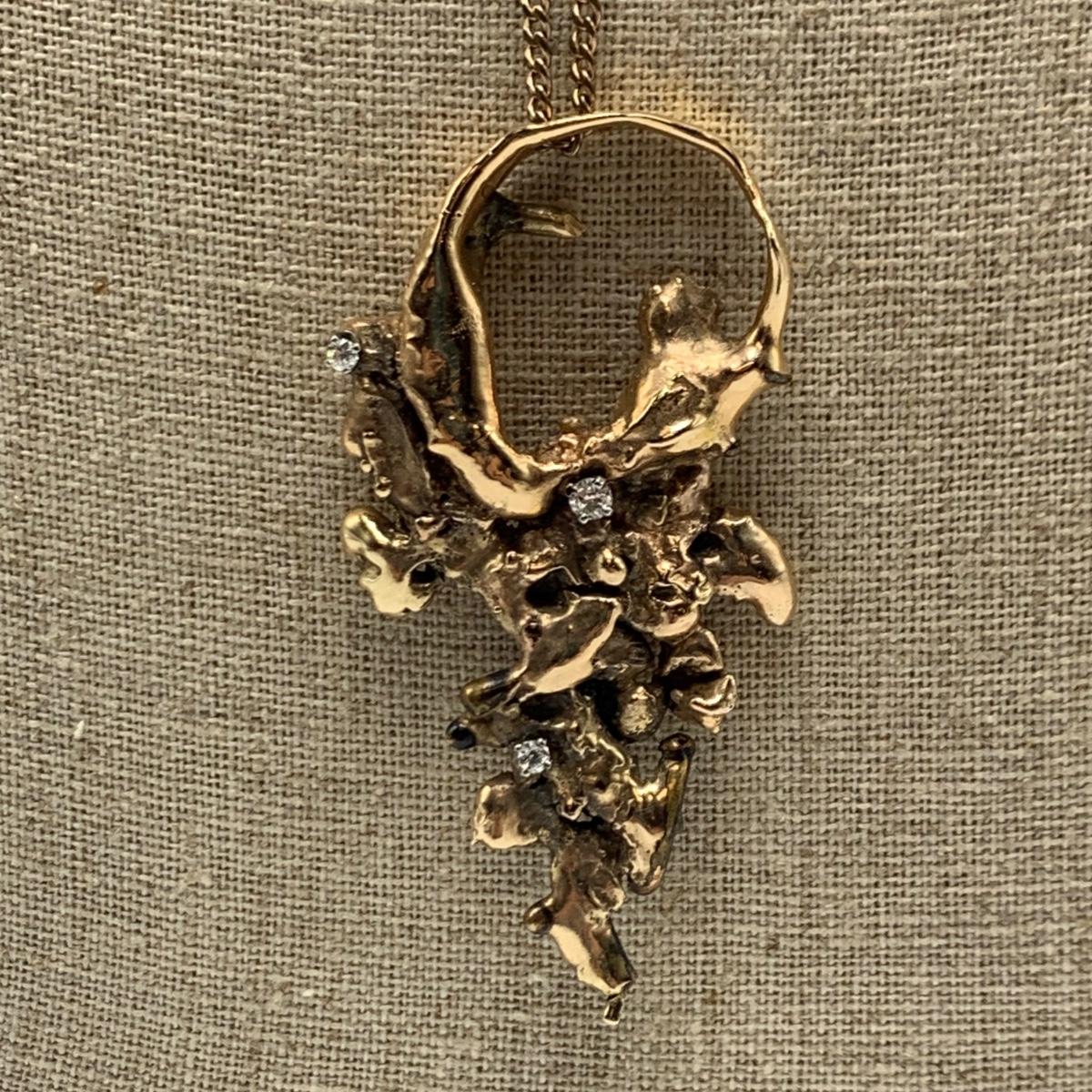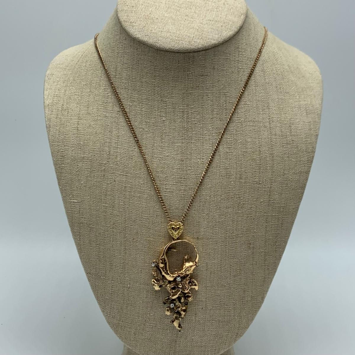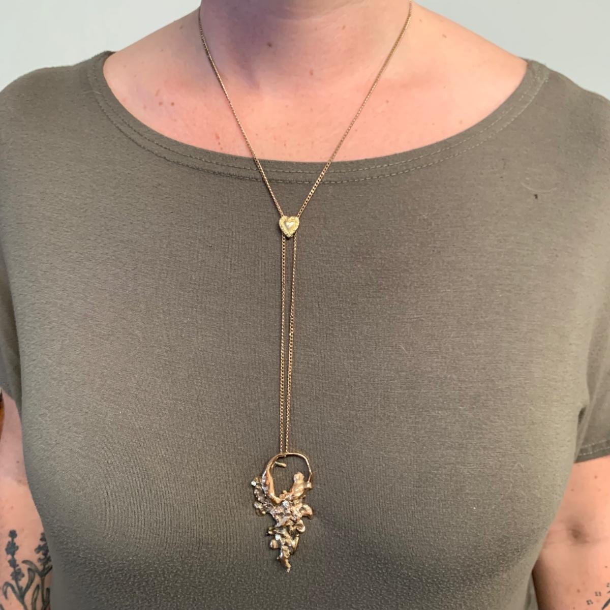A very unique and beautiful organically-shaped gold-colored metal pendant on a golden necklace chain with a movable heart pendant attached that can slide up or down to tighten or loosen the necklace like in the style of a bolo tie. The clasp of the necklace chain is marked “˜1/20 12K’. The necklace chain is approximately 28”. The small pendant/clasp appears to be stamped 14K. Our Diamond tester indicated that all gemstones on both pendants are diamonds (9 total). All sales are final. No returns or refunds. Please bid accordingly.