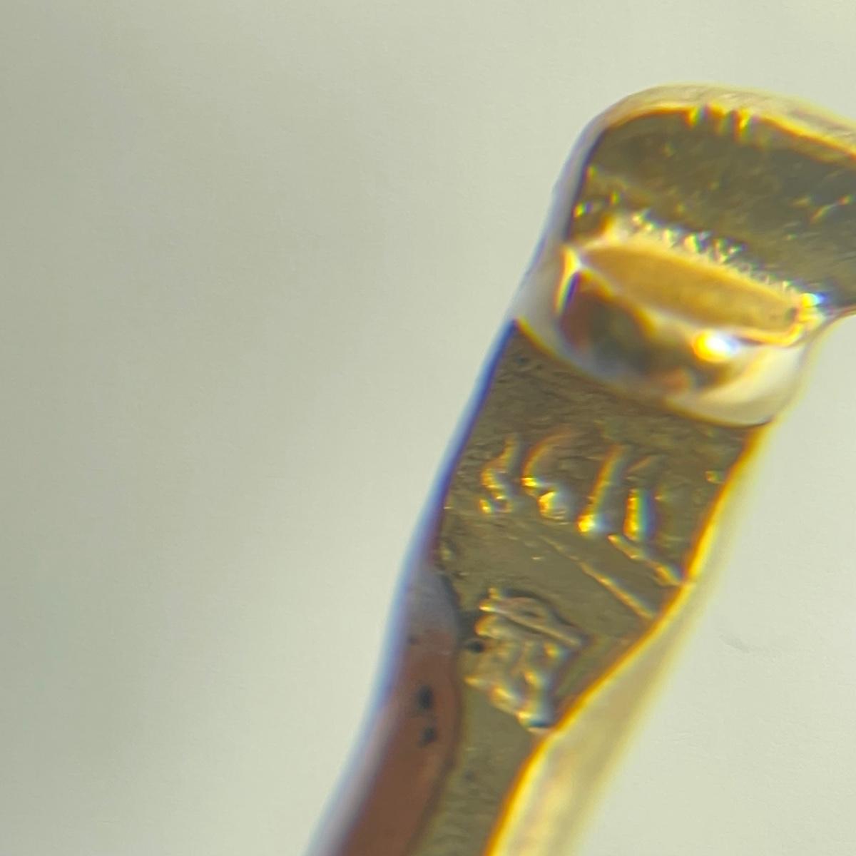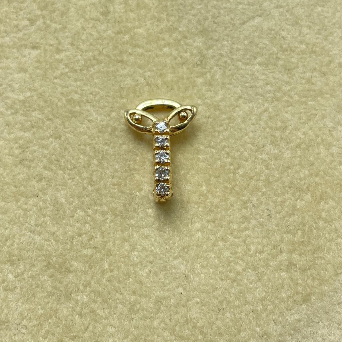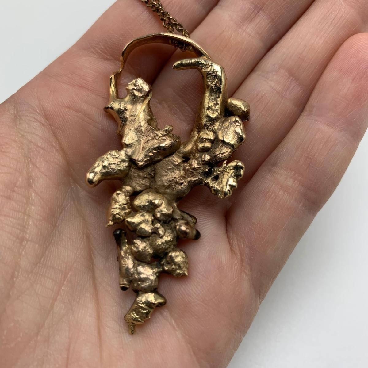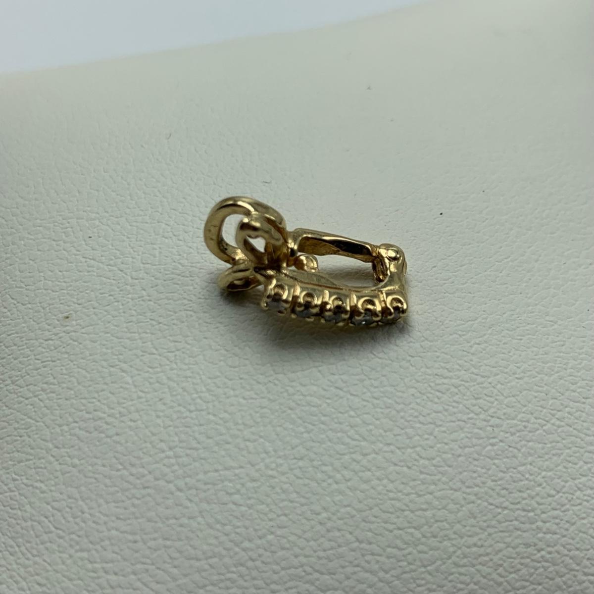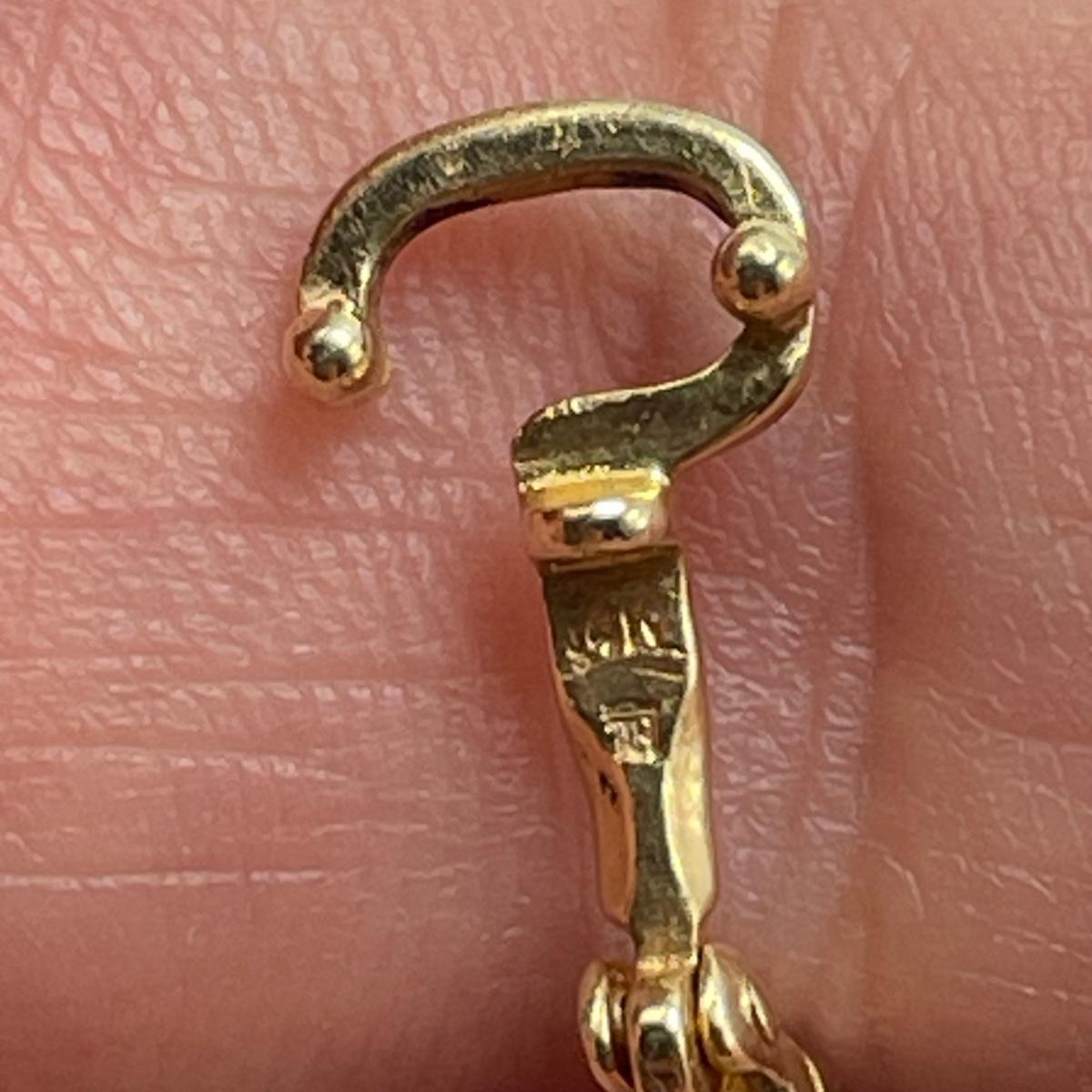 A very unique and beautiful organically-shaped gold-colored metal pendant on a golden necklace chain with a movable heart pendant attached that can slide up or down to tighten or loosen the necklace like in the style of a bolo tie. The clasp of the necklace chain is marked “˜1/20 12K’. The necklace chain is approximately 28”. The small pendant/clasp appears to be stamped 14K. Our Diamond tester indicated that all gemstones on both pendants are diamonds (9 total). All sales are final. No returns or refunds. Please bid accordingly.