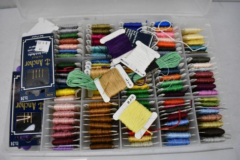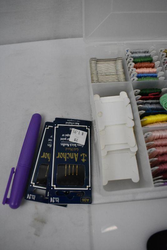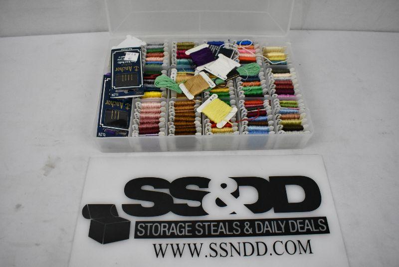 Organizer Bin of DMC Embroidery/Cross Stitch Floss Thread w/ needles & scissors
