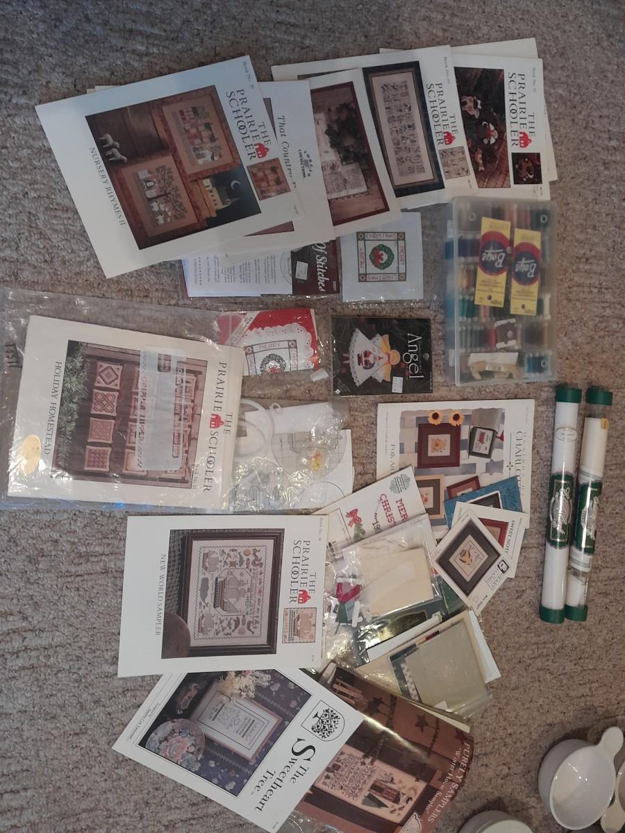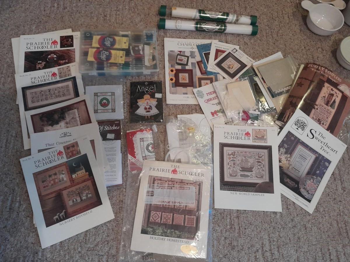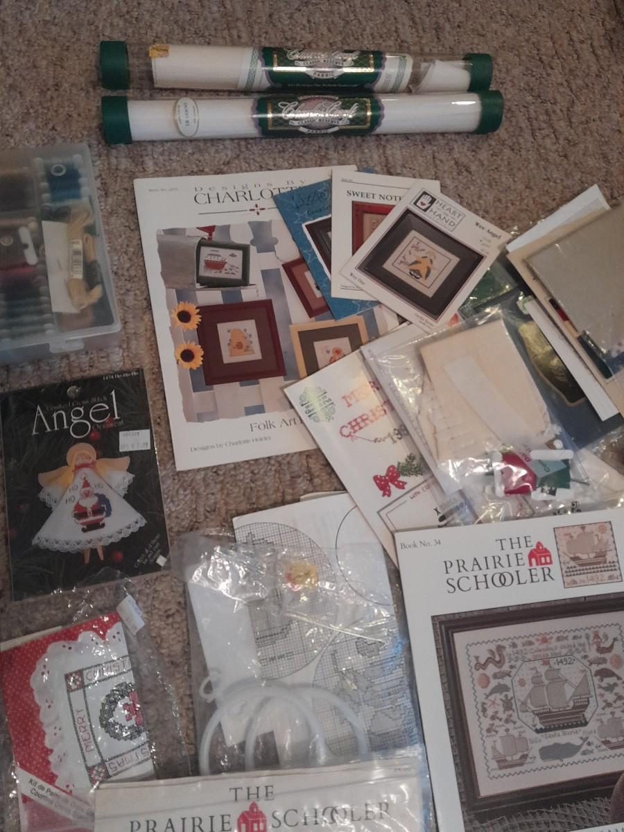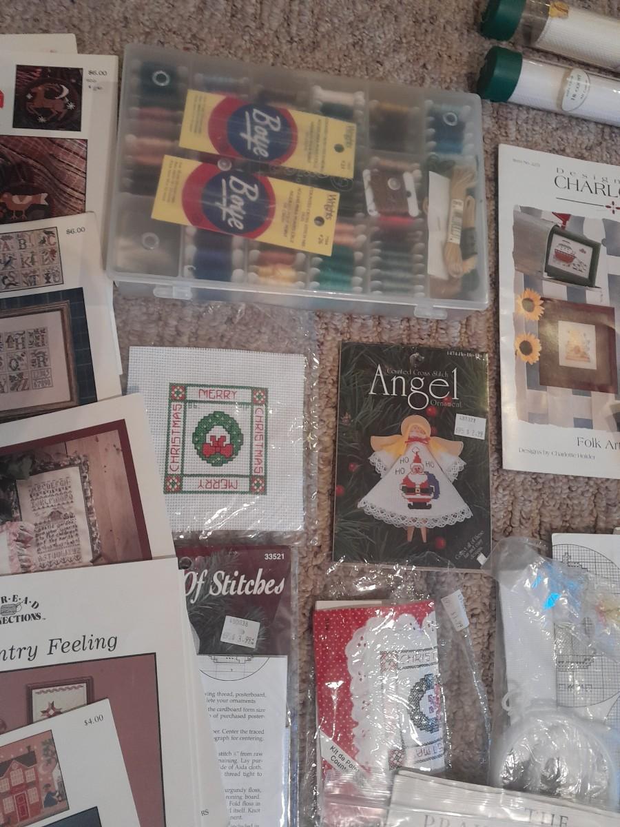 ORGANIZER FULL OF THREAD, CROSS STITCH BOOKLETS, PATTERNS, AND ROLLS OF CANVAS