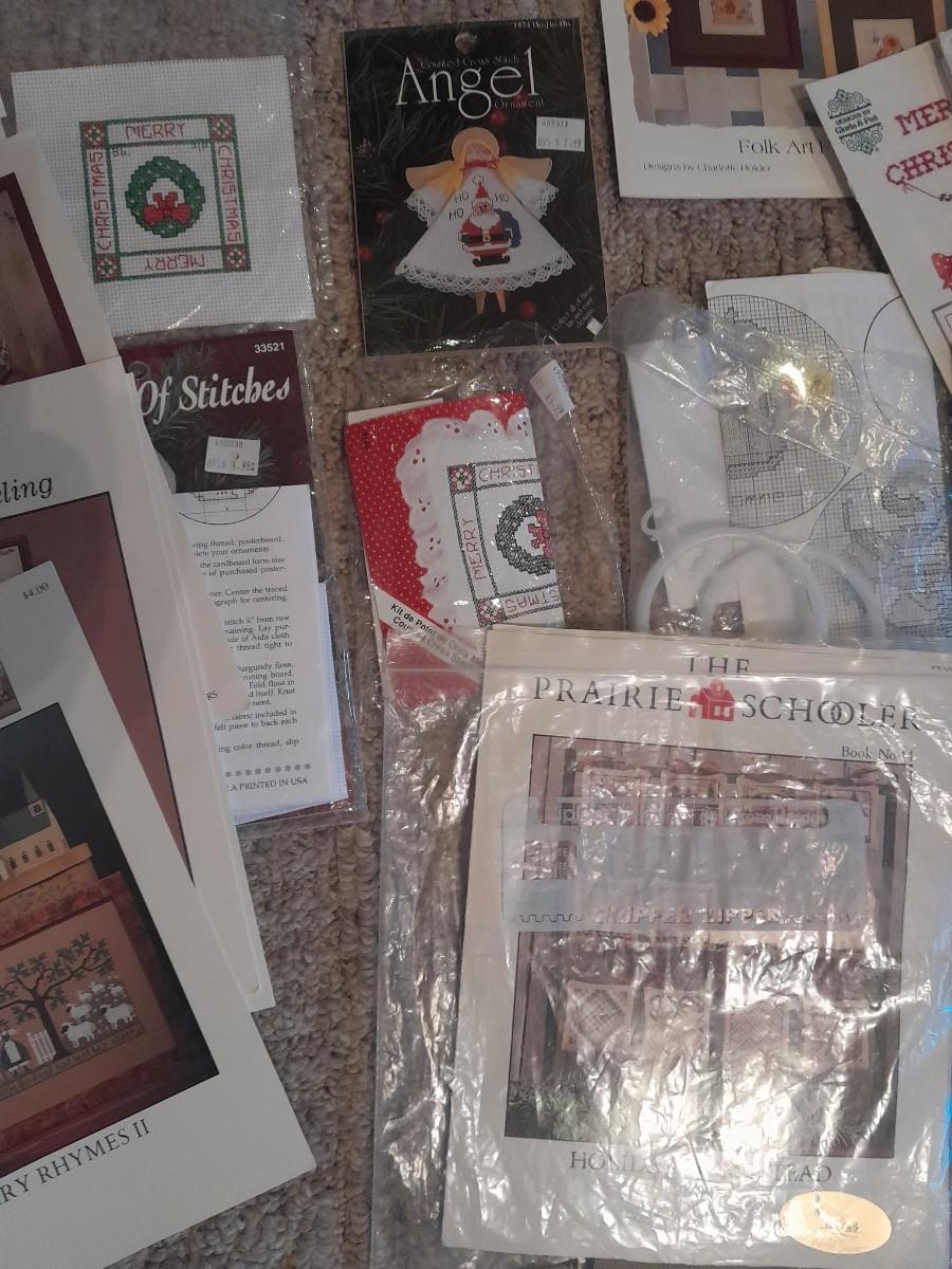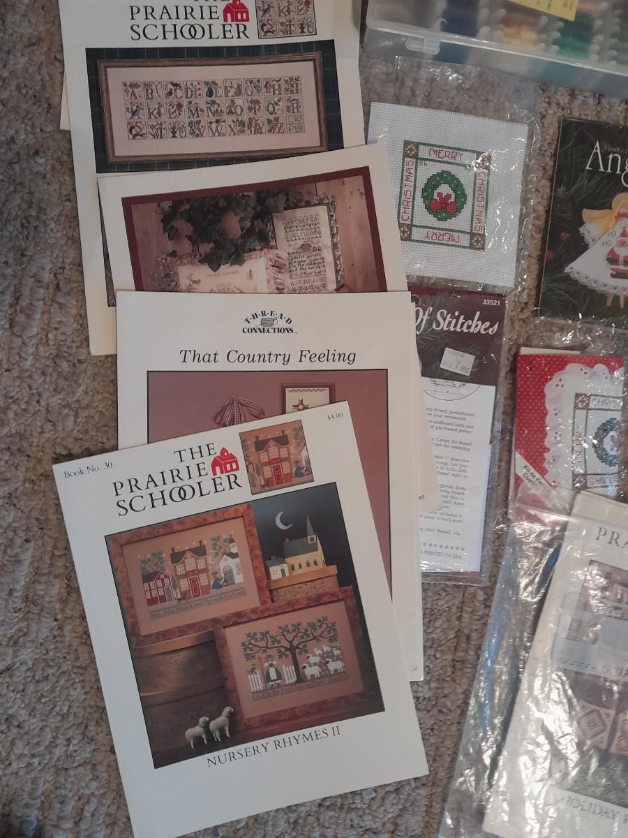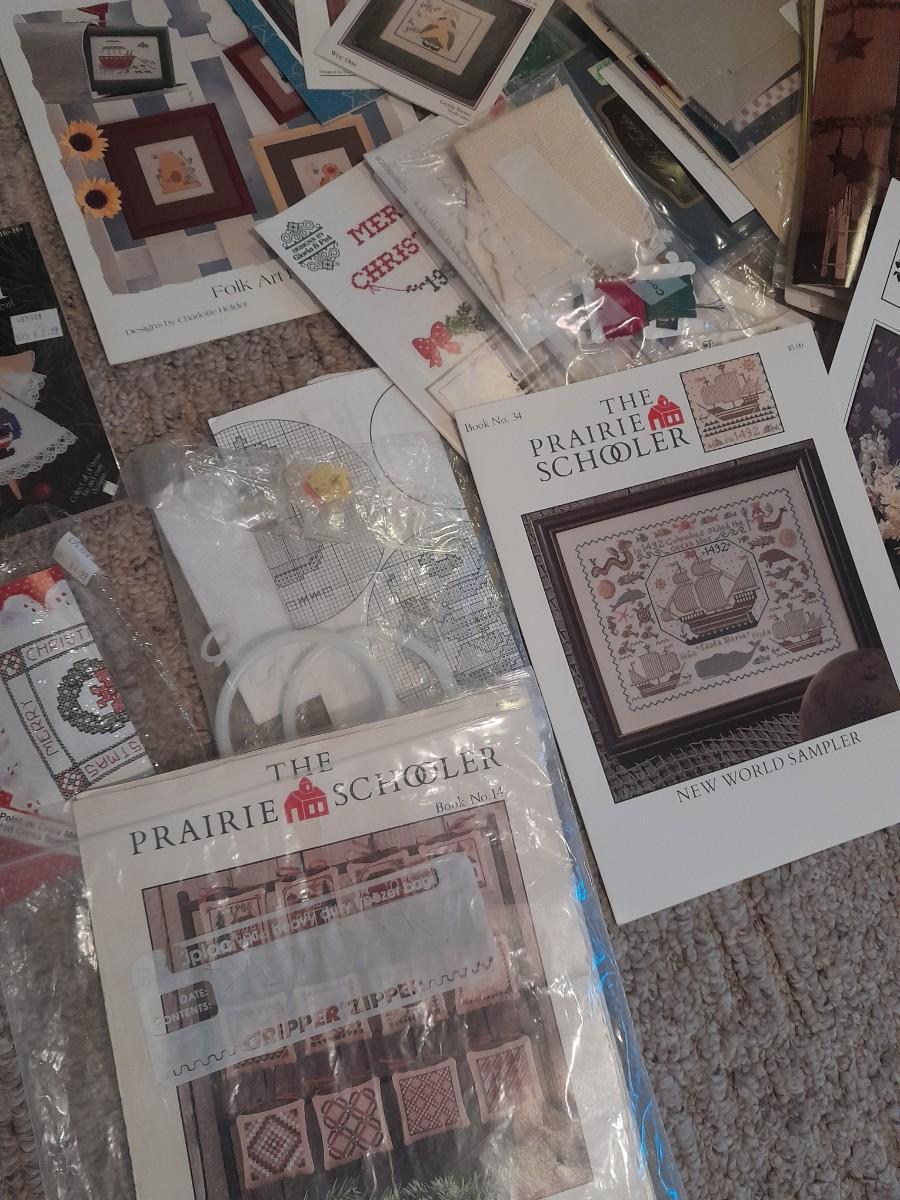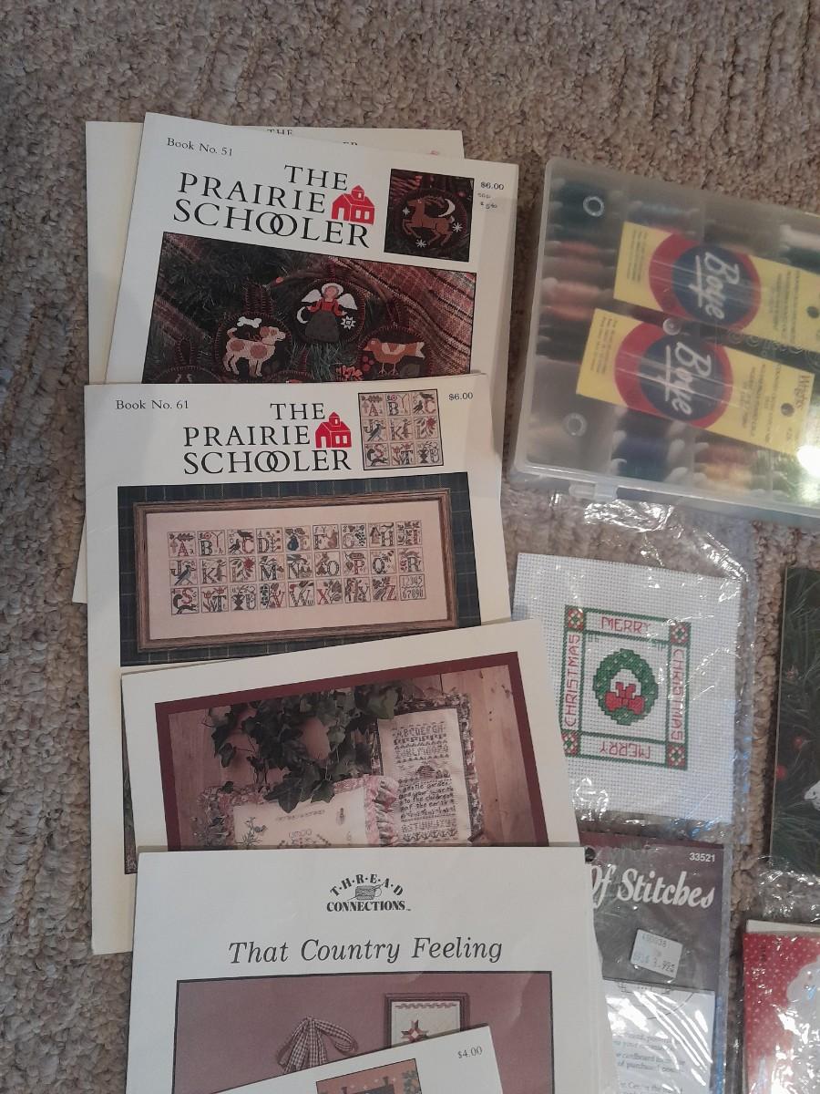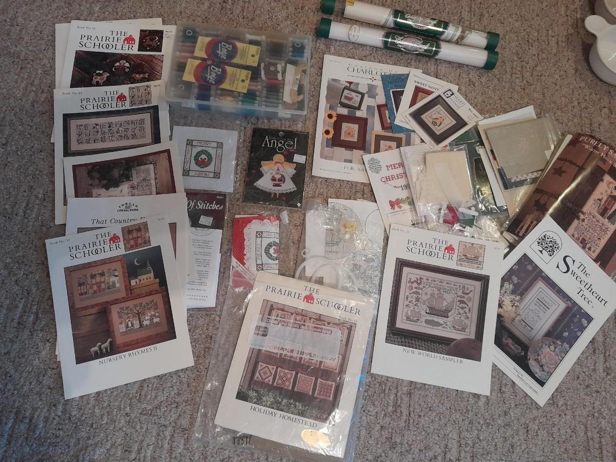 ORGANIZER FULL OF THREAD, CROSS STITCH BOOKLETS, PATTERNS, AND ROLLS OF CANVAS