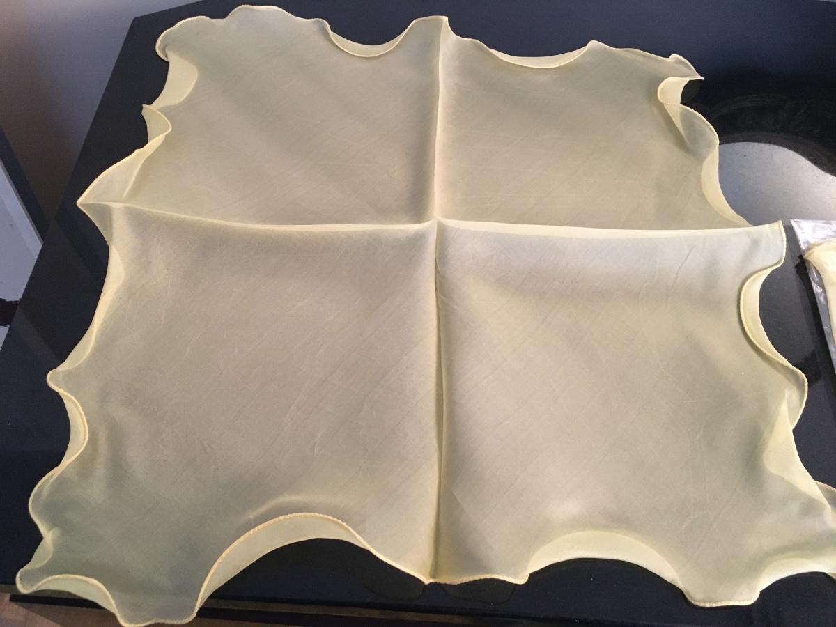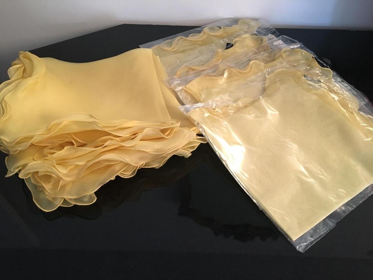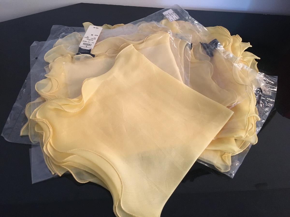 Beautiful flutter edged organza placemats/napkins. 9 opened, 5 new in package.