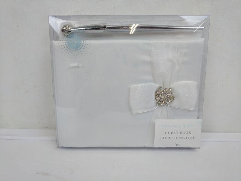 Organza White Guest Book W/Rhinestones & Bow W/Pen - New