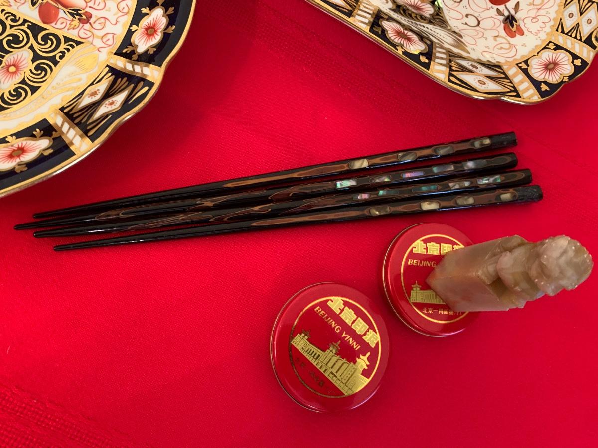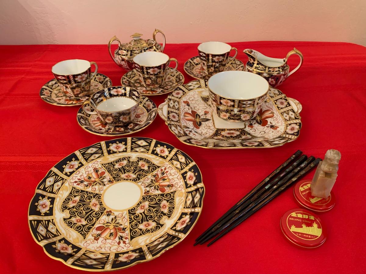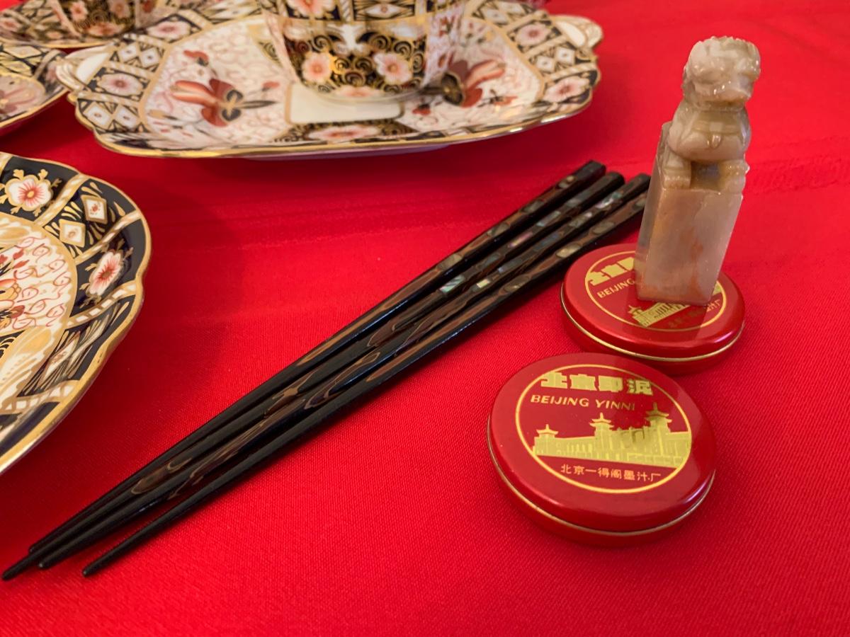 Set of Royal Crown Derby China from England, inlay chopsticks and foo dog carved stone ink stamp