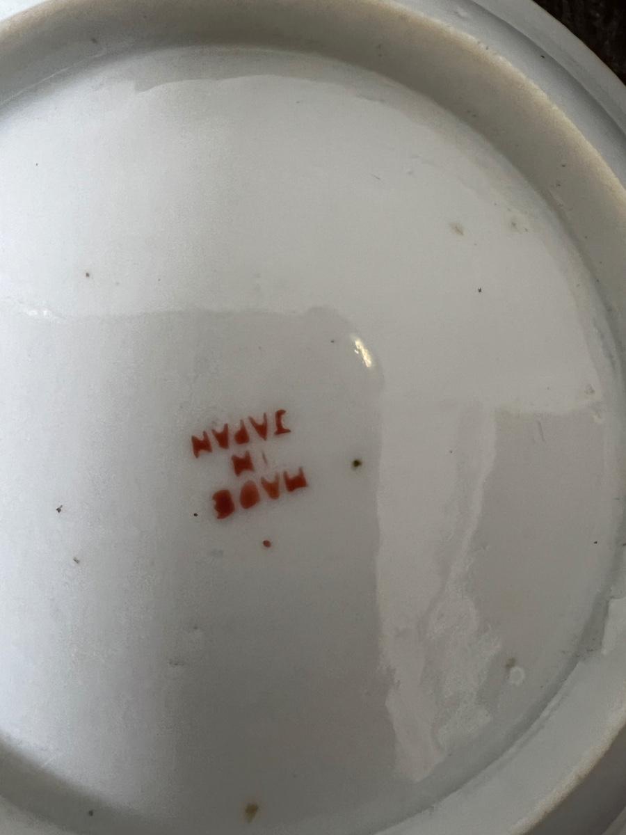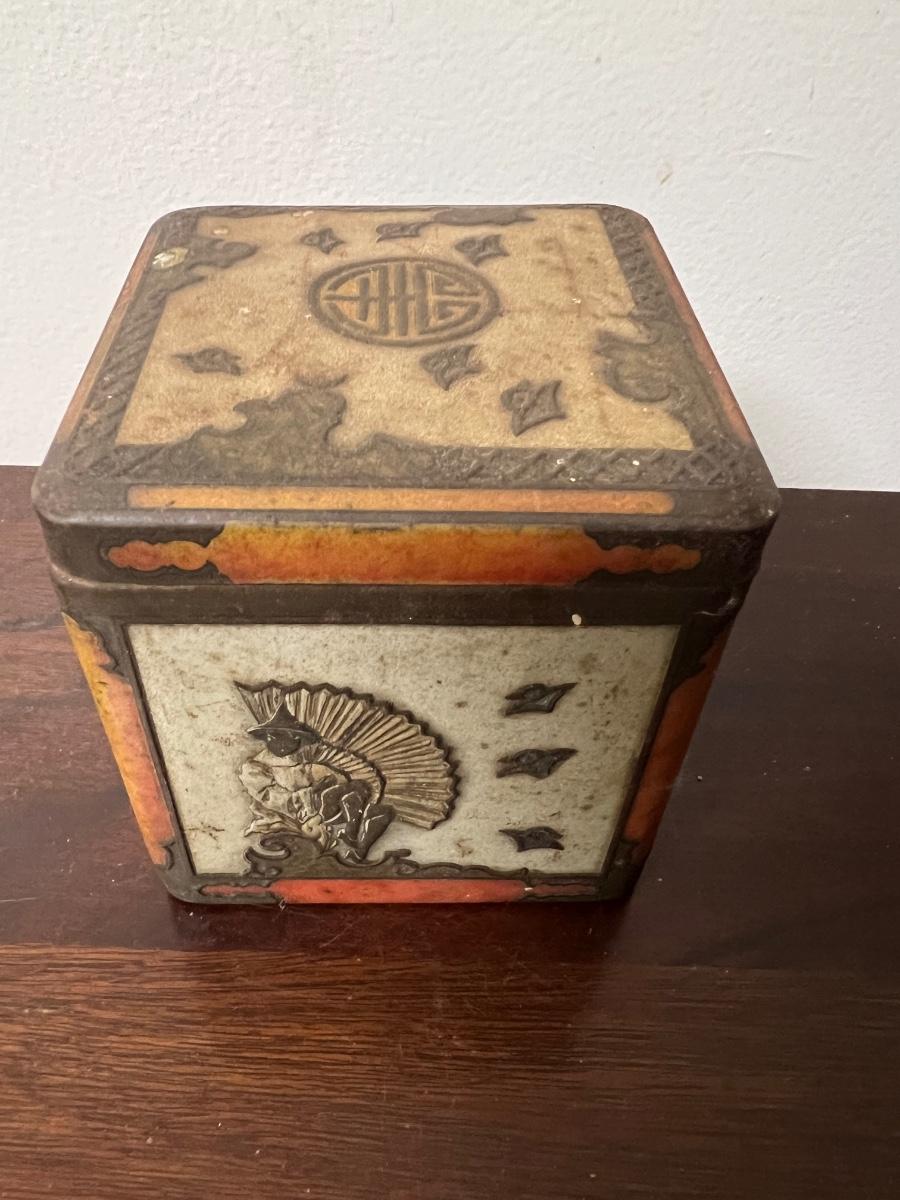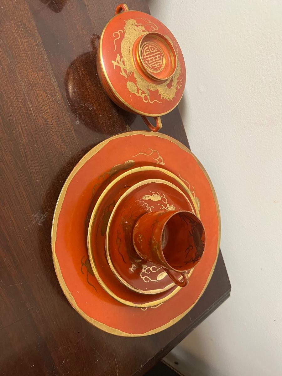 Oriental dishes & tin tea box, a couple of rust dishes have small chips, see photos
