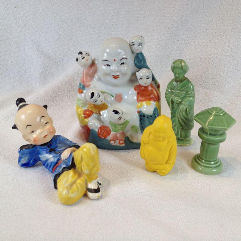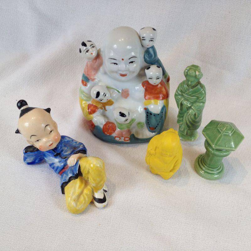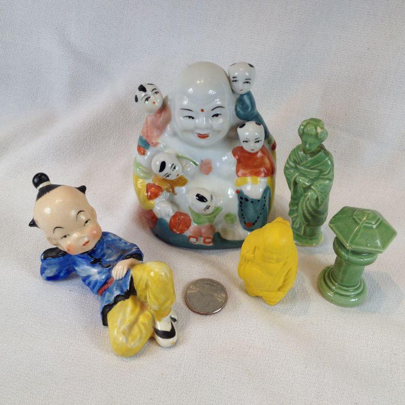 This is a grouping of 5 oriental figurines. The reclining china boy has a factory mold crack at ankle which doesn't go all the way through - he is marked Made in Occupied Japan. The miniature Geisha lady has a small chip on her base. All others are in very good condition.