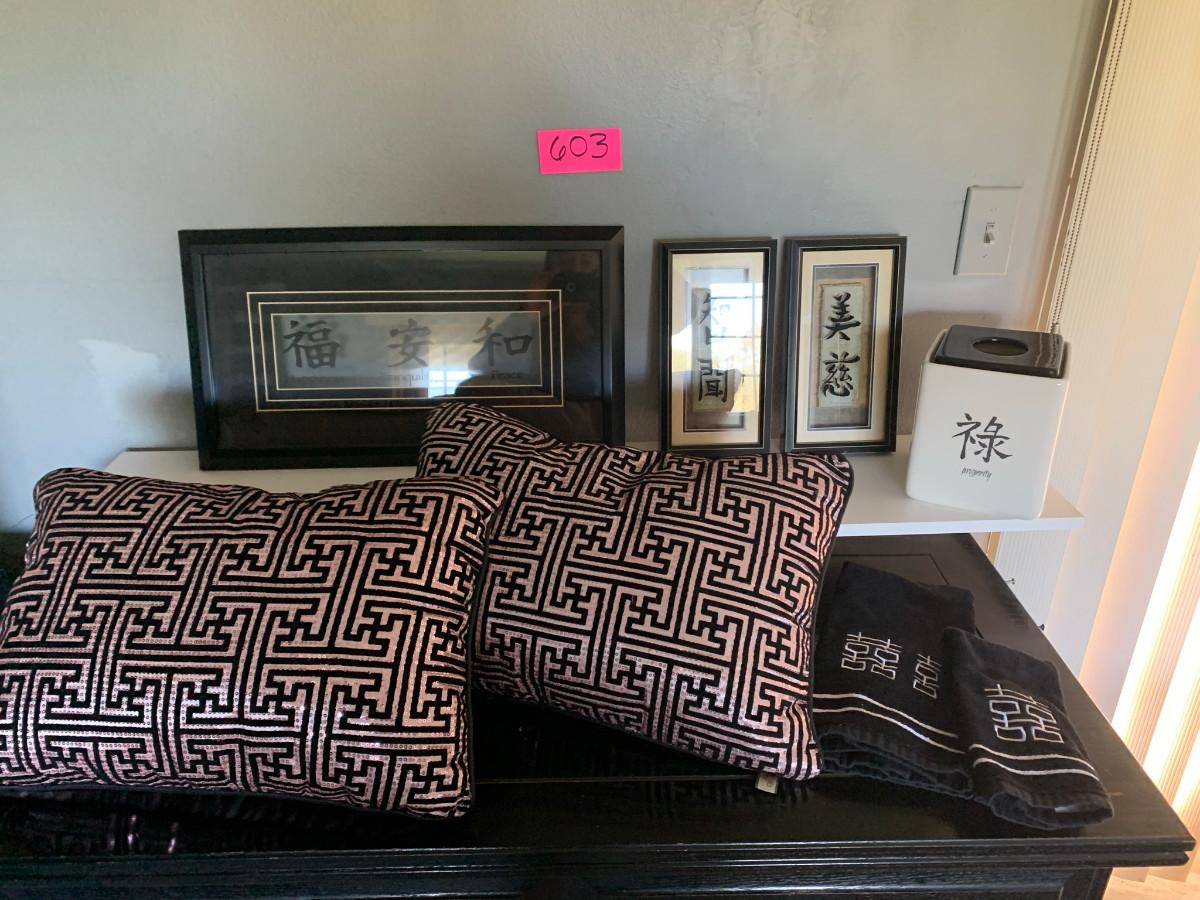 8 items total 3 pictures 1 kleenex container glass, 2 towels, and 2 pillows