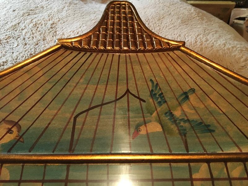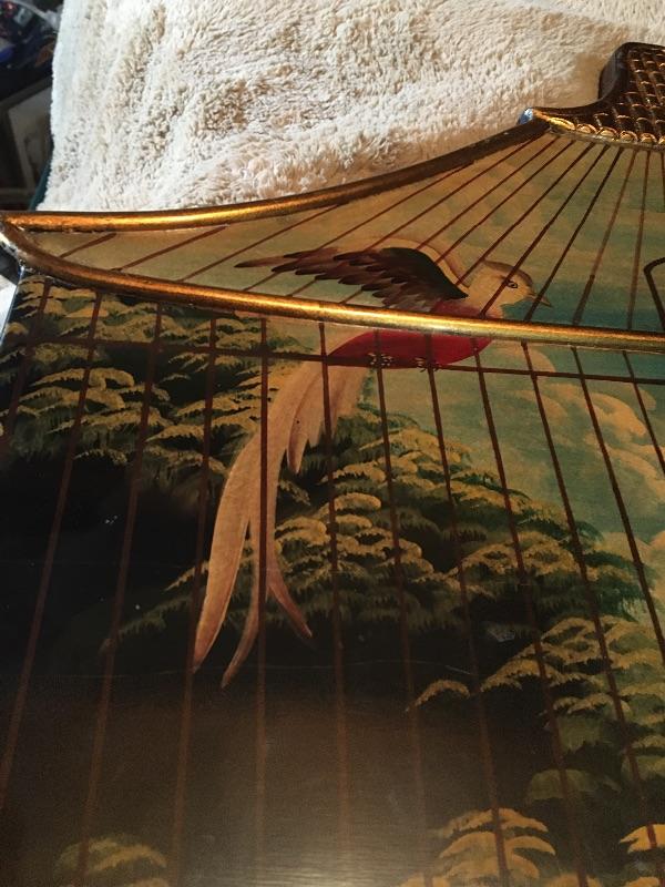 Oriental Lacquer Wall Hanging with Birdcage and Parrotts 26” x 43”. LOT 48